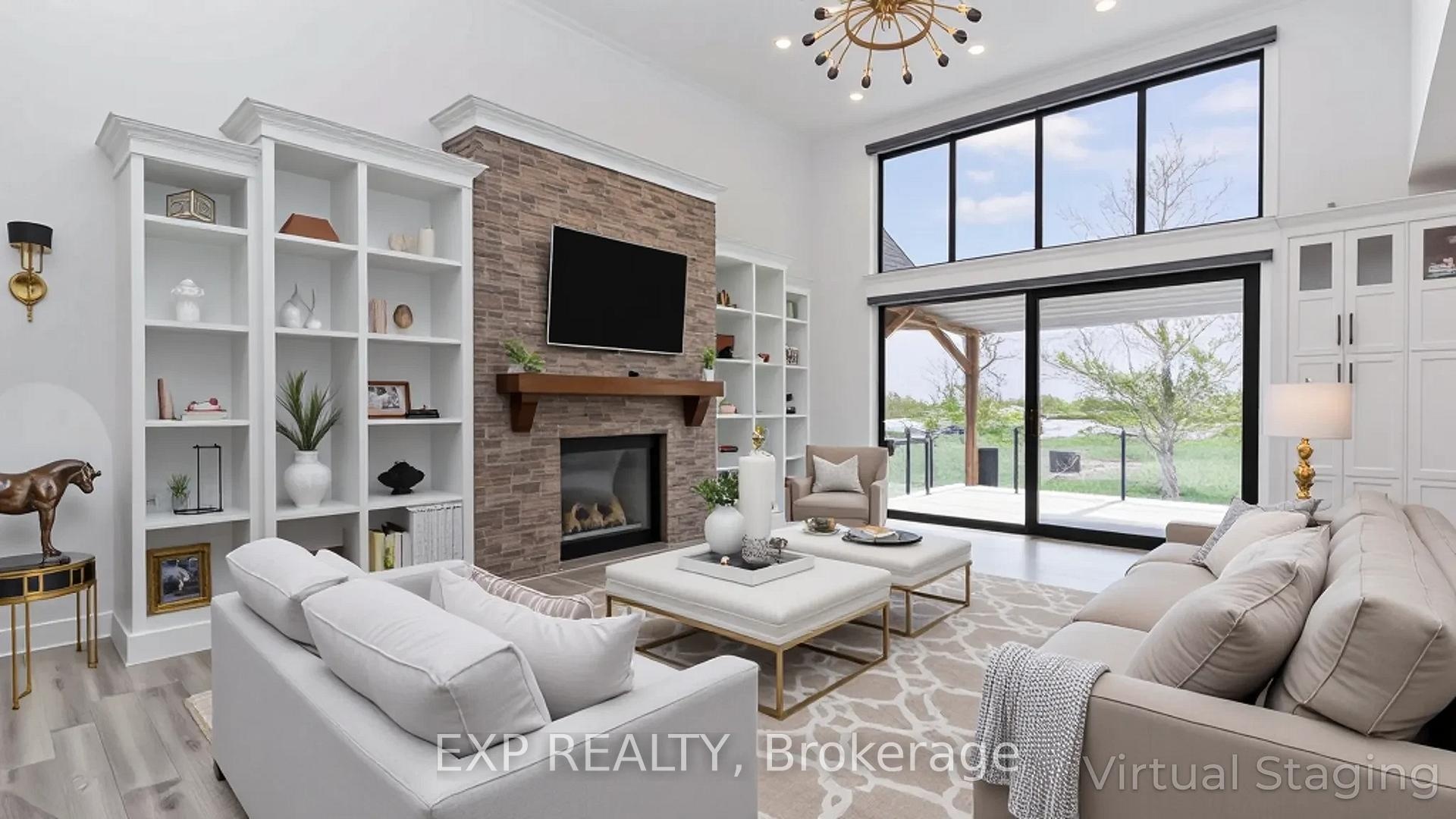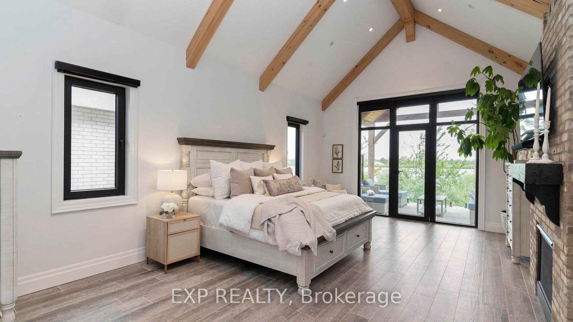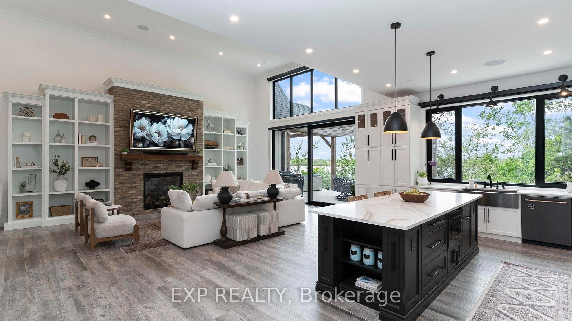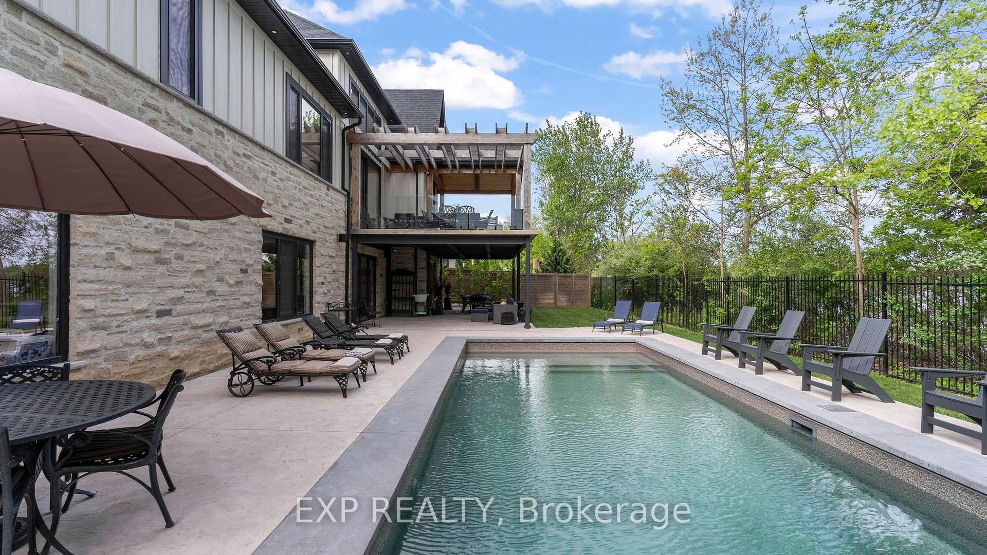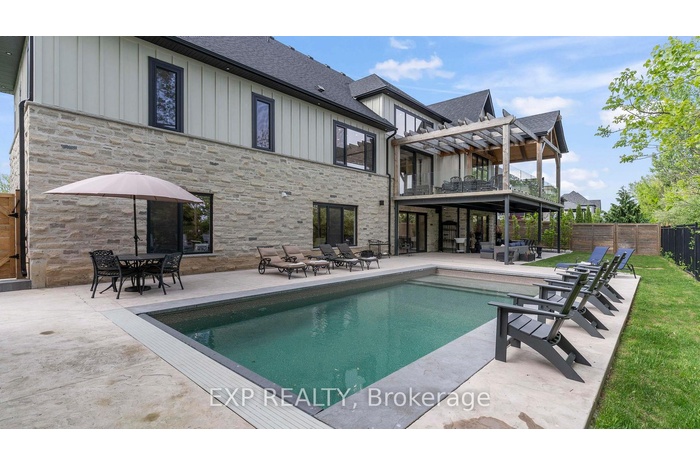 Welcome to Bella Lago Estates - an exclusive community featuring 29 custom homes situated on a quiet cul-de-sac. This stunning bungaloft showcases exceptional craftsmanship and timeless design from the moment you arrive. The over-grouted stone façade, curved concrete driveway, landscaped garden walls, and landscape lighting create an impressive and inviting first impression. The attached 3.5-car garage with keyless/fob entry adds both convenience and functionality.Inside, the thoughtfully designed open-concept layout offers a perfect blend of style and comfort. Heated floors span all three levels, and a built-in sound system enhances daily living from morning to night. The kitchen features a grand centre island and seamlessly opens to the 16-ft family room with custom built-ins and a brick fireplace - ideal for entertaining or relaxing with family. Expansive 14-ft sliding patio doors lead to your private outdoor retreat. Enjoy the stamped concrete terrace, pergola, and saltwater pool, all set against tranquil pond views. The fully fenced yard offers ample space for recreation, while the cabana with lighting creates the perfect setting for evening gatherings.The primary suite offers beamed cathedral ceilings, a fireplace, patio access, and a luxurious ensuite with a freestanding tub, double vanities, rain shower, and walk-in closet. Two additional bedrooms with custom walk-in closets, an office, and a mudroom with a dog shower complete the main level.The walkout lower level adds even more living space, featuring a full gym, theatre area, wet bar, guest suite, bonus room, two bathrooms, cold cellar, and abundant storage. European windows, upgraded insulation, and a full security system contribute to the home's efficiency and peace of mind. Experience refined living in a sought-after community - where thoughtful design and modern amenities come together in perfect harmony.