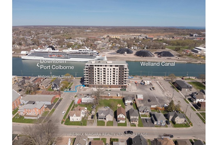 SouthPort Condos offers an unbeatable spot along Port Colborne's historic West Street, overlooking the Welland Canal. This exclusive 2-bedroom, 2-bathroom condo sits on the main floor and is the only residential unit on that level. This means you have added privacy and a quiet, one-of-a-kind setting. This unit has a bright, open layout, two ensuite bathrooms and in-suite laundry. Step outside to your expansive wrap-around terrace, perfect for enjoying ground-level views of the canal and the energy of West Street.Two exclusive parking spots add to the ease of everyday living, while local favourites like Pie Guys Bakery are just steps away. Explore Port Colborne's charming cafes, boutique shops, and waterfront paths, or head a few minutes down the road to Sugarloaf Marina, HH Knoll Park, sandy beaches, and nearby golf courses. With Niagara Falls, St. Catharines, and the Peace Bridge only a short drive away-and Oakville or the GTA just over an hour-this condo offers a lifestyle that's both relaxed and well-connected.