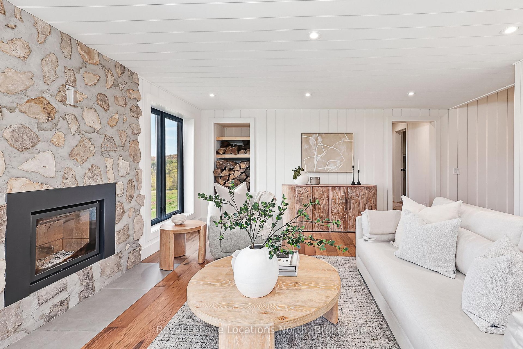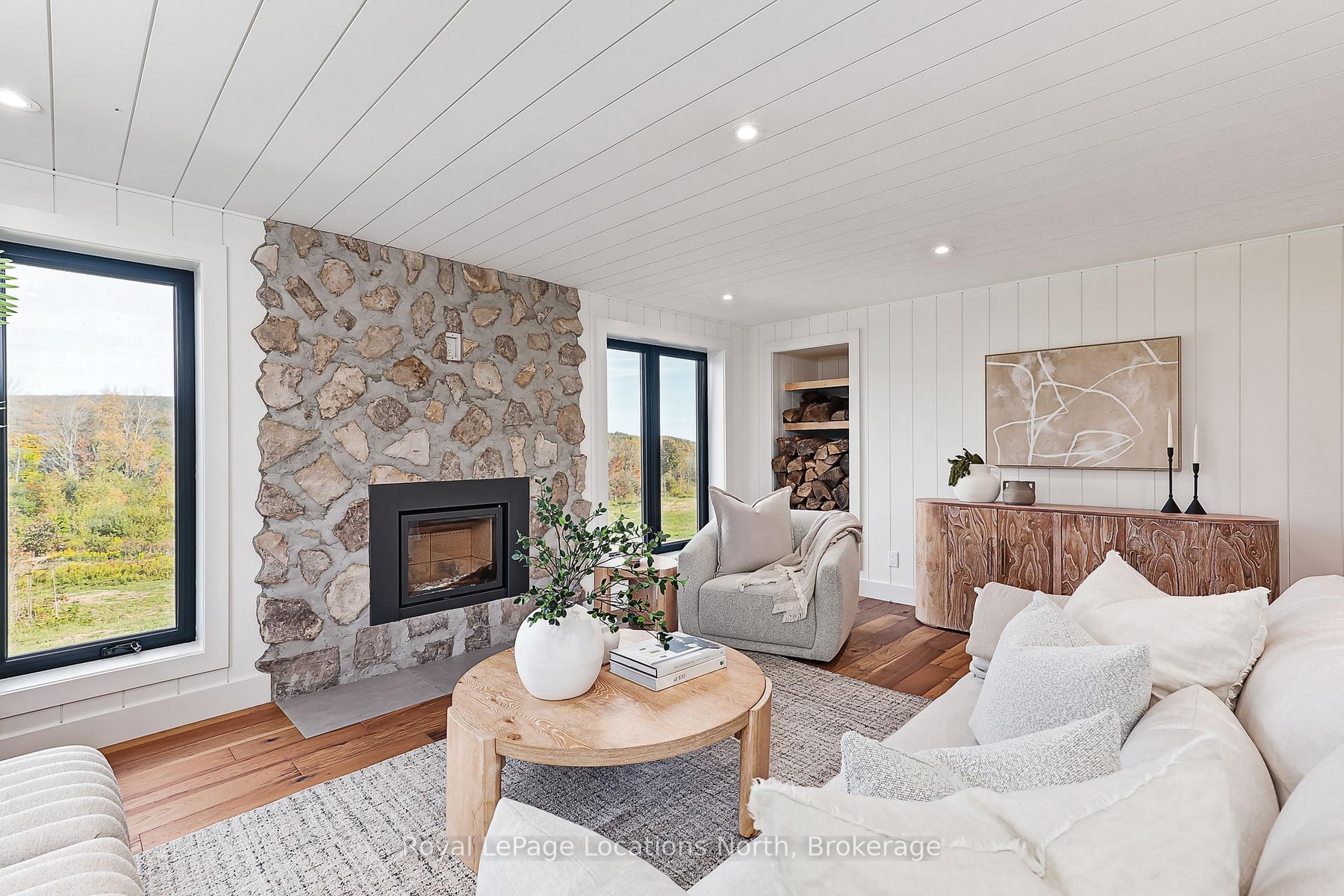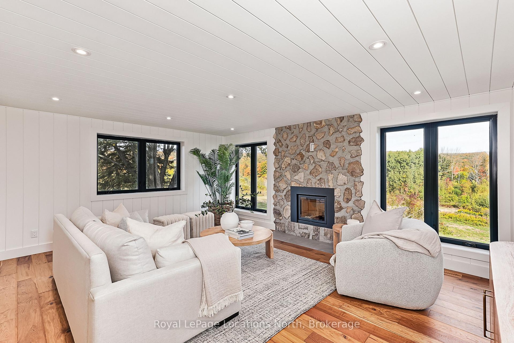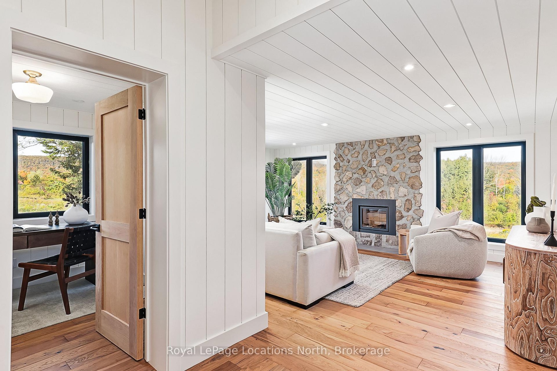 A Serene Retreat in the Heart of Pretty River Valley. Set amidst the stunning landscape of the Pretty River Valley, this extraordinary property offers over 49 acres of pure tranquility. Completely reimagined inside and out, it blends the timeless charm of country living with the sophistication and comfort of a brand-new home. Here, privacy, panoramic views and a deep connection to nature come together to create an exceptional rural escape. Step inside to a bright and inviting open-concept main floor, where expansive windows fill the home with natural light. The chef-inspired kitchen features a large island, luxury appliances, a walkout to the deck and a dedicated prep room-perfect for entertaining. The warm and welcoming living room, centered around a stone wood-burning fireplace, provides the ideal spot to relax and enjoy the ever-changing beauty of each season. The main floor primary suite is a private haven, offering a spa-like ensuite, walk-in closet and walkout to the deck overlooking the breathtaking Pretty River Valley. Thoughtful details such as hardwood flooring, pot lights, shiplap accents and custom textures elevate the home's modern country aesthetic. A main floor office and laundry room add everyday convenience. Upstairs, two spacious bedrooms and a stylish three-piece bathroom offer comfort and privacy for family or guests. The finished lower level extends the living space with a generous family room and walkout to a covered patio, a full bathroom, and a versatile extra room ideal for a bedroom, den, or home theatre. Outdoors, discover your own private paradise with trails, a waterfall and acres of natural beauty to explore-perfect for hiking, snowshoeing and quiet reflection. A detached triple garage/shop provides ample room for vehicles, equipment, or hobbies. Located just minutes from Blue Mountain, Collingwood, ski clubs and golf courses, this exceptional property is the ultimate four-season retreat.