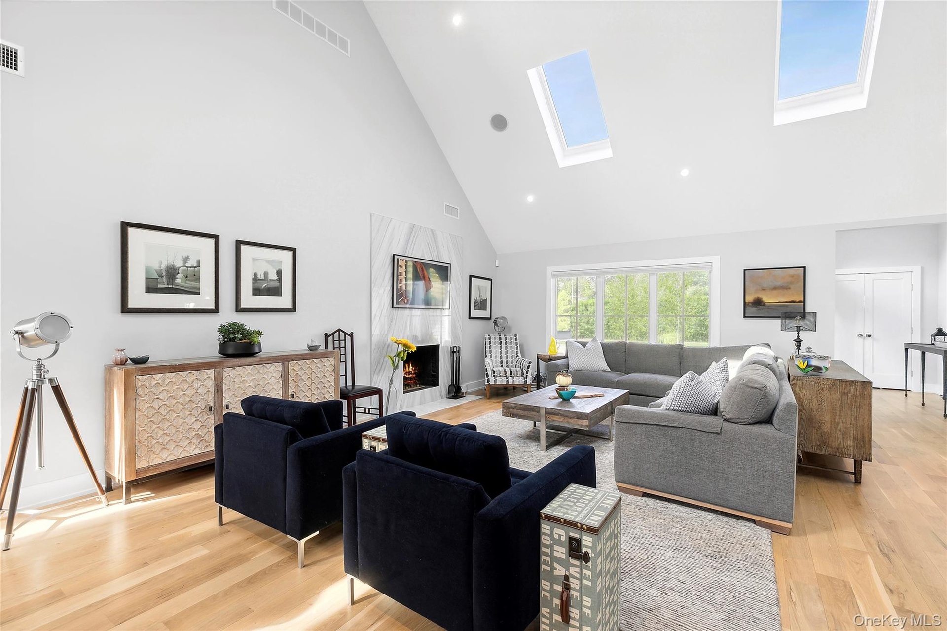 - Living area featuring high vaulted ceiling, a skylight, light wood finished floors, recessed lighting, and a large fireplace
