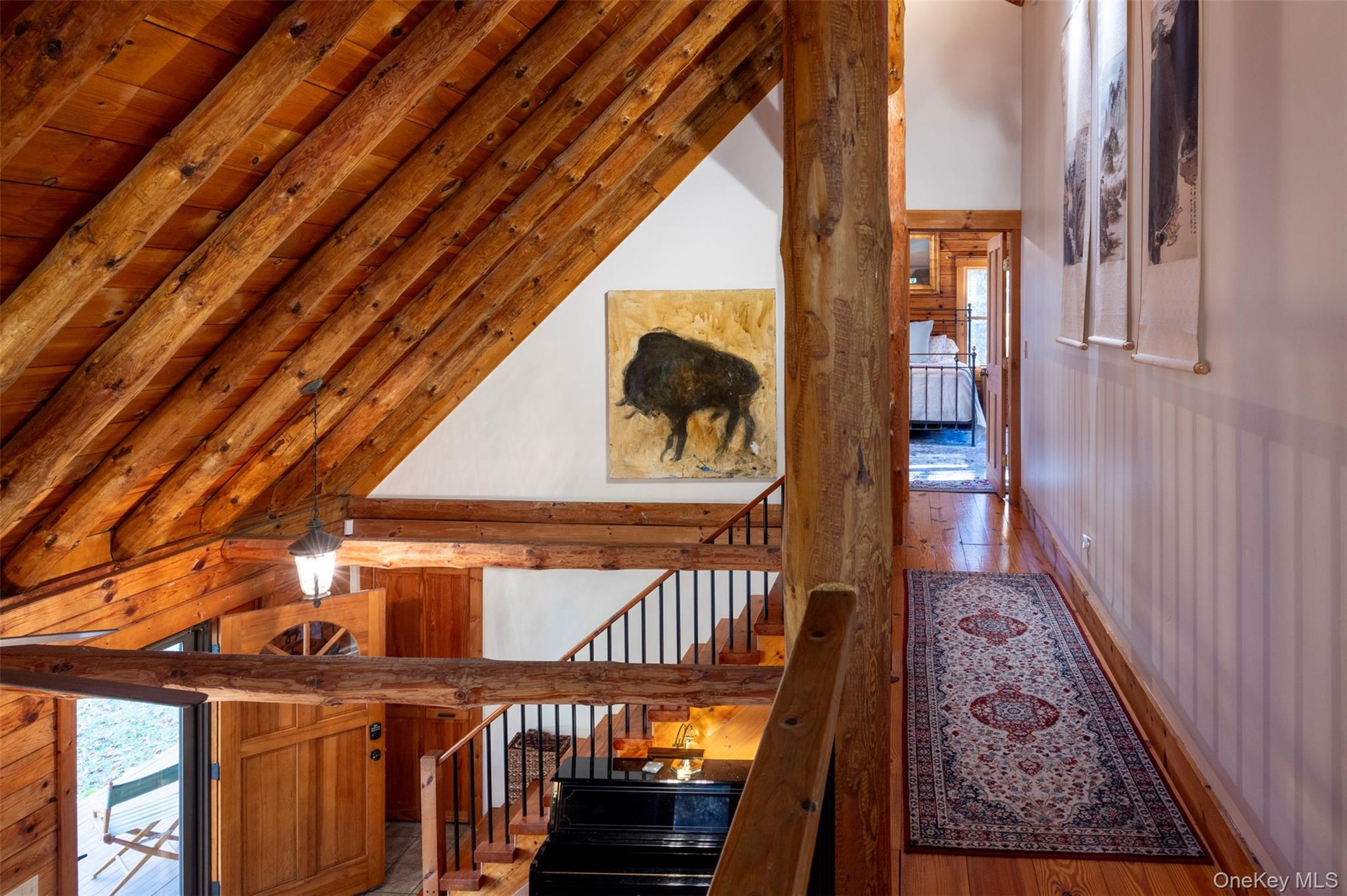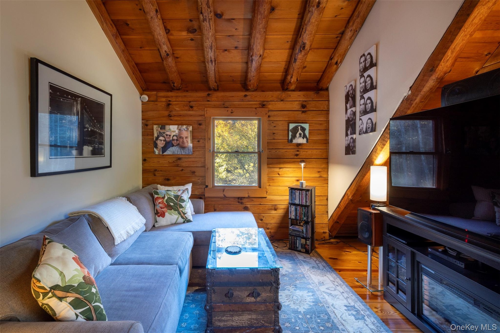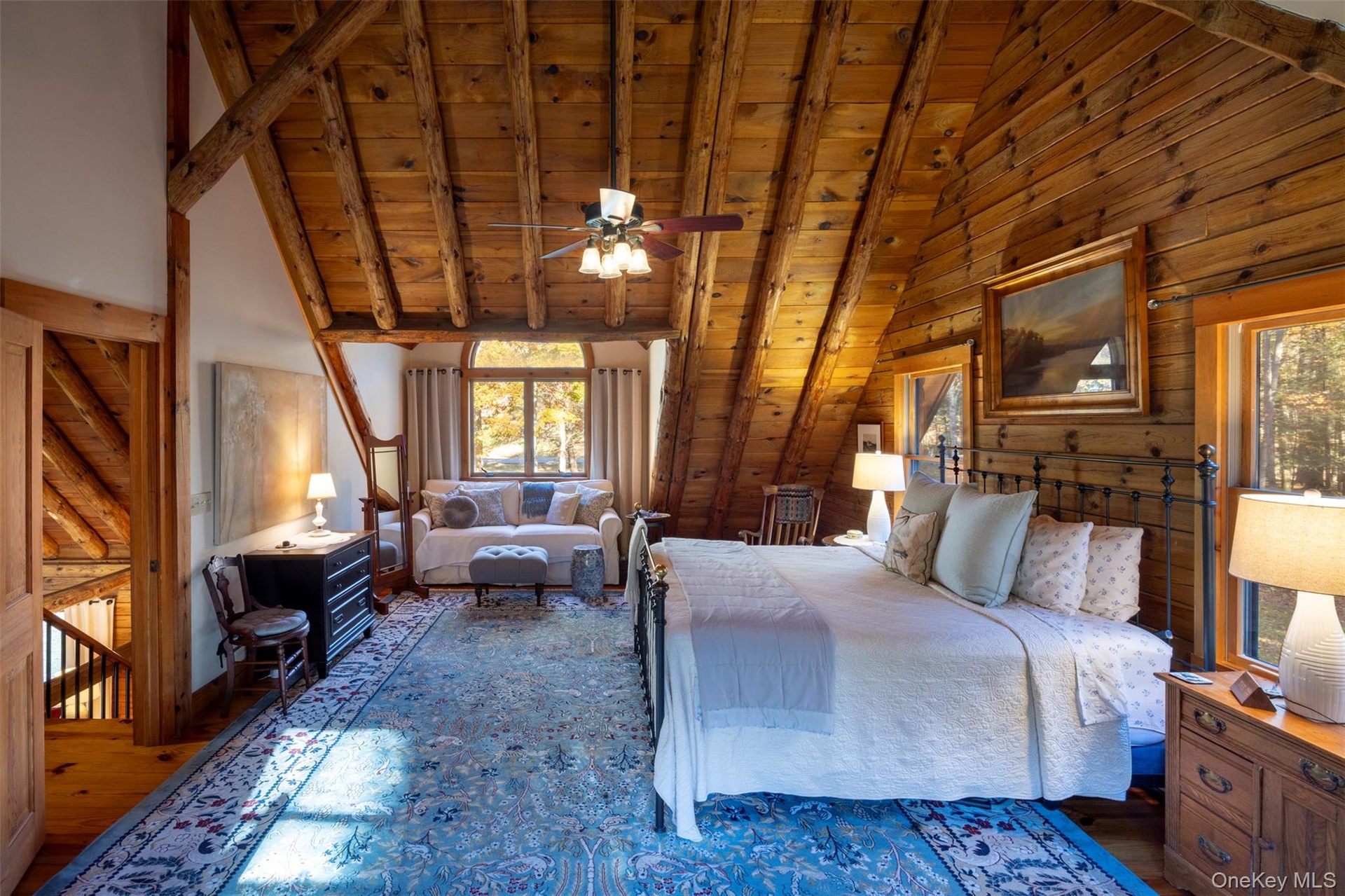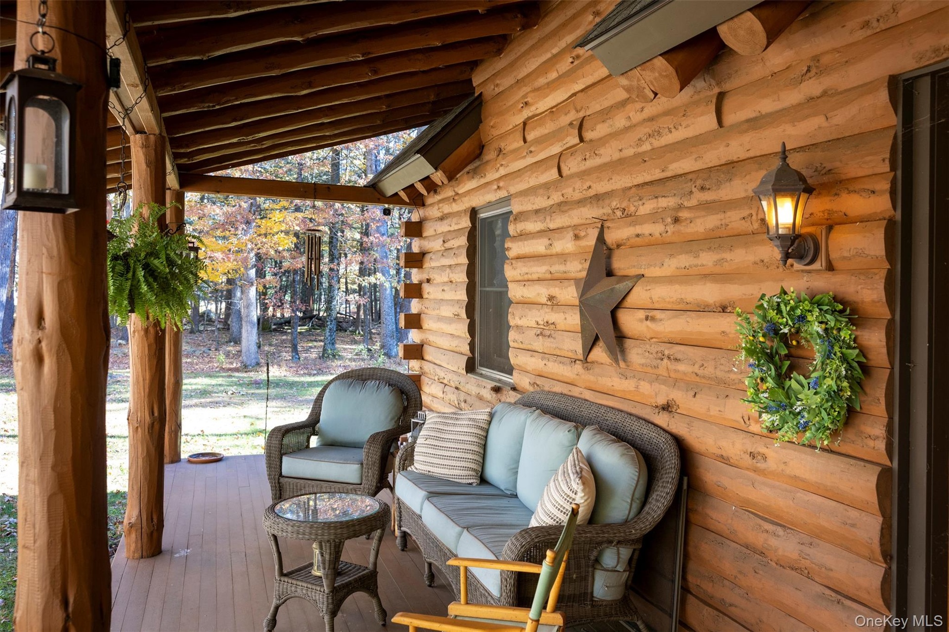 Nestled at the base of the Ashokan High Point mountain, one of the Catskills' most scenic peaks, this beautifully appointed, rustic 5.7-acre retreat is set back generously from a quiet country road just minutes from the Ashokan Reservoir. Custom built in 2000, the stylish, move-in-ready home features multiple great spaces for gathering with friends and family, both inside and out, starting with the deep end-to-end-covered verandah in front and the even larger blue-stone patio in back. Inside, the house features a dramatic living room with a fireplace and double-height beamed ceiling, all visible and open to the sunny dining room and conveniently laid-out kitchen with adjoining laundry room, half bath and spacious 2-car garage. The main level also features 2 cozy bedrooms and a newly renovated full bathroom with radiant-floor heating and a custom glass-enclosed rain shower. Upstairs, the enormous and sunny primary suite features a cathedral ceiling, windows on 3 exposures, seating and work areas, a walk-in closet plus a stunning new en-suite bathroom with open shower, soaking tub and radiant-floor heating. And just down the open hallway overlooking the living room is a TV or reading loft with 5-point sound also suitable for a home office. If more at-home work space is required, the semi-finished basement features no less than 2 offices, a sound-recording booth, a pellet stove and plenty of additional room for storage and hobbies. Out back, the wooded and completely private back yard has a large bluestone patio with room for separate gathering and dining areas, a covered grilling area and, beyond, a fire pit, hammock and spacious storage shed. Other recent upgrades include an owned (not leased) Sol-Ark 22-amp rooftop solar array and system that has reduced standard monthly electric bills for the current owners dramatically; it also acts as a whole-house generator during power failures. Inside and out, the vibe here is warm, relaxing and ready-to-enjoy, when you're not hiking the nearby trails and reservoir, or enjoying Woodstock and the many other attractions that have made Olivebridge one of the hottest destinations in the Hudson Valley.