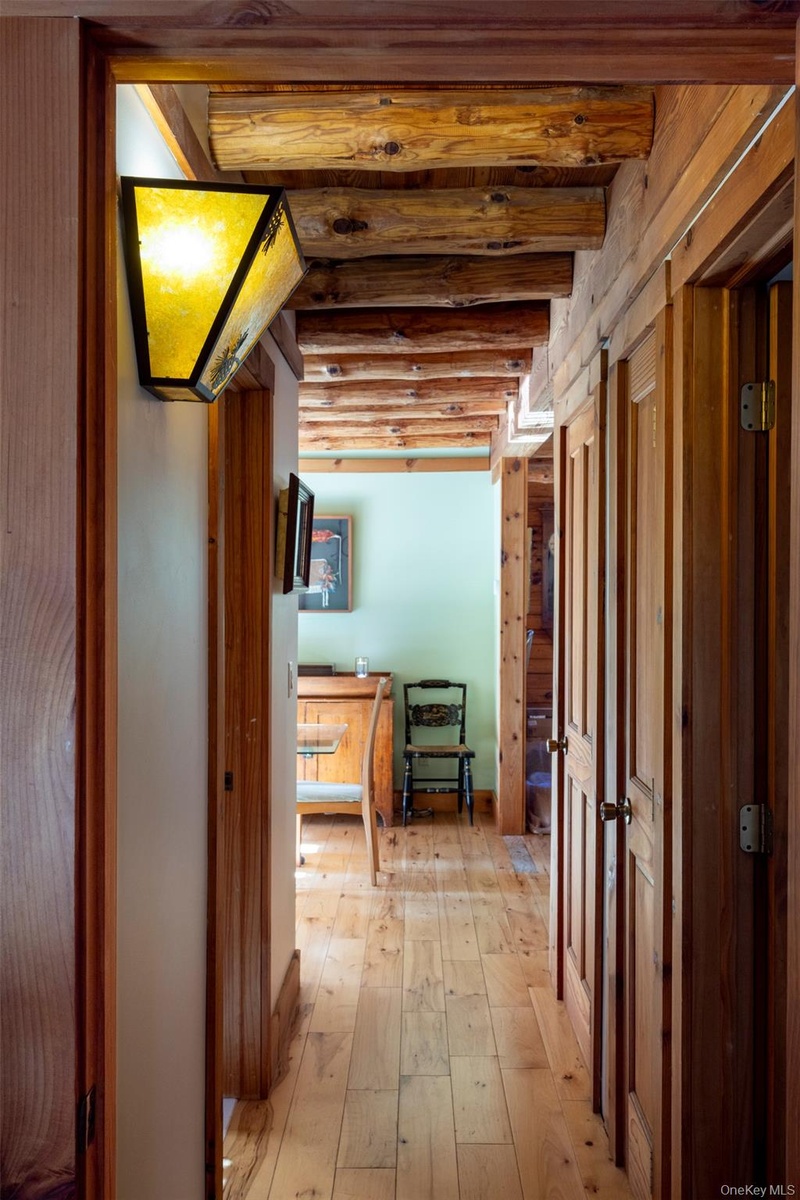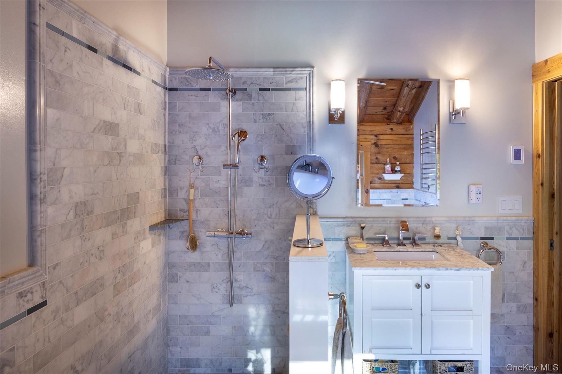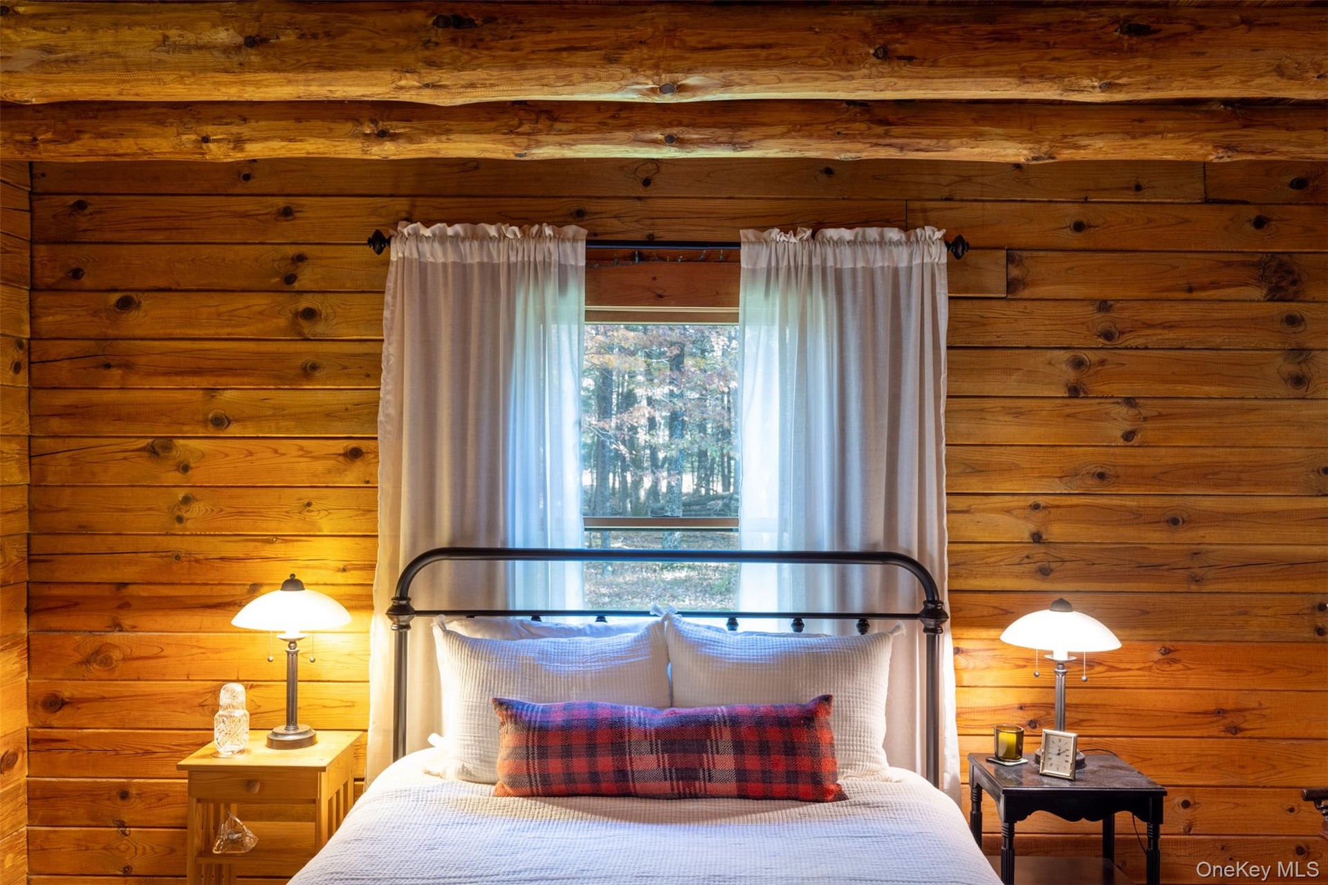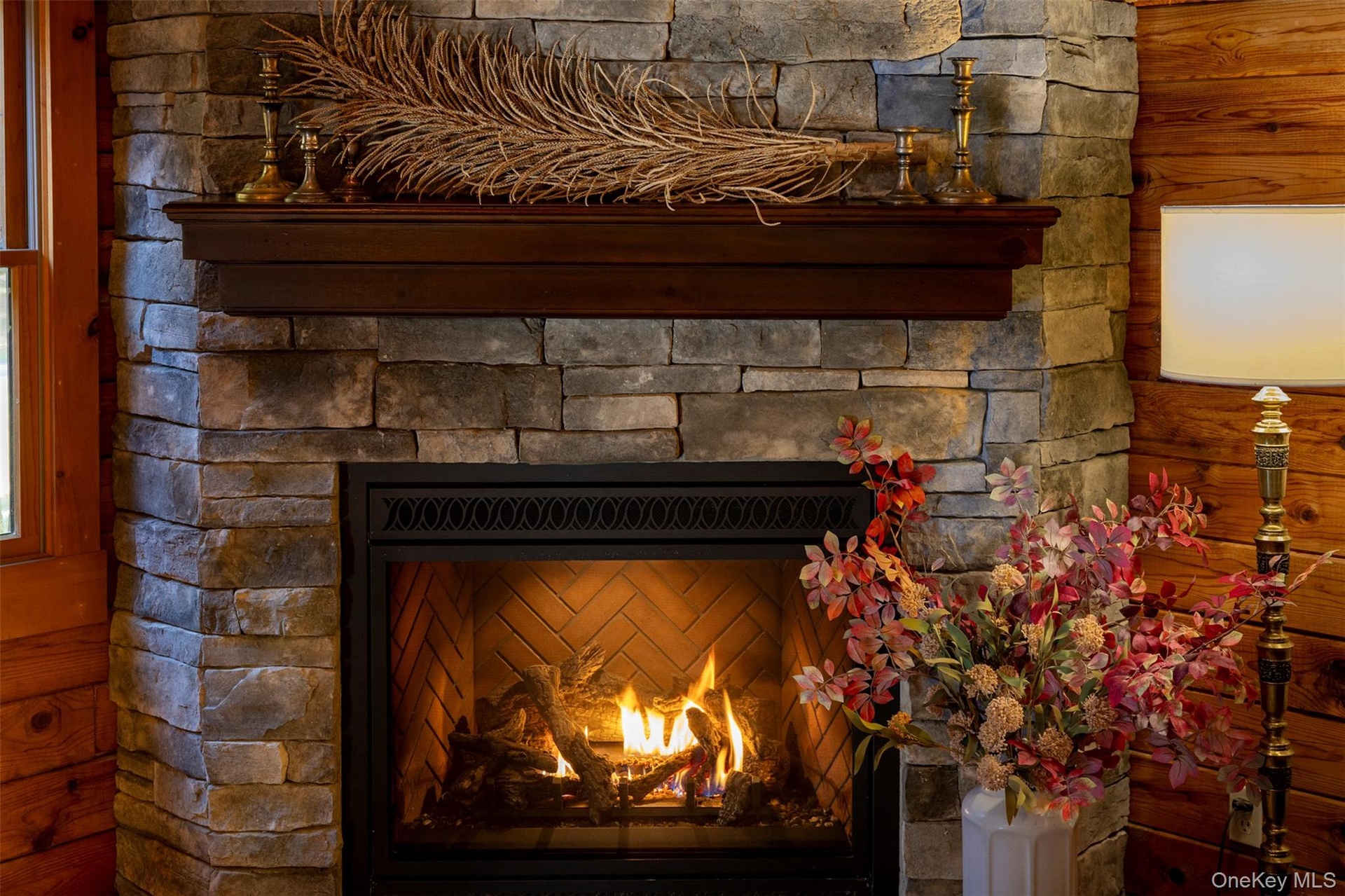 Nestled at the base of the Ashokan High Point mountain, one of the Catskills' most scenic peaks, this beautifully appointed, rustic 5.7-acre retreat is set back generously from a quiet country road just minutes from the Ashokan Reservoir. Custom built in 2000, the stylish, move-in-ready home features multiple great spaces for gathering with friends and family, both inside and out, starting with the deep end-to-end-covered verandah in front and the even larger blue-stone patio in back. Inside, the house features a dramatic living room with a fireplace and double-height beamed ceiling, all visible and open to the sunny dining room and conveniently laid-out kitchen with adjoining laundry room, half bath and spacious 2-car garage. The main level also features 2 cozy bedrooms and a newly renovated full bathroom with radiant-floor heating and a custom glass-enclosed rain shower. Upstairs, the enormous and sunny primary suite features a cathedral ceiling, windows on 3 exposures, seating and work areas, a walk-in closet plus a stunning new en-suite bathroom with open shower, soaking tub and radiant-floor heating. And just down the open hallway overlooking the living room is a TV or reading loft with 5-point sound also suitable for a home office. If more at-home work space is required, the semi-finished basement features no less than 2 offices, a sound-recording booth, a pellet stove and plenty of additional room for storage and hobbies. Out back, the wooded and completely private back yard has a large bluestone patio with room for separate gathering and dining areas, a covered grilling area and, beyond, a fire pit, hammock and spacious storage shed. Other recent upgrades include an owned (not leased) Sol-Ark 22-amp rooftop solar array and system that has reduced standard monthly electric bills for the current owners dramatically; it also acts as a whole-house generator during power failures. Inside and out, the vibe here is warm, relaxing and ready-to-enjoy, when you're not hiking the nearby trails and reservoir, or enjoying Woodstock and the many other attractions that have made Olivebridge one of the hottest destinations in the Hudson Valley.