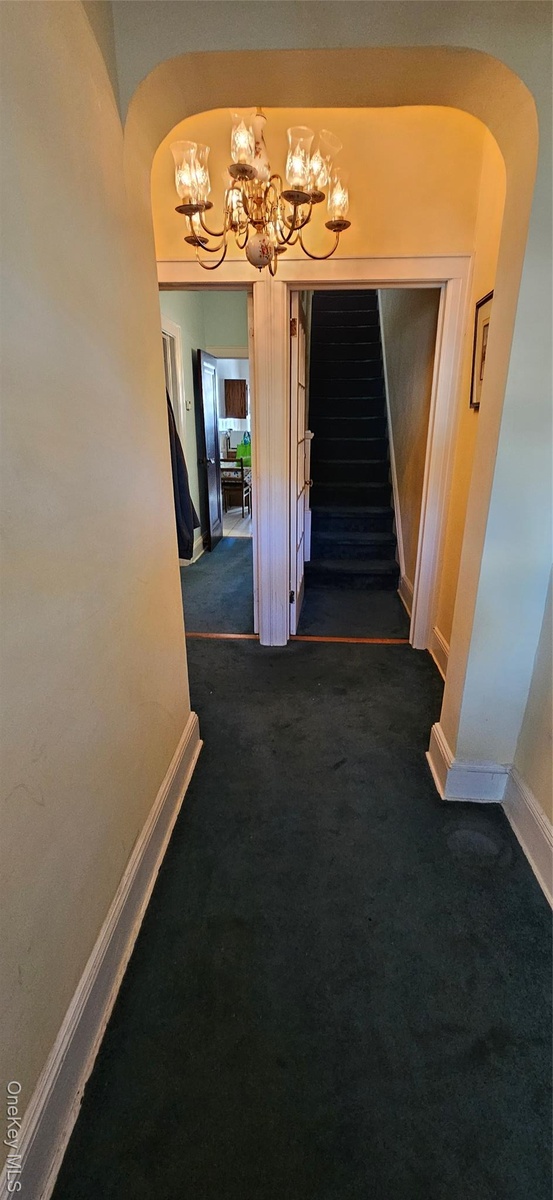 - Hall with arched walkways, dark carpet, stairs, and a chandelier