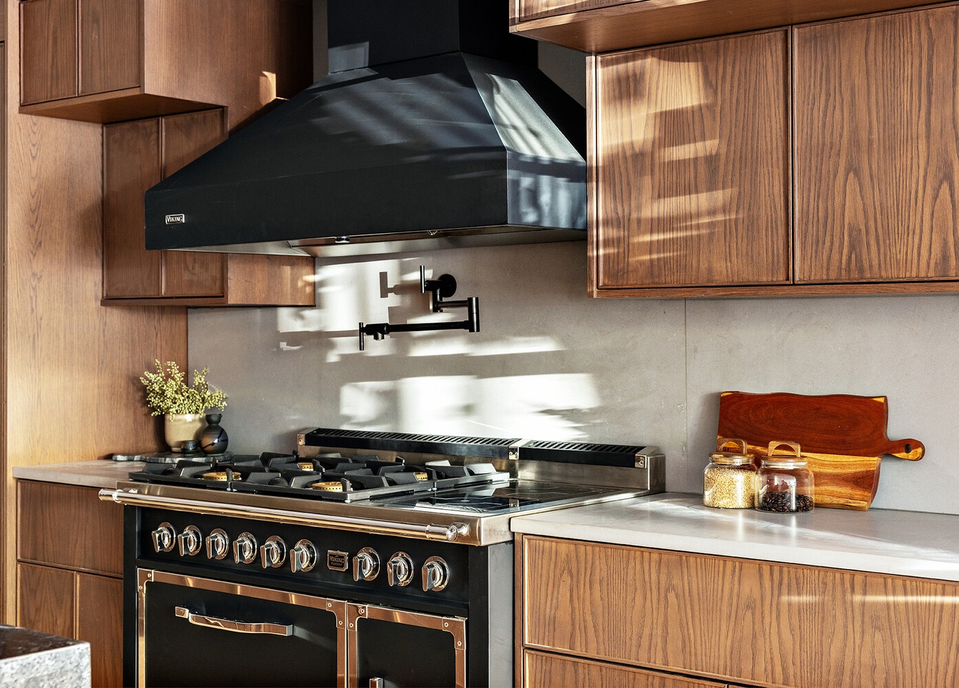 A second entrance on the Garden Level leads to a mudroom with a closet and flows into an expansive chef's kitchen and dining area with dual fireplaces, a powder room, and garden access. The kitchen is equipped with a huge eat-in island with a waterfall edge, sleek stone slab countertops custom walnut cabinetry, a wall-mounted pot filler, a walk-in pantry, and integrated premium appliances. Beyond the kitchen lies a tranquil garden room, a full bathroom, and a windowed laundry room. The tranquil paved garden is perfect for indoor and outdoor entertaining. Below this level is a cellar with additional storage space and building mechanicals.
