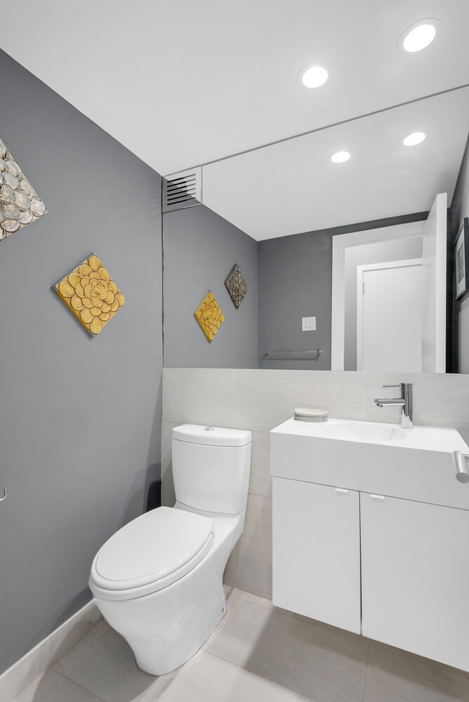 Enter through a proper foyer with double closet and a discreet powder room and proceed into the large open living space. The large dining area could easily accommodate a table for 10, and features a built-in bar/buffet, perfect for serving culinary delights and lively libations. The adjacent kitchen is a modernist wonder with sleek custom white cabinetry, high-end stainless steel appliances, beautiful white quartz countertops and a striking stainless steel mosaic backsplash, perfectly laid out to appeal to any chef. The dining area flows into the huge living room, affording plenty of space for oversized furnishings and a huge TV, with custom built-in cabinetry and a picture window affording perfect views of the river and bridge. An oversized closet affords additional storage space, or could be built-out to a home office if desired. The primary suite is exceptional, set off in its own wing and featuring a linen closet plus a huge walk-in closet, a large picture window ensuring plenty of light and more than ample space for a king sized bed, lounge area and more. The beautiful and cheerful en suite bathroom with glass enclosed soaking tub is the cherry on the sundae. As an extra feature, a washer-dryer could be added (subject to board approval).