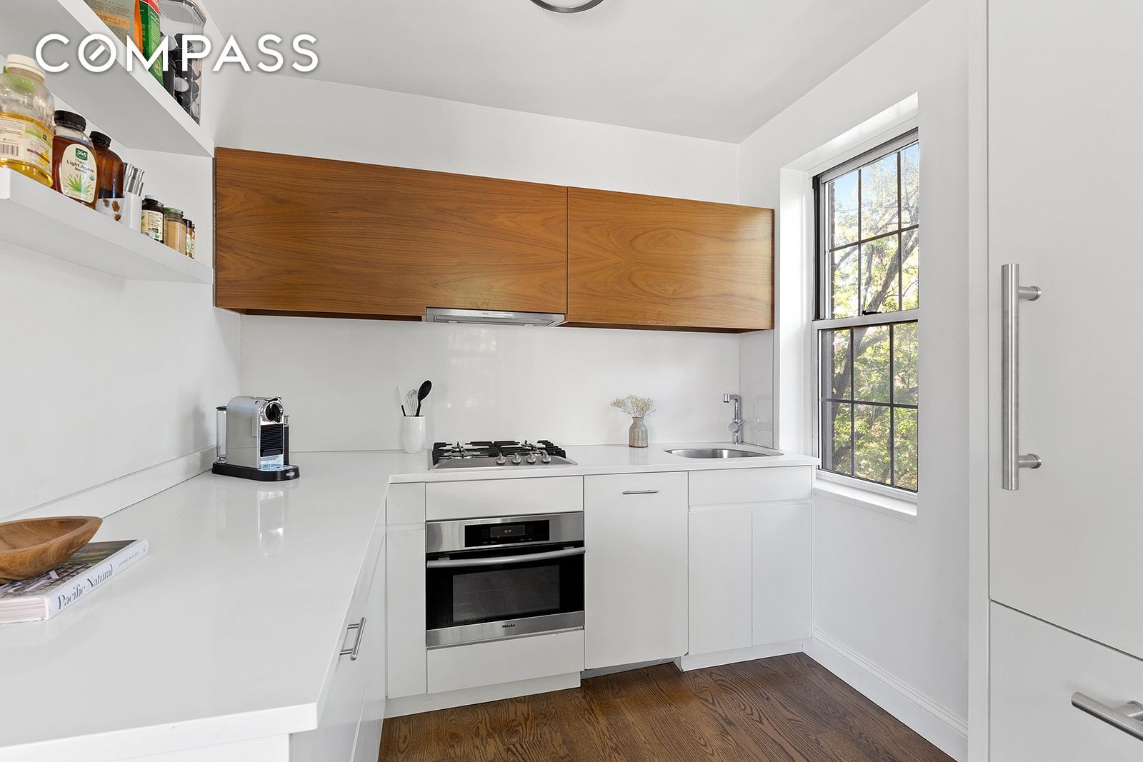 A spacious entry foyer opens to a sunken living room, creating an elegant flow and a sense of distinction between spaces. The windowed eat-in kitchen features multiple exposures, custom cabinetry, and top-of-the-line Sub-Zero and Miele appliances which is perfect for everyday dining or entertaining. The spacious bedroom is thoughtfully tucked away in its own private wing, with newly built in closets and sunlit western views, creating your own peaceful sanctuary. There is no lack of closet space which provides excellent storage and functionality for the new owner.