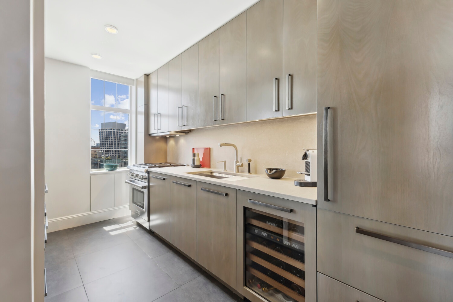 The chef's kitchen is a showcase of functionality and form, boasting a generous island breakfast bar, quartz countertops, and sleek wood cabinetry with under cabinet lighting. Outfitted with top-tier appliances-including a Sub-Zero refrigerator and wine cooler, Wolf gas range, Miele wall oven and dishwasher, and a warming drawer-this culinary space invites both serious cooking and casual enjoyment.