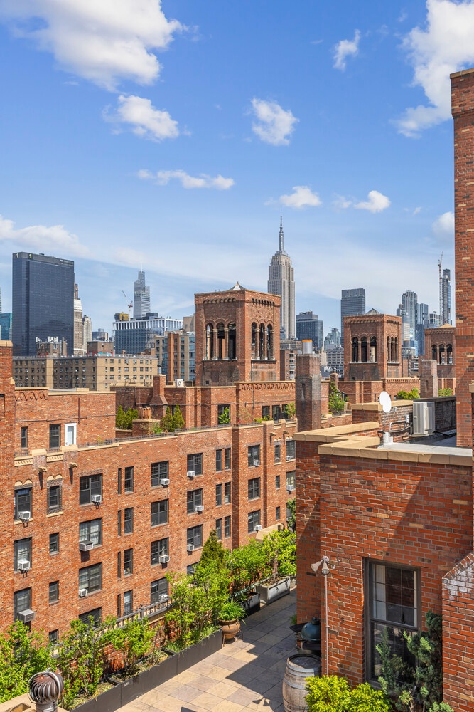 The expansive, 36-foot-wide living and dining area is ideal for both intimate evenings and grand entertaining. Anchored by a marble-clad, wood-burning fireplace, the great room features four oversized windows that frame breathtaking views of the Chelsea Historic District and the city skyline beyond. Adjacent, a separate dining area comfortably seats 8-12 guests beneath recessed lighting, offering the perfect ambiance for curated gatherings.