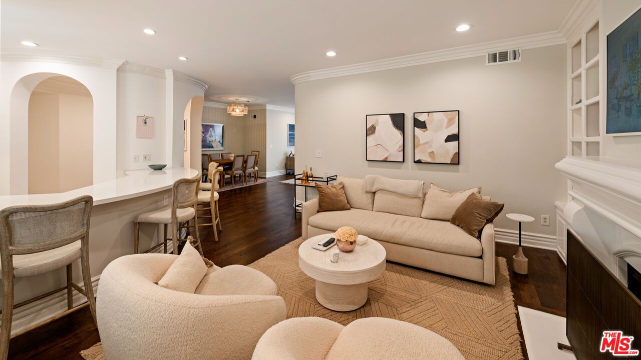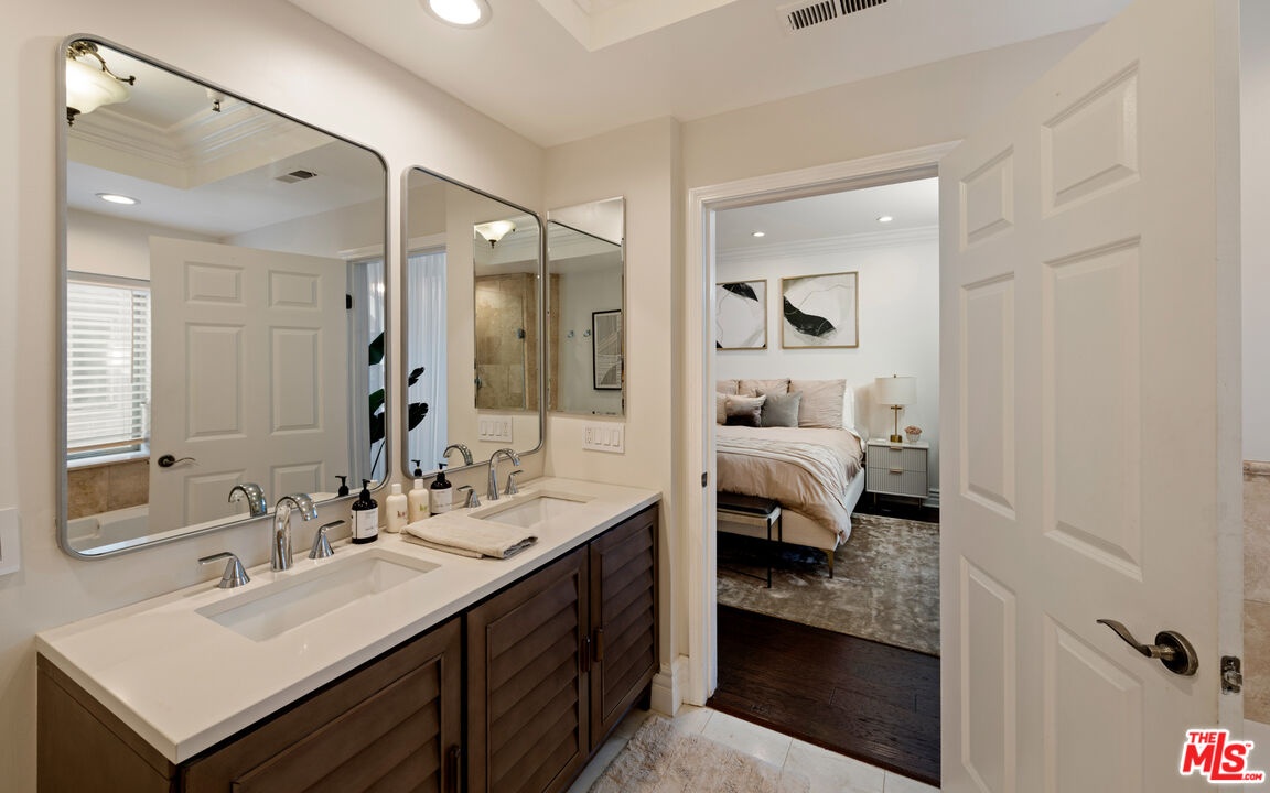 This beautifully appointed 2 bedroom, 2 bath, 1,569 sq. ft. condo sits on a quiet, tree lined street in one of West LA's most coveted neighborhoods. Recently remodeled, it blends the comfort of a 5 star hotel with the convenience of being just moments from Westwood Village and Century City.Set within a secure, newer-construction Mediterranean building, residents are welcomed through an elegant open-air courtyard with a charming fountain an immediate glimpse of the lifestyle within. Inside, a formal foyer opens to a spacious kitchen, family room, and living area designed for both everyday comfort and effortless entertaining. Two bedrooms are thoughtfully placed on opposite ends of the home, including a primary suite with abundant closet space, a spa-like bath with soaking tub, and direct access to the expansive covered patio. Every main room flows outdoors, creating a seamless indoor-outdoor experience perfect for morning coffee or evening gatherings.Rich hardwood floors, crown moldings, graceful arches, and beautifully restored tilework are enhanced by tall ceilings, natural light, and luxurious finishes.Residents enjoy a well-managed, secure community with gated underground parking (two tandem spaces plus guest parking). Whether savoring quiet mornings on your patio or stepping out to LA's premier shopping, dining, and cultural destinations, this home offers a lifestyle where every day feels elevated.