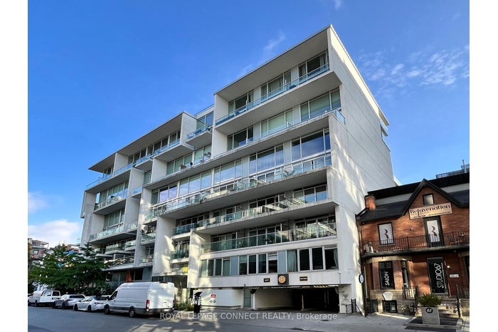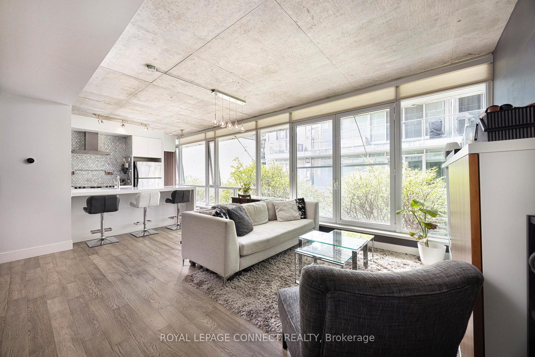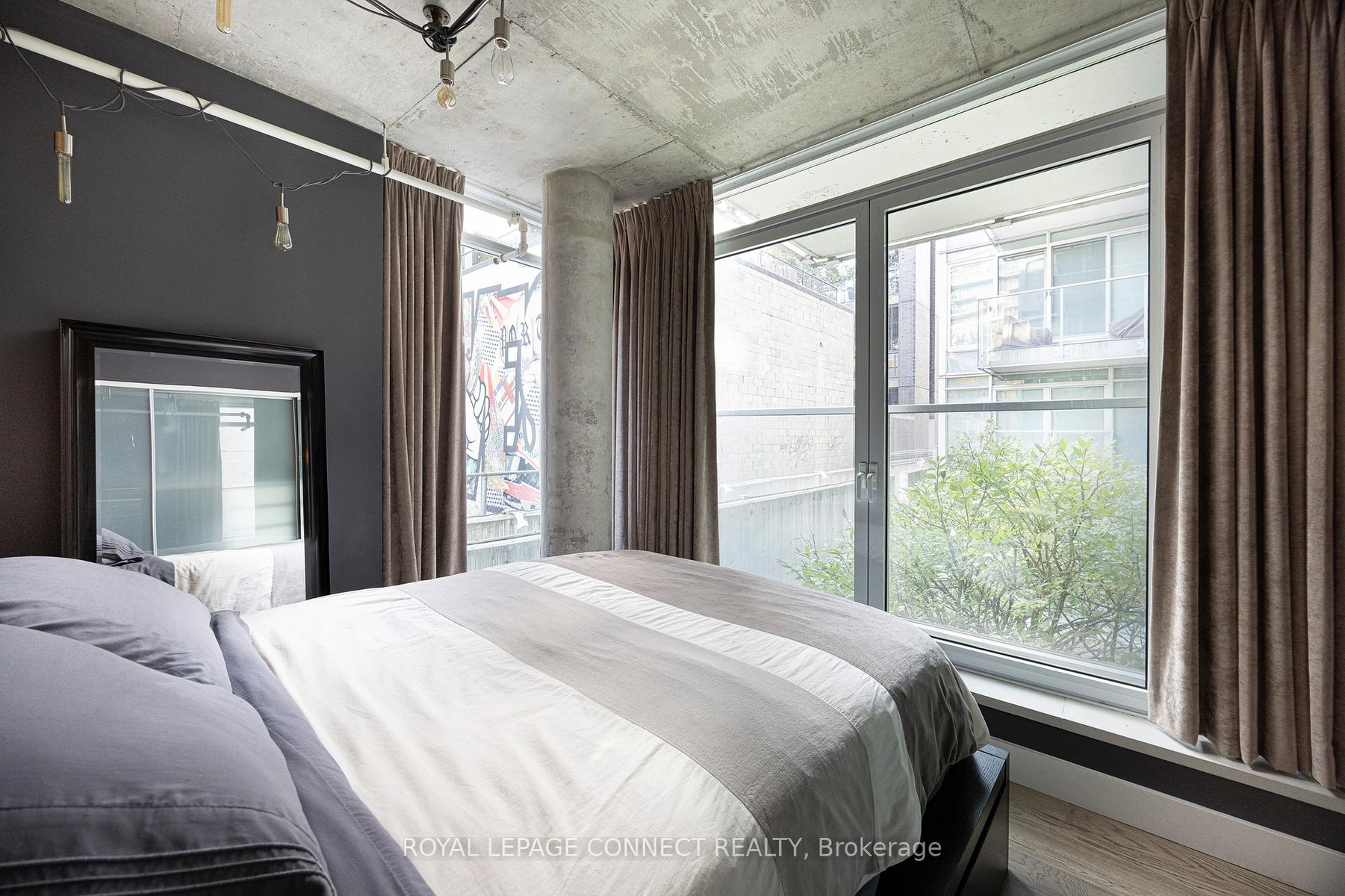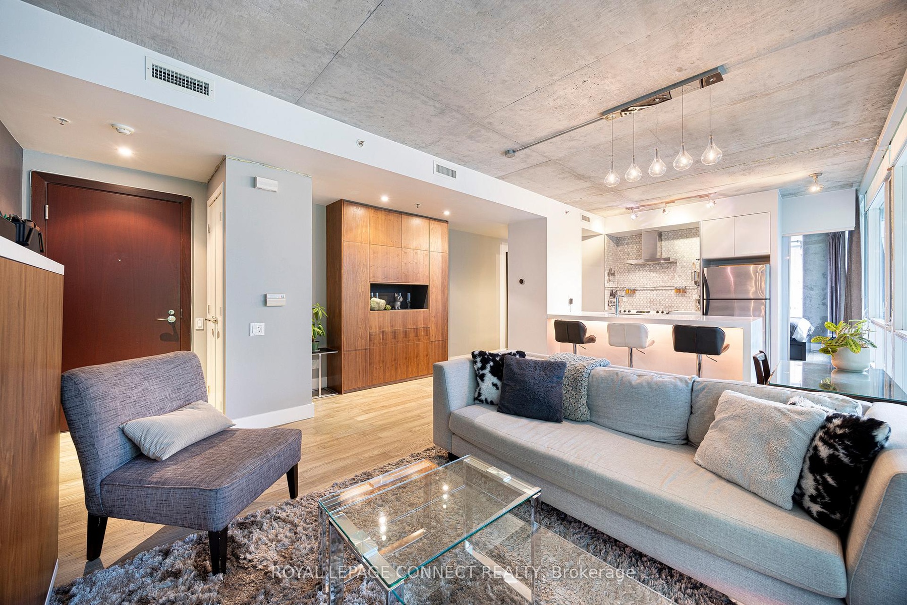 Experience sophisticated living in the heart of King West! This large one bedroom, one bathroom unit features over 700 square feet of living space, 9ft exposed concrete ceilings, an oversized kitchen island and your own mini bar. The perfect place for entertaining your guests! Ample storage including a custom built-in. Two lovely Juliette balconies overlooking the trees in the quiet courtyard, meticulously designed by Philippe Starck. Access everything that King West has to offer with the city's trendiest restaurants, shops and vibrant nightlife right out your doorstep! Come and see for yourself!