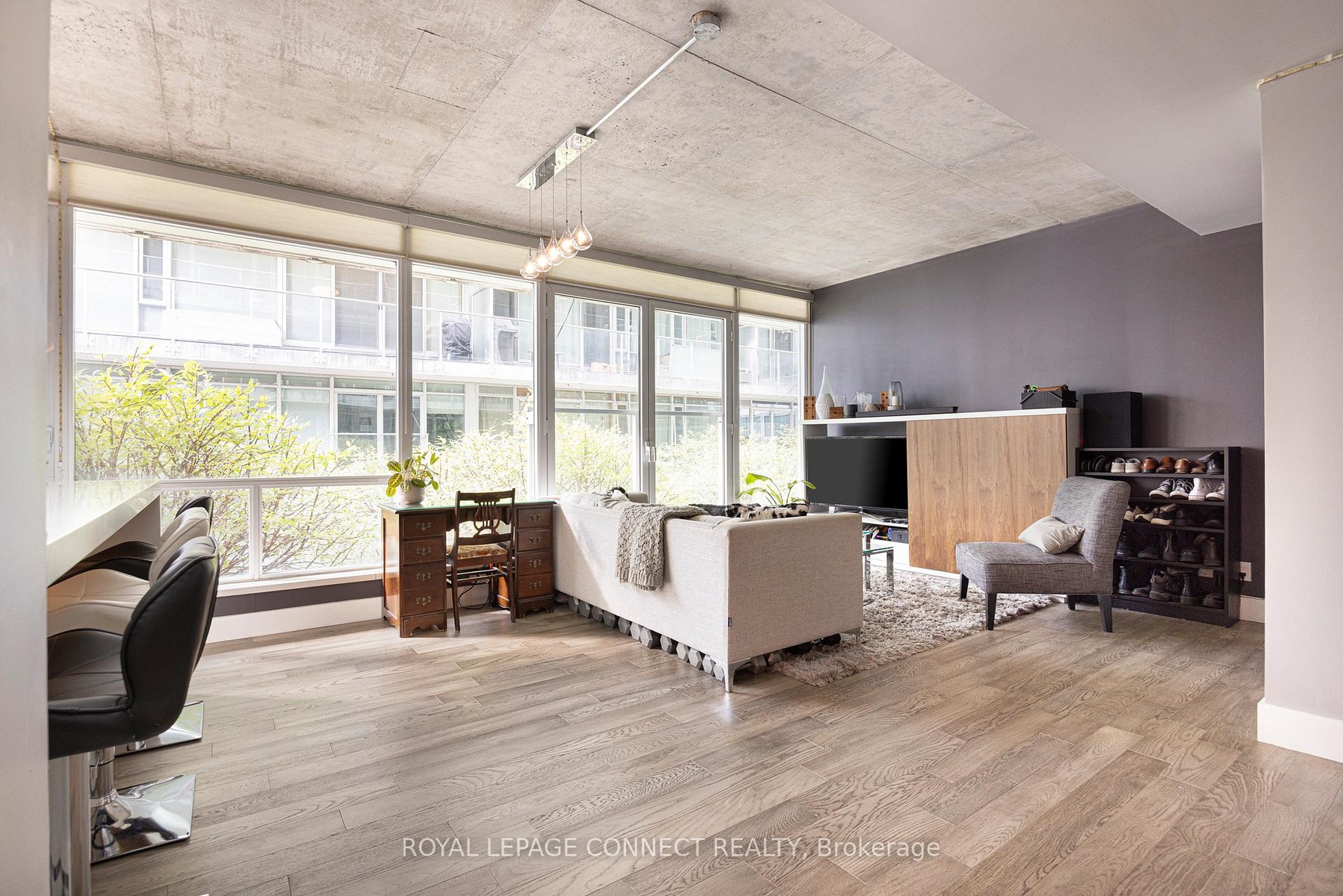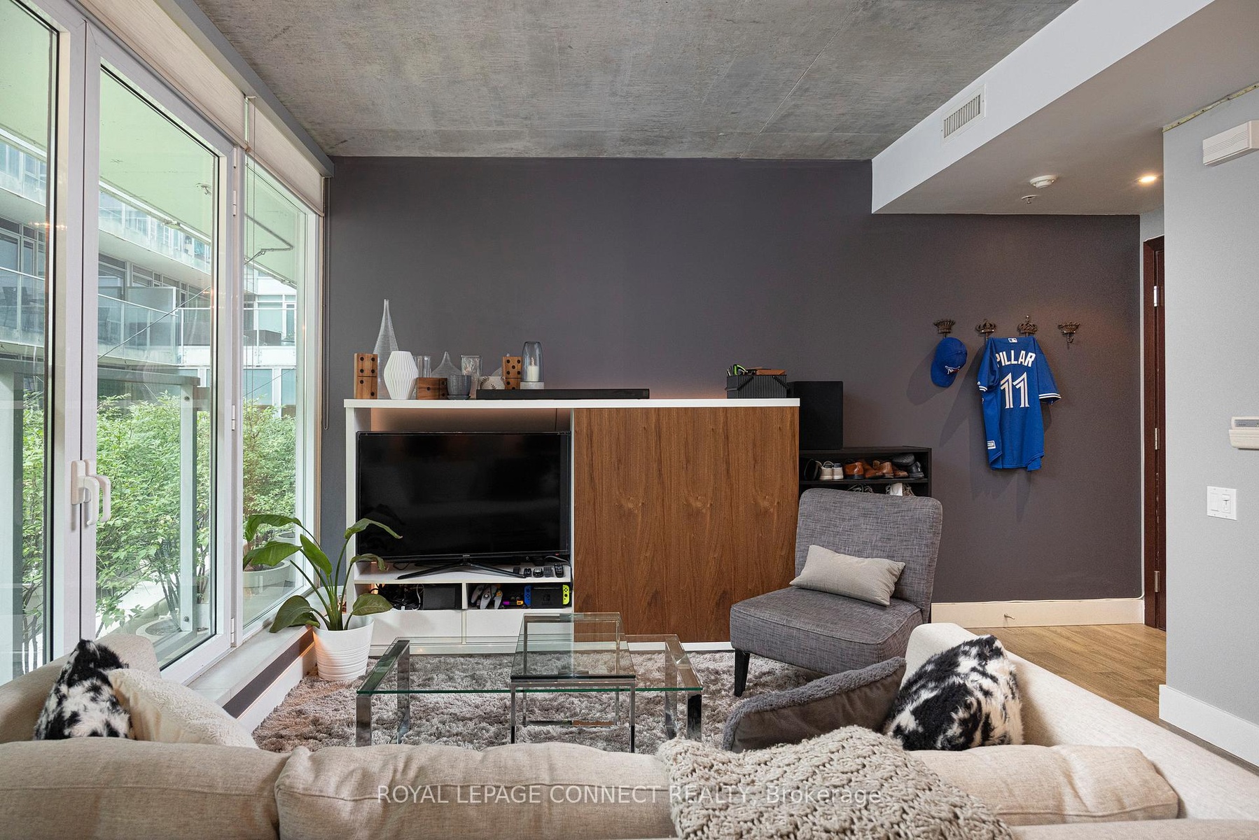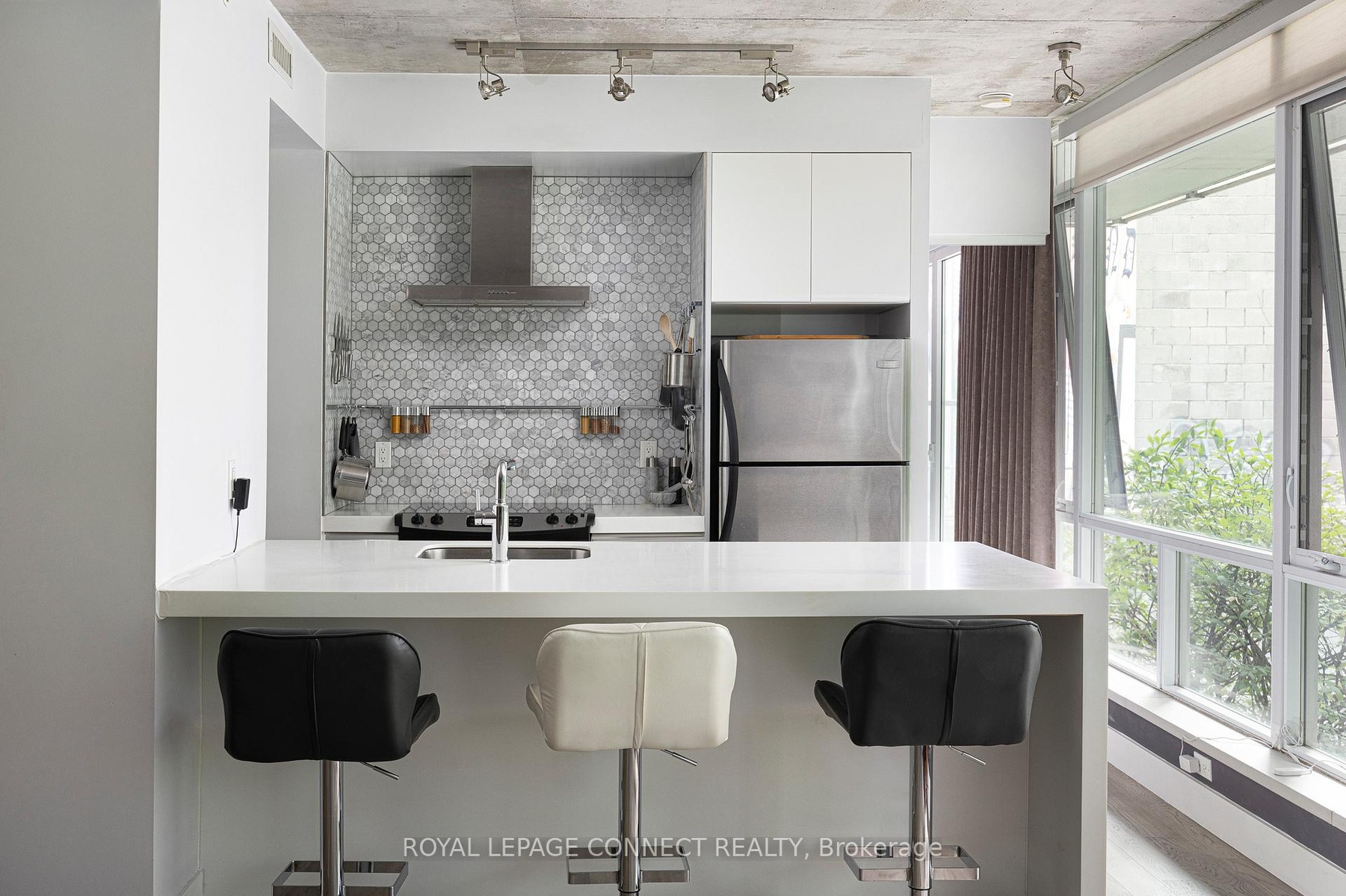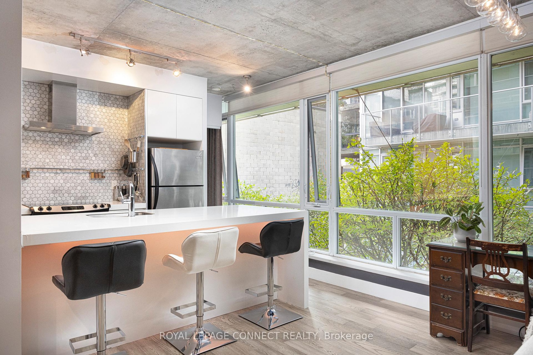 Experience sophisticated living in the heart of King West! This large one bedroom, one bathroom unit features over 700 square feet of living space, 9ft exposed concrete ceilings, an oversized kitchen island and your own mini bar. The perfect place for entertaining your guests! Ample storage including a custom built-in. Two lovely Juliette balconies overlooking the trees in the quiet courtyard, meticulously designed by Philippe Starck. Access everything that King West has to offer with the city's trendiest restaurants, shops and vibrant nightlife right out your doorstep! Come and see for yourself!