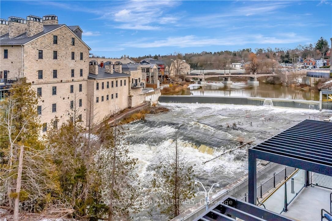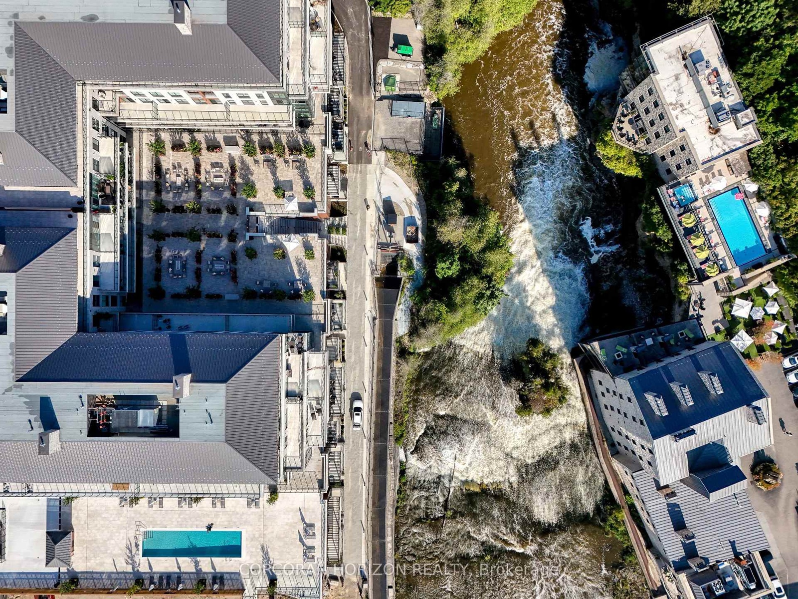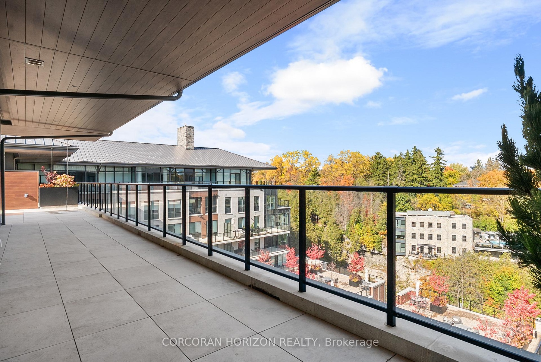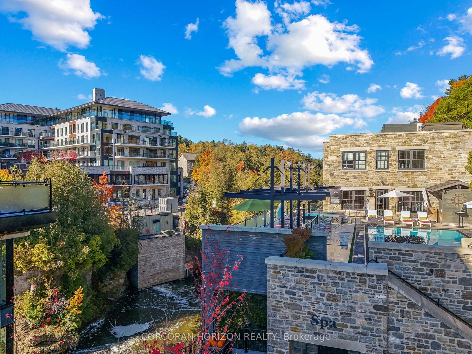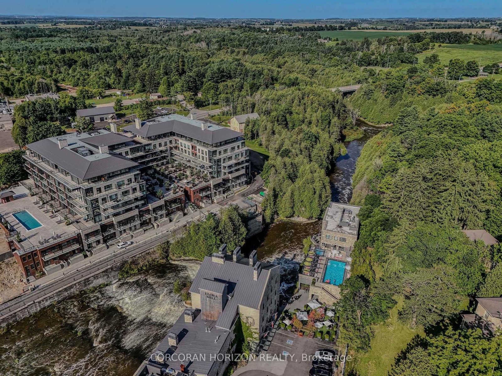 Introducing The Terrace Penthouse the premier residence at The Elora Mill Residences, offering an unmatched blend of indoor elegance and outdoor Luxury. This one-of-a-kind home features an expansive 2,400 sq.ft. wraparound terrace, complete with open-air and covered spaces, anchored by a striking double-sided stone fireplace perfect for year-round entertaining and relaxation. Inside, you will find 2289 sq.ft of living space and over $400,000 in premium upgrades which elevate every detail. Soaring 10-ft custom ceilings, softly curved architectural walls, and a dramatic two-sided fireplace set a sophisticated tone throughout the open-concept living space. Designed with the entertainer in mind, this home includes a wet bar, butlers pantry, and a chefs kitchen equipped with top-tier Miele appliances, extra-tall custom cabinetry, and an oversized island with bar seating. The open dining space is perfect for both casual dining or entertaining. The layout offers exceptional flexibility, with a spacious bonus room ideal for a home office, formal dining room or additional bedroom. The primary bedroom suite is thoughtfully positioned for privacy, featuring a walk-in closet and spa-inspired ensuite with a soaker tub, oversized glass shower, dual vanities, and private water closet. A second bedroom is located in its own wing with its own ensuite and sitting area providing comfort for guests or family members. Additional highlights include a grand entry with 2 closets, powder room, full laundry room, two parking spaces, and storage locker. Residents of The Elora Mill Residences enjoy resort-style amenities, including concierge service, a lobby coffee bar, gym and yoga studio, furnished terrace with river views, and an outdoor pool with spectacular views of the river. Located just steps from Elora's top restaurants, cafés, galleries, and shops this penthouse offers an unparalleled lifestyle in one of Ontario's most charming communities.
