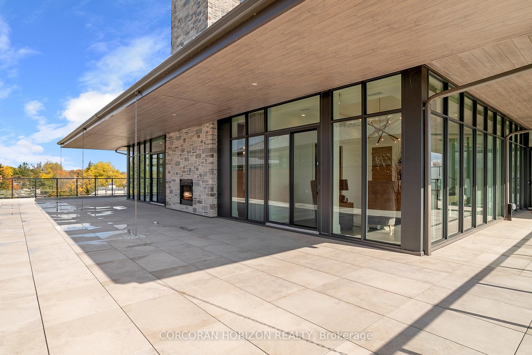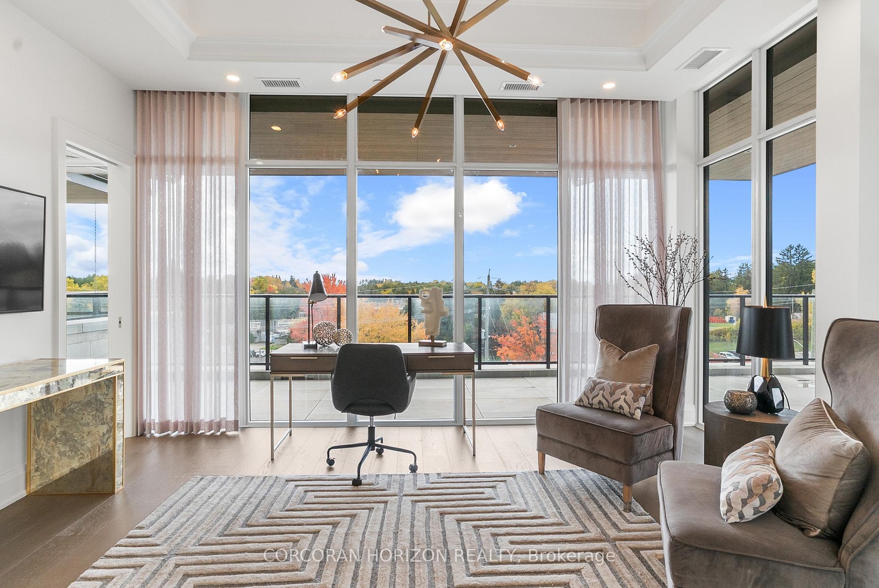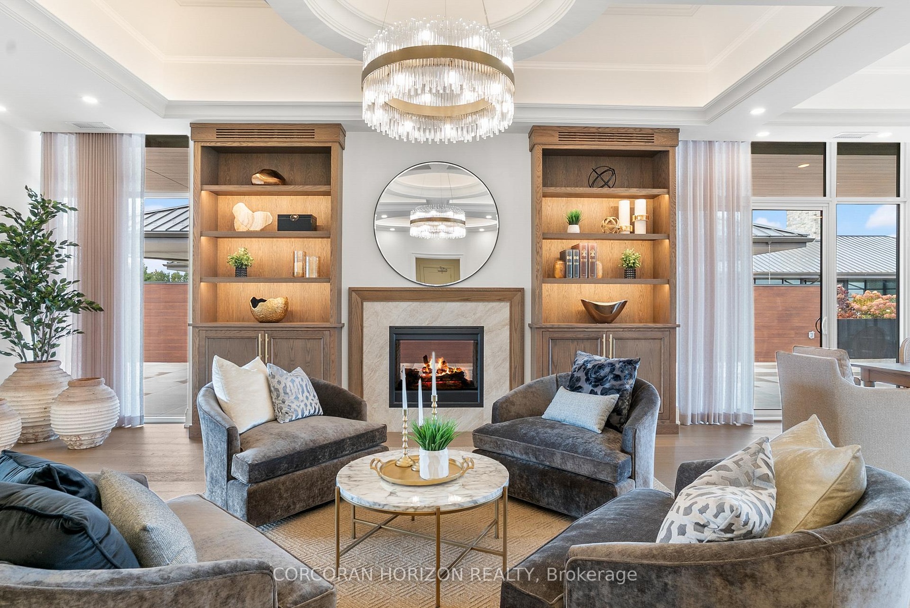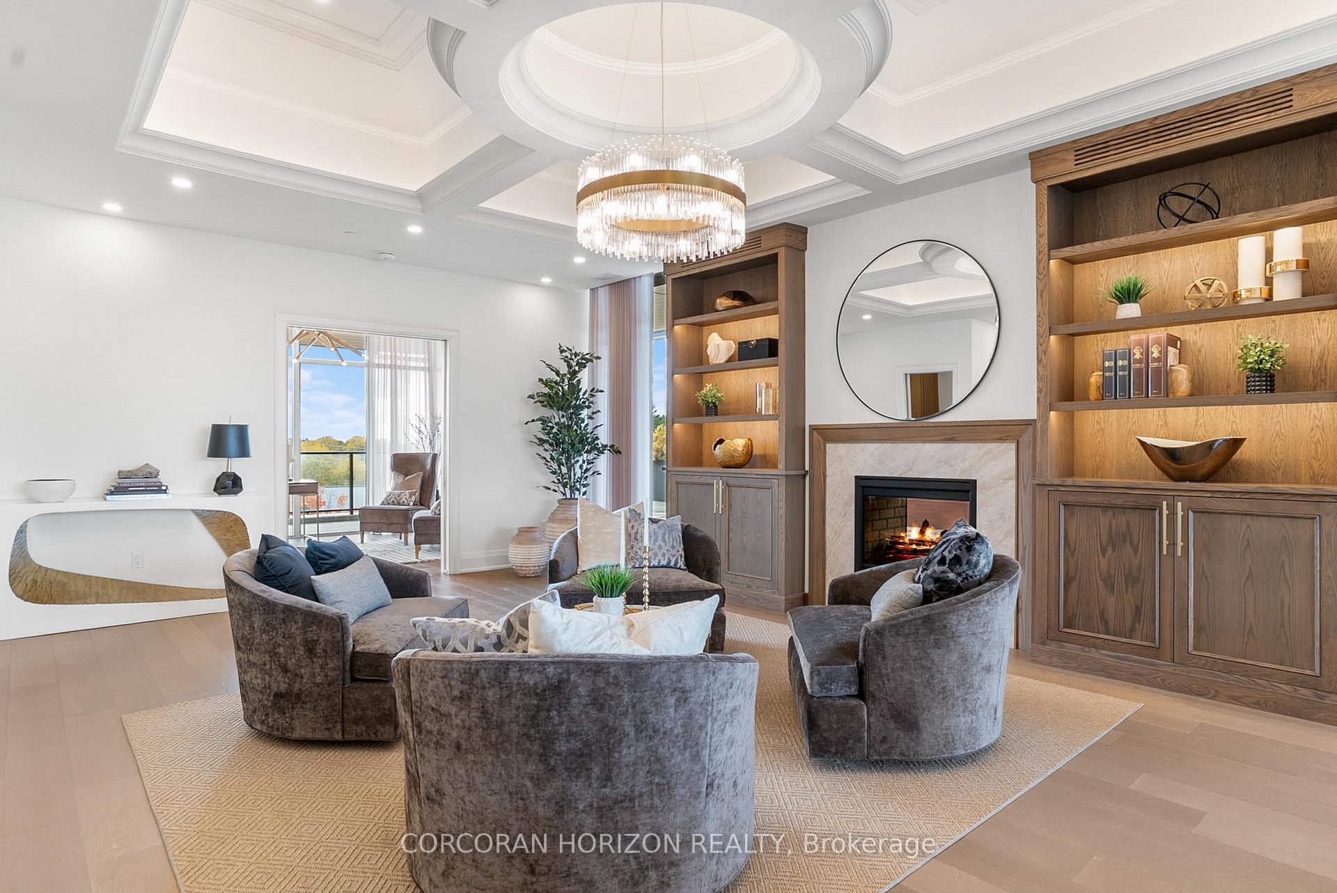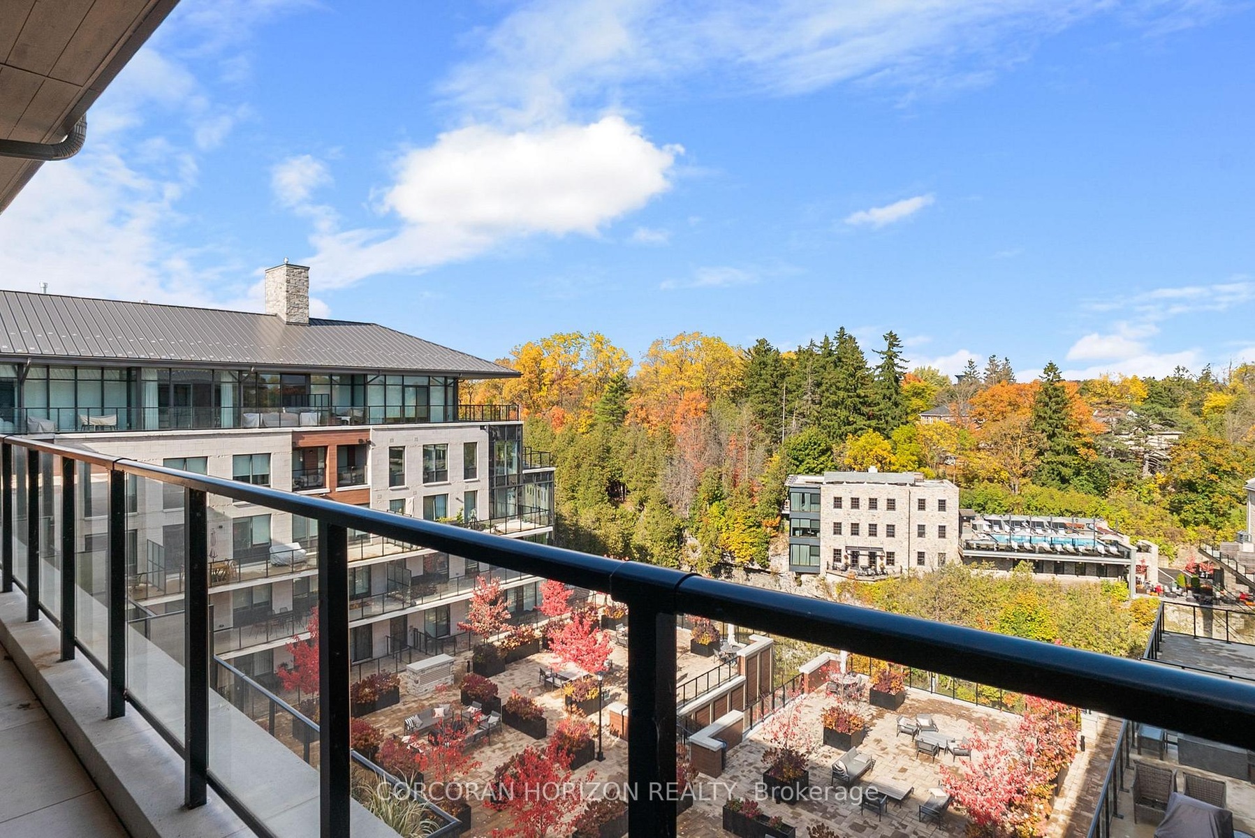 Introducing The Terrace Penthouse the premier residence at The Elora Mill Residences, offering an unmatched blend of indoor elegance and outdoor Luxury. This one-of-a-kind home features an expansive 2,400 sq.ft. wraparound terrace, complete with open-air and covered spaces, anchored by a striking double-sided stone fireplace perfect for year-round entertaining and relaxation. Inside, you will find 2289 sq.ft of living space and over $400,000 in premium upgrades which elevate every detail. Soaring 10-ft custom ceilings, softly curved architectural walls, and a dramatic two-sided fireplace set a sophisticated tone throughout the open-concept living space. Designed with the entertainer in mind, this home includes a wet bar, butlers pantry, and a chefs kitchen equipped with top-tier Miele appliances, extra-tall custom cabinetry, and an oversized island with bar seating. The open dining space is perfect for both casual dining or entertaining. The layout offers exceptional flexibility, with a spacious bonus room ideal for a home office, formal dining room or additional bedroom. The primary bedroom suite is thoughtfully positioned for privacy, featuring a walk-in closet and spa-inspired ensuite with a soaker tub, oversized glass shower, dual vanities, and private water closet. A second bedroom is located in its own wing with its own ensuite and sitting area providing comfort for guests or family members. Additional highlights include a grand entry with 2 closets, powder room, full laundry room, two parking spaces, and storage locker. Residents of The Elora Mill Residences enjoy resort-style amenities, including concierge service, a lobby coffee bar, gym and yoga studio, furnished terrace with river views, and an outdoor pool with spectacular views of the river. Located just steps from Elora's top restaurants, cafés, galleries, and shops this penthouse offers an unparalleled lifestyle in one of Ontario's most charming communities.