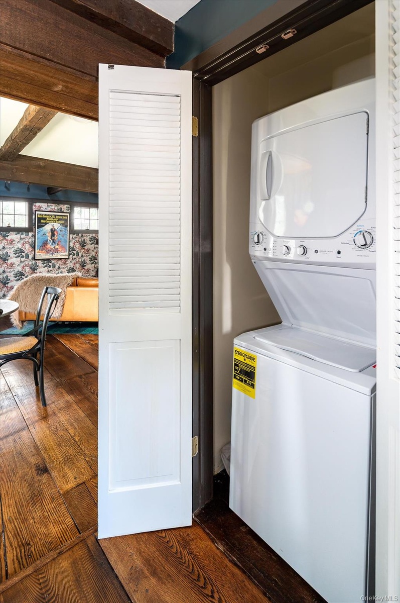 - Living room featuring hardwood floors, a fireplace, beamed ceiling