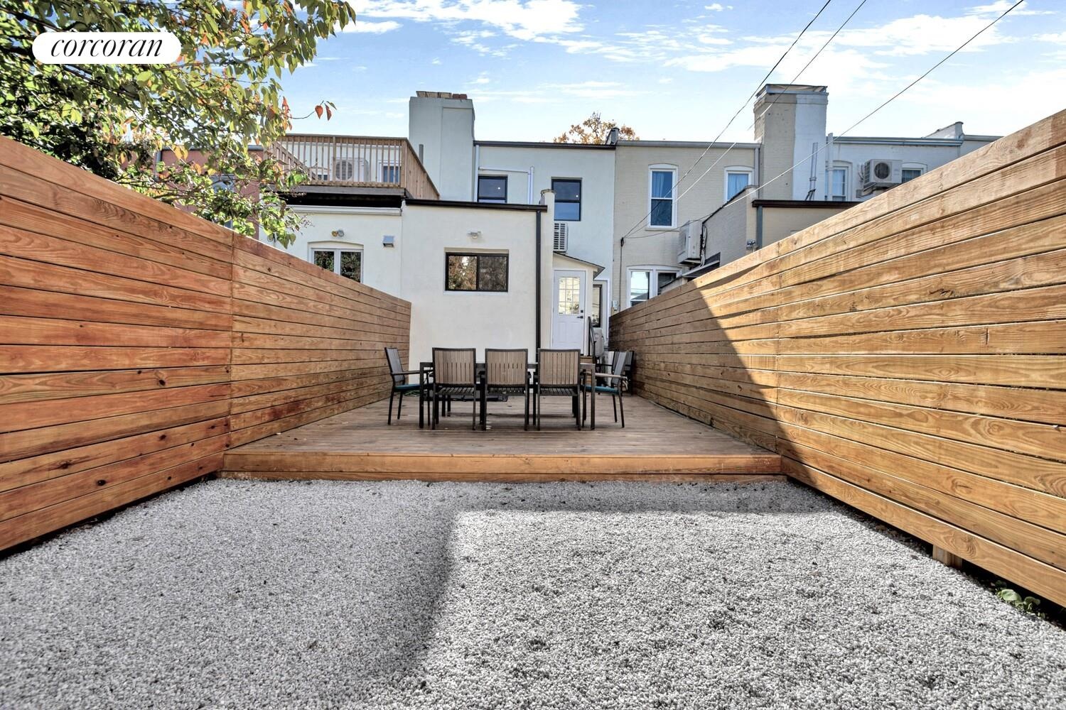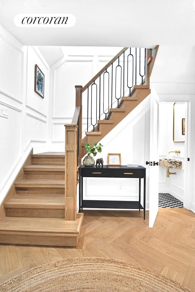 Up the stoop, a lovely front porch overlooks the peaceful tree lined street, offering a delightful spot to read a book, or catch up with neighbors. Inside, the spacious layout allows for several seating areas, while new white oak herringbone floors and wainscotting add an elevated warmth to the home. Beyond the living room a formal dining room offers plenty of space for your next gathering, while the brand new chef's kitchen will making cooking for them a joy! In the kitchen, a full suite of Viking appliances awaits you, including a 5 burner range, vented hood, dishwasher and fridge. There is also a Sharpe drawer microwave to keep your counters appliance free. The custom cabinets stretch all the way to the ceiling and include thoughtful finishes, like rotational shelving in the corner cabinets. The brushed gold finishes are modern, yet classic, and even include a pot filler sink over the range. Off the kitchen is a small mudroom before the entrance to the large backyard which features a new deck and fence, and leafy views beyond. A coat closet and powder room with a elegant marble sink finish the main level.