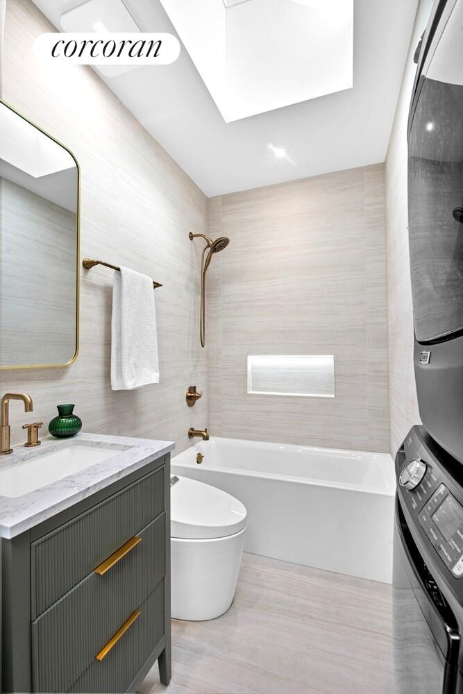 Up the wrapped center staircase is an open landing and hall lit by a large skylight, highlighting the soaring ceilings found on this level. At the front is the king sized primary bedroom, again with elegant wainscotting, a large front window, and a full wall of custom built floor to ceiling closets. The en suite bathroom features restful sage green wall tiles with elegant marble floors. There is a lighted mirror and smart toilet, and the stall shower includes a rain shower and shower wand. The large hall bath is equally lovely, with another large skylight and smart toilet, as well as a large soaking tub and vented gas W/D. Two more bedrooms are nestled at the back of the home, each with ample closets; one is queen sized and one is perfect for a twin.