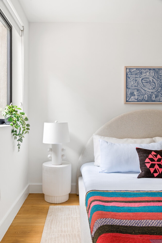 Flooded with natural light from eastern and western exposures, the residence features expansive floor-to-ceiling windows that frame the dynamic cityscape. Wide white oak plank flooring flows gracefully throughout, enhancing the warm yet sophisticated ambiance. The thoughtfully curated open-concept layout begins with a welcoming foyer, leading into a luminous living area anchored by a sleek, modern kitchen. Here, a striking quartz waterfall island takes center stage, complemented by top-tier Viking, Bosch, and Faber appliances. Floor-to-ceiling sliding glass doors open to a Juliet balcony, inviting an effortless indoor-outdoor flow. Convenience is further elevated with a washer and dryer discreetly tucked away within the hallway closet, and central air and heat throughout the apartment.