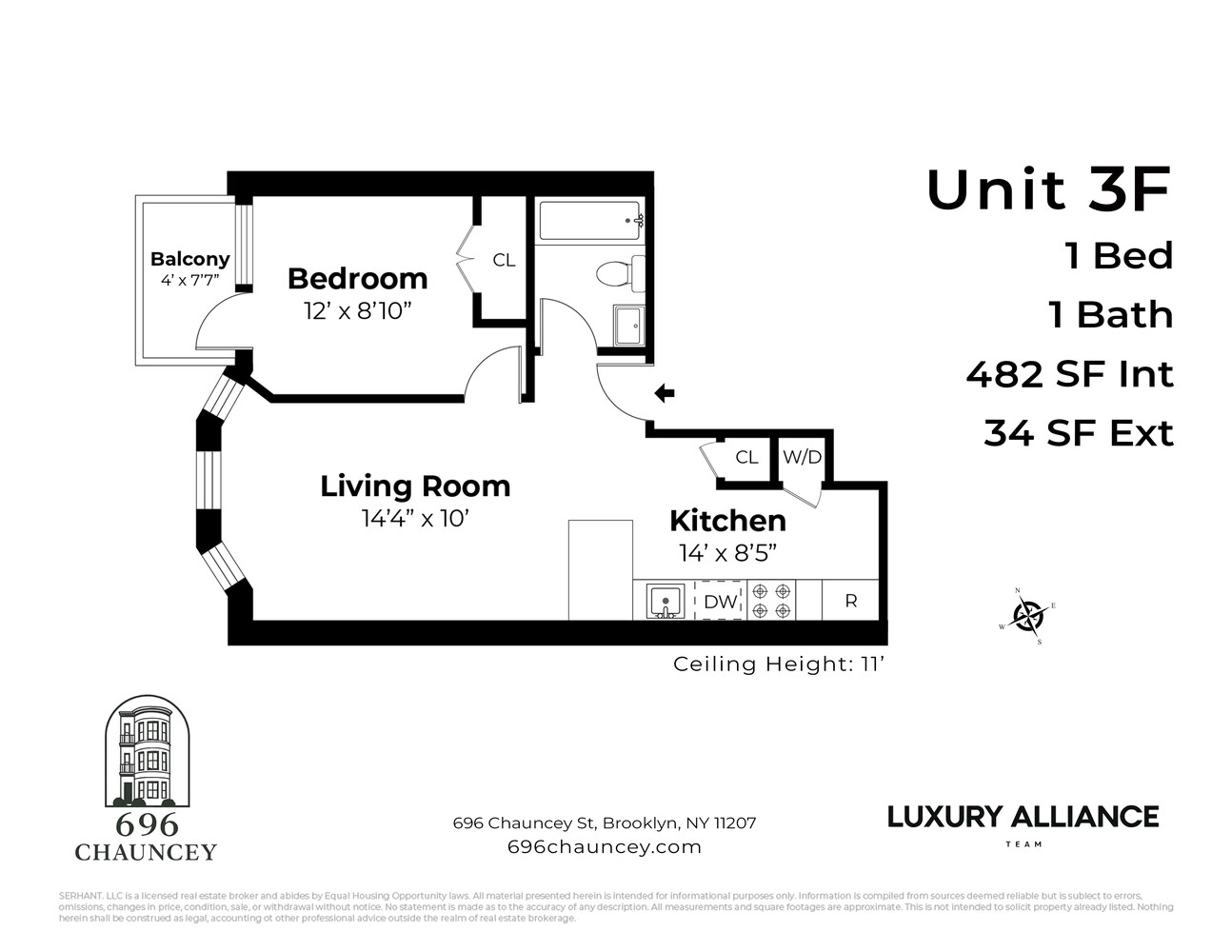Residence 3F is a well-designed 1-bedroom, 1-bathroom home with 482 interior square feet and a private 34 square foot northwest-facing balcony. 11 foot tall ceilings and large windows contribute a sense of volume and light throughout.