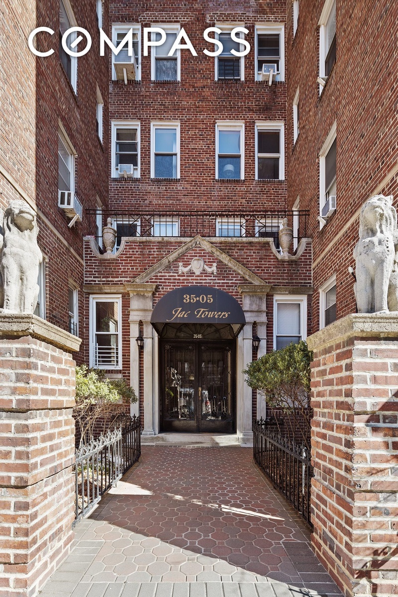 This sunny and spacious 925 square foot corner 1BR/1BA is sure to charm you. A proper foyer with multiple closets flows into an enormous living and dining space, offering tremendous flexibility of use, including space for a home office. The living room itself can accommodate a large dining table and seating area, while the adjacent, windowed kitchen will appeal to the aspiring chef. The large, corner bedroom has two exposures, lots of sunlight, room for a King-sized bed and plenty of closet space. Unit #4E has 9 foot ceilings and gorgeous hardwood floors throughout, and has been recently renovated. The Jac Towers, a desirable Jackson Heights elevator co-op, is superbly located minutes from the 74th Street subway (E/F/M/R/7 trains - 3 stops to midtown Manhattan), the 34th Avenue pedestrian walkway, and a few blocks from Travers Park, with its playgrounds, basketball courts, tennis courts and dog run. The pet-friendly co-op has storage (for rent), bike storage, laundry and a live-in super.