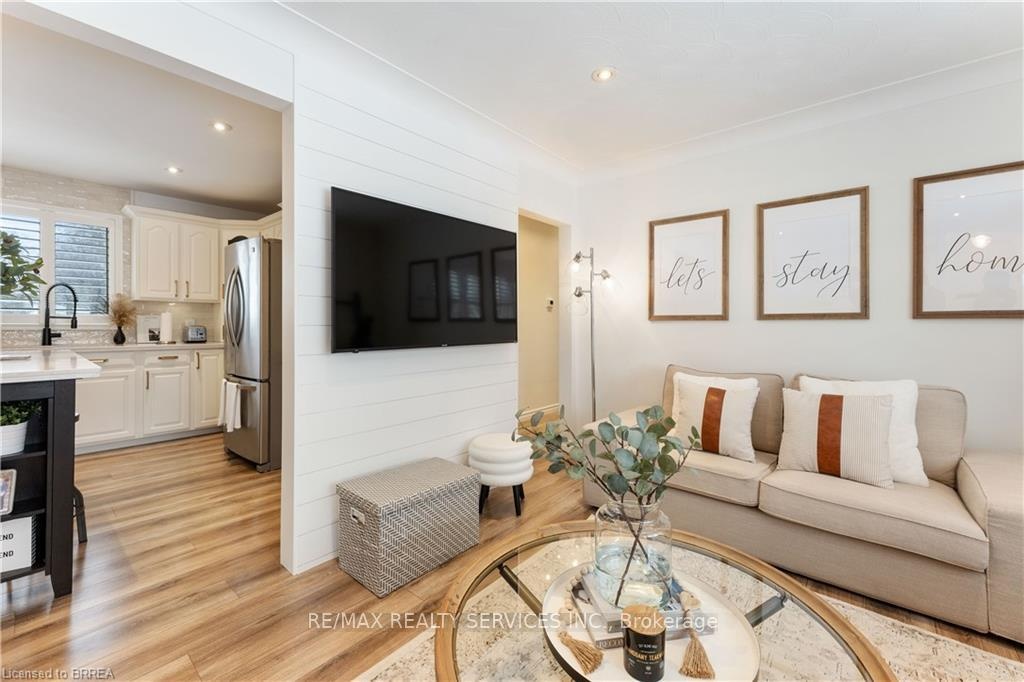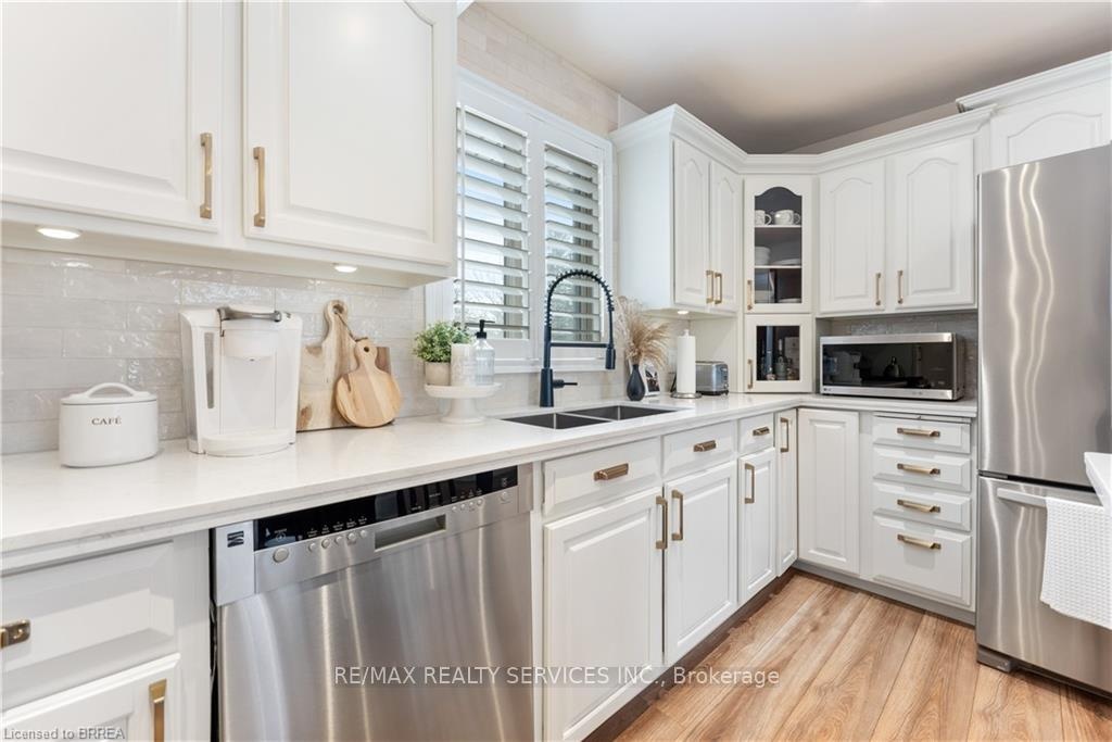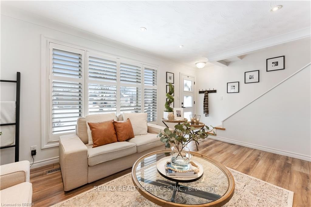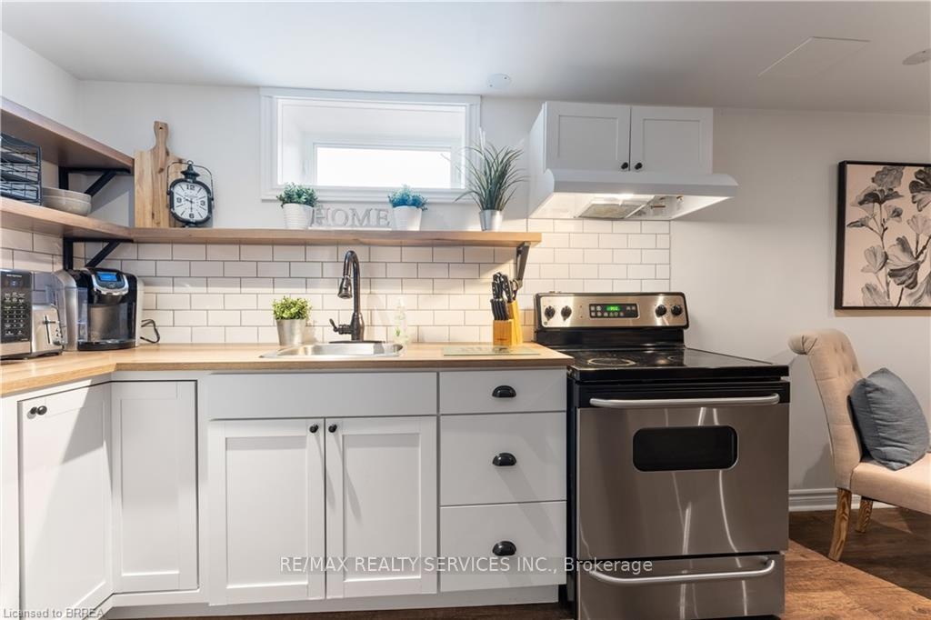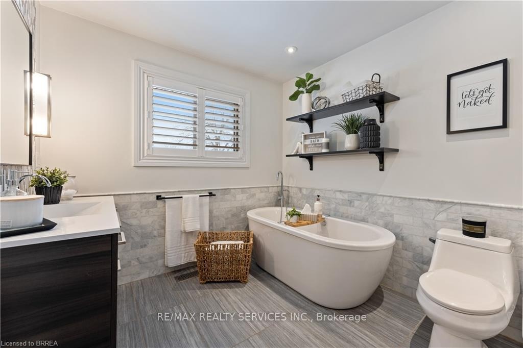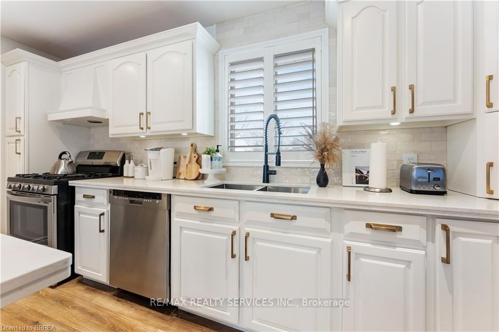 Beautifully renovated inside and out! This 3-bedroom, 2-bathroom home sits on a quiet dead-end street in Brantford and offers modern living at its finest. Enjoy a bright living room with a stylish shiplap accent wall, California shutters, and pot lights throughout. The kitchen features quartz countertops, sleek cabinetry, and a matte black faucet-perfect for entertaining with an open flow to the living area. The main level includes two bedrooms, a spa-like bathroom with a floating vanity, standalone tub, and rainfall shower, plus a convenient laundry room. Upstairs, relax in your spacious second living area with a gas fireplace and walkout to a raised deck. The fully finished basement adds even more space, ideal for an in-law suite, complete with kitchen, living room, bedroom, and modern bath. Move-in ready and beautifully updated-this home truly has it all!
