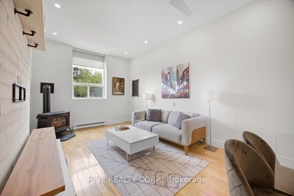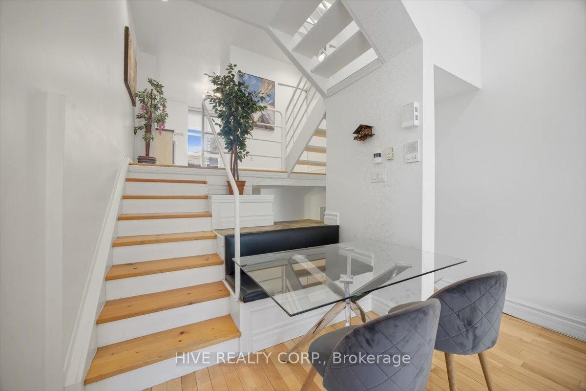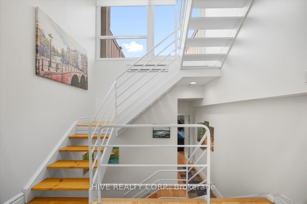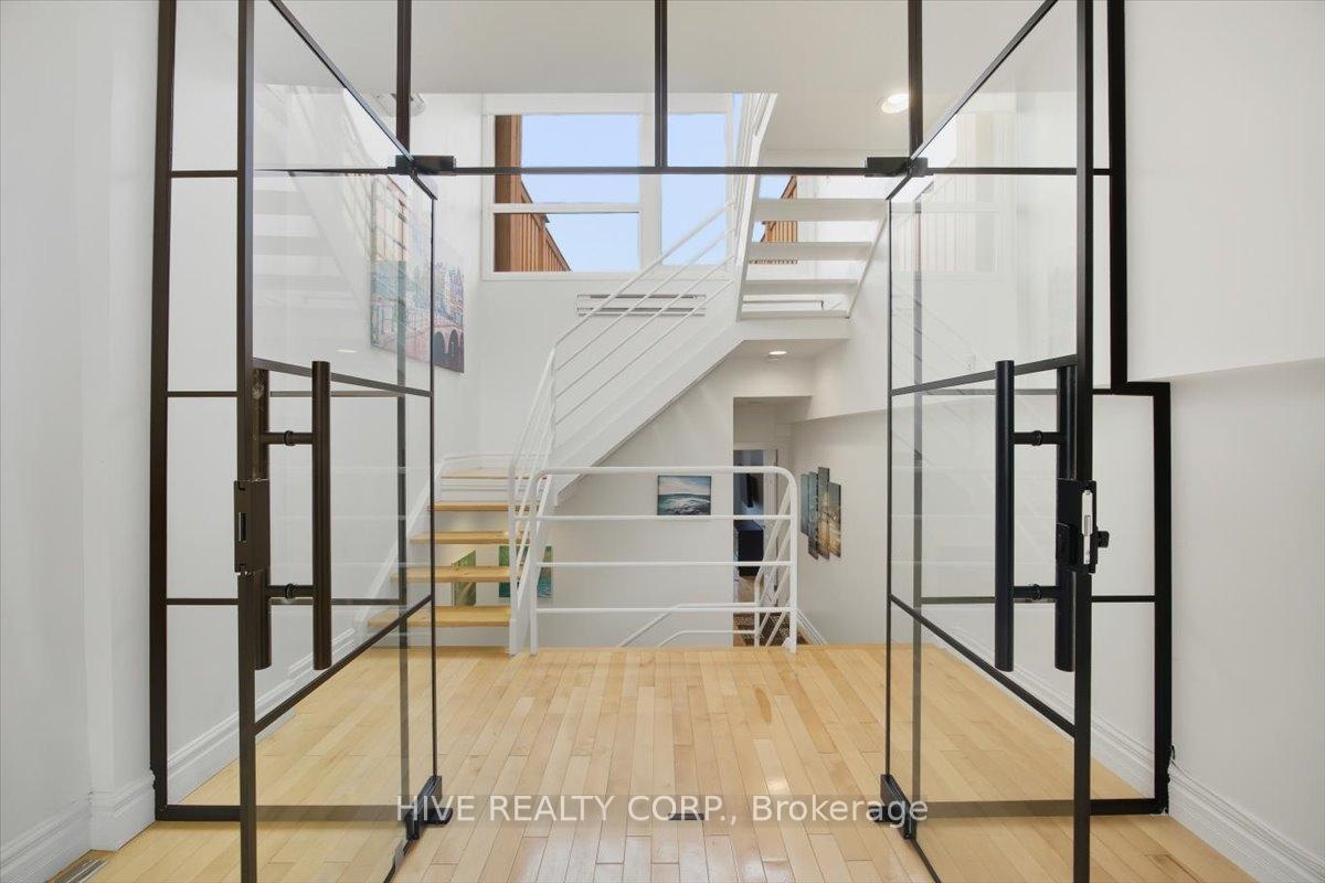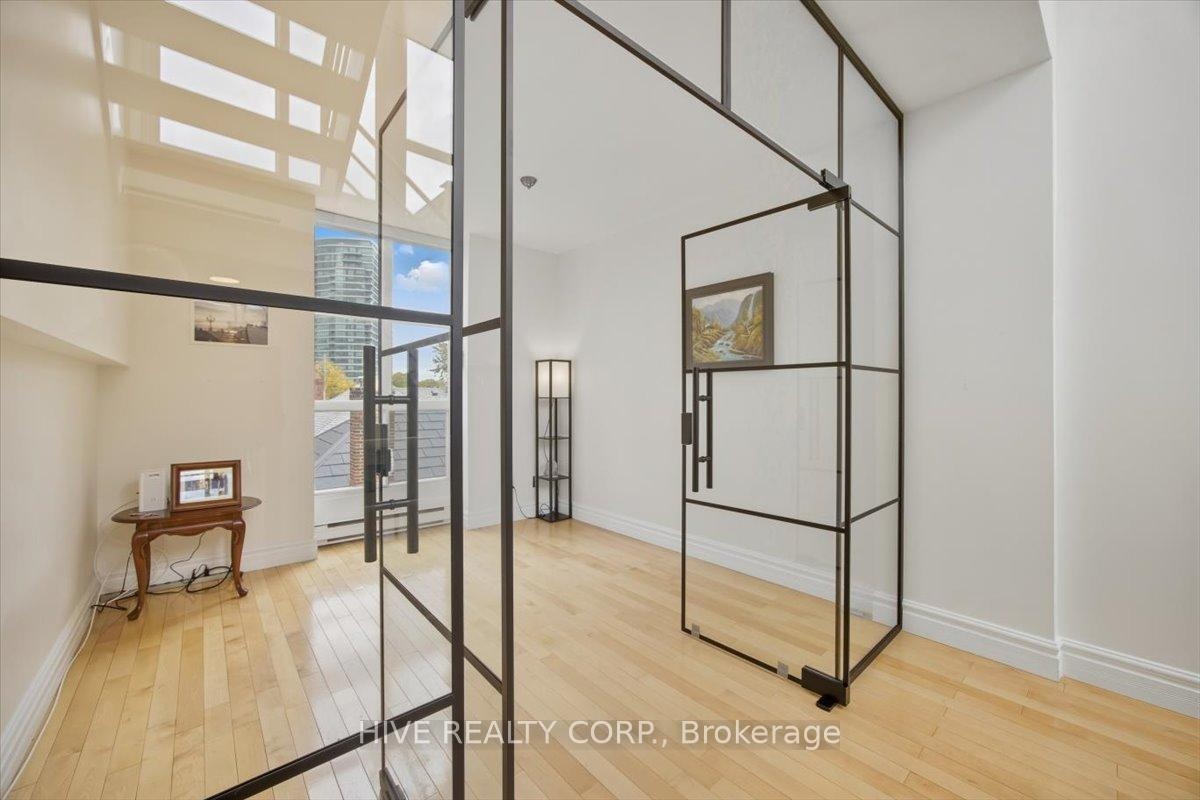 Discover a home that is anything but ordinary. Nestled within the coveted Playter Estates, The Historical Don Hall Lofts present a phenomenal 2-bedroom, 2-bathroom townhouse, once a vibrant 1920s dance hall and later a hippie commune.Now, this multi-level sanctuary is a light-filled retreat. Soaring 10-foot ceilings and massive, tall windows bathe the open-concept space in sunshine. The second bedroom is a masterpiece of flexibility, featuring a sleek glass wall system that can be a sun-drenched home office, a peaceful nursery, or a bright and airy bedroom. A gas fireplace creates a cozy ambiance, perfect for unwinding in your Living/Dining space.Step outside to your own private escape with two rooftop terraces that offer a serene perch above a quaint, tree-lined street. This is urban living with unparalleled tranquility, yet you're moments from the Broadview Transit Hub, the Don Valley Trail system, and the energy of the Danforth. Parking and storage locker complete this exceptional offering.Seize the chance to own a truly artistic home in one of Toronto's most sought-after neighbourhoods. Your history-rich oasis awaits.