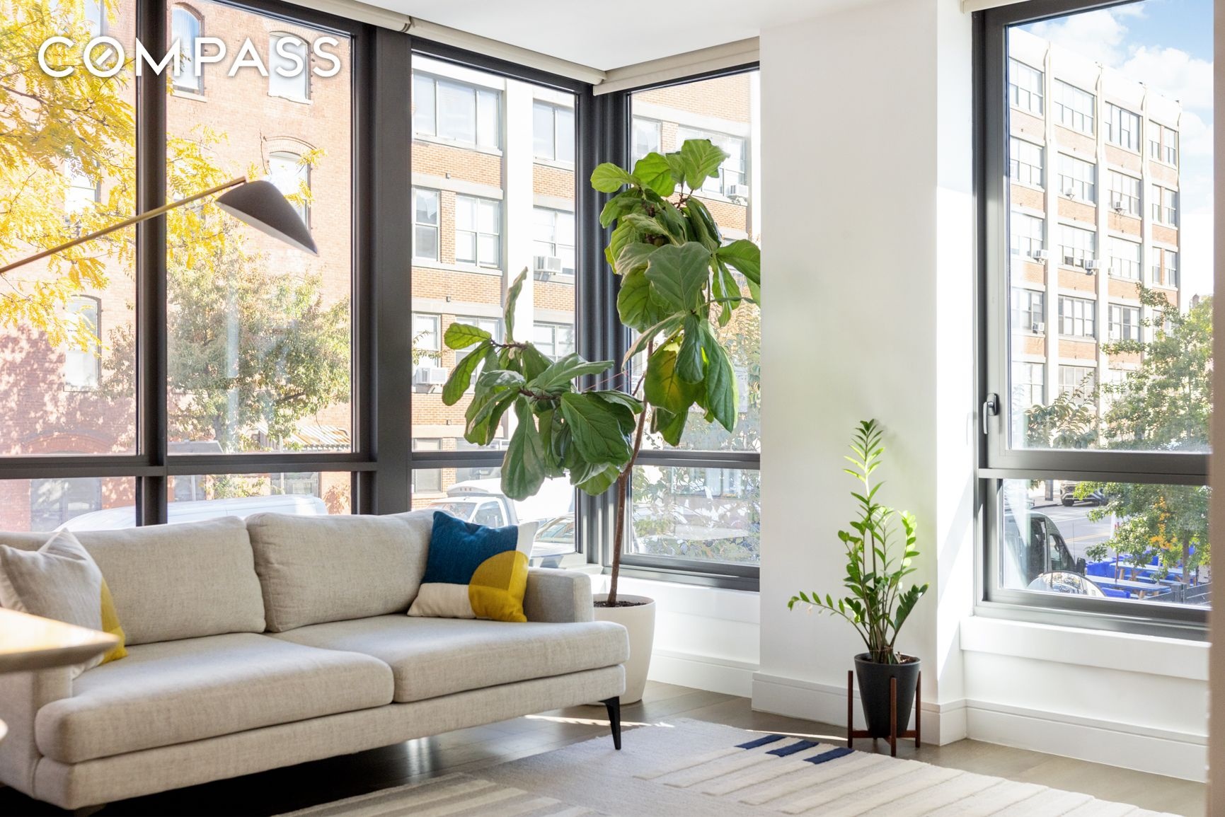 Welcome to Residence 2B at 50 Greenpoint Condominium — an exceptional, light-filled corner home offering sweeping views of the leafy neighborhood and a glimpse of the East River through dramatic floor-to-ceiling windows. A private parking space within the building is also available.
