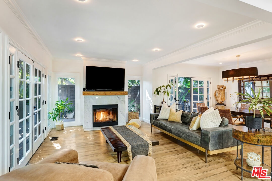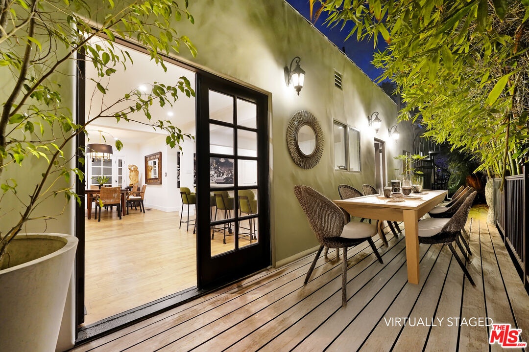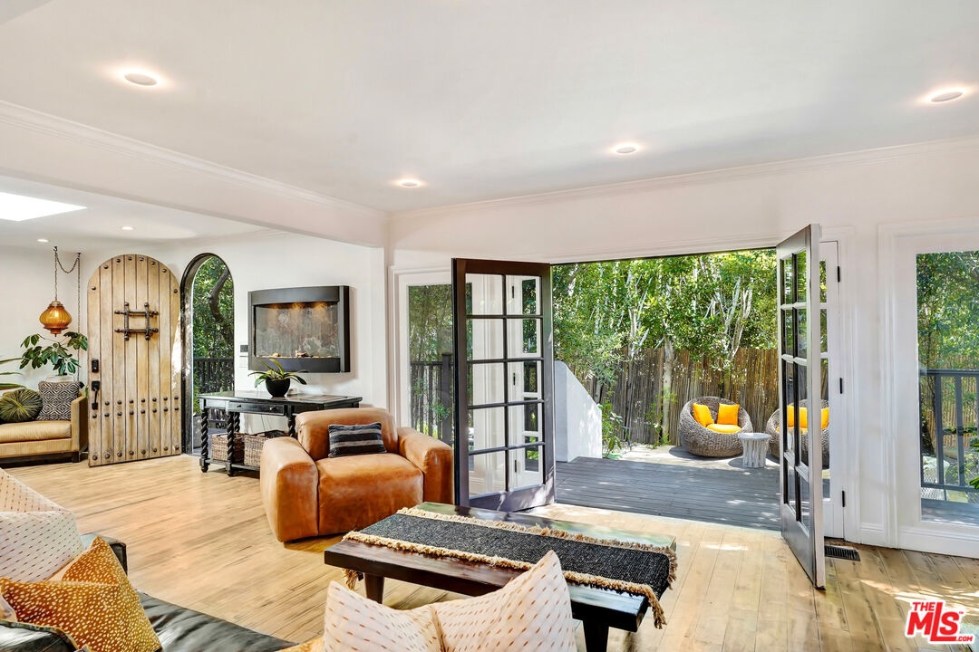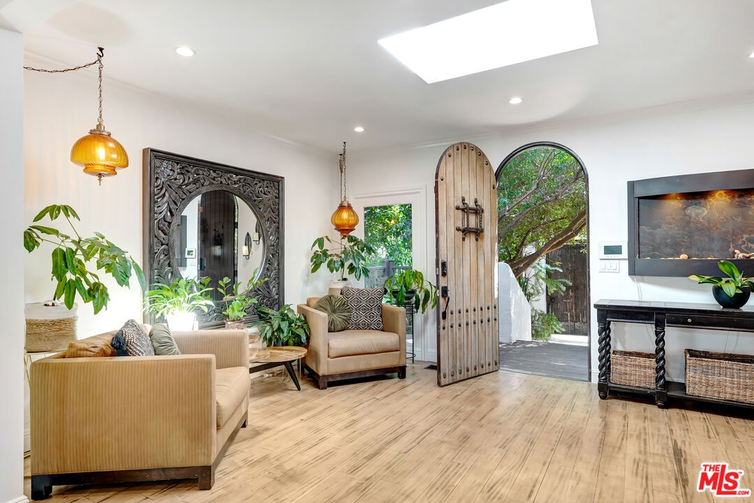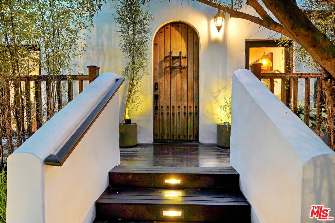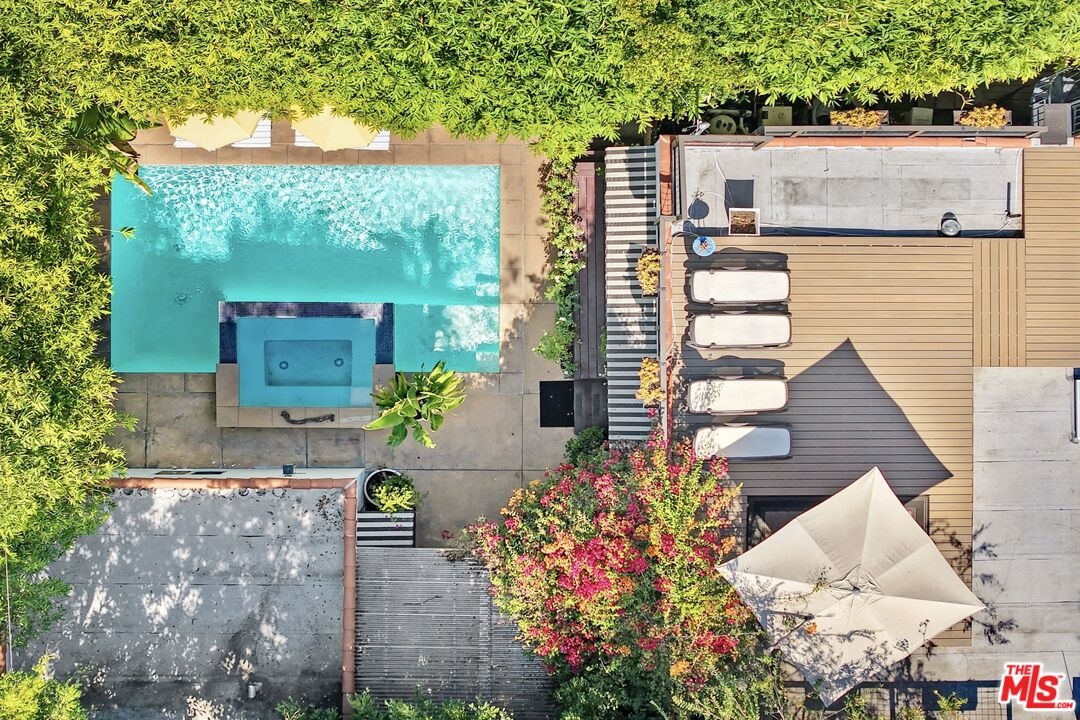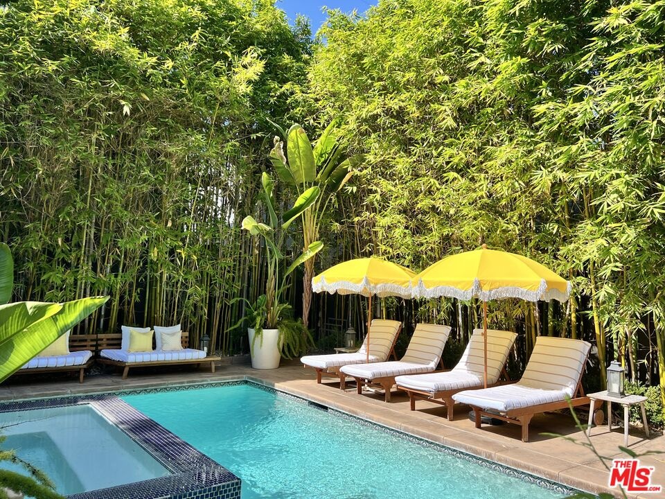 Prepare to be mesmerized. Welcome to Secret Garden Weho, a walker's paradise just minutes from 6 Michelin-Starred restaurants, neighborhood parks, recreation centers, and local markets - yet it feels a world apart. Here, every space blurs the line between home and haven. Discover spectacular indoor and outdoor living, including a panoramic rooftop deck, in a bright, canopied, Moorish-inspired sanctuary where architecture and nature dissolve into a Zen California dream. Your journey begins the moment you step through a massive driftwood door into a lush courtyard of beautiful tiled floors and inviting seating areas - a serene prelude to what lies within. This isn't just a home; it's your own Secret Garden, enveloped by olive trees, silver sheens, fern trees, and exotic flora. Positioned on a privileged corner lot, the property offers rare privacy and effortless freedom to entertain amid the city's vibrant pulse. Spanning over 3,000 square feet of total indoor-outdoor living space (~2,450 sqft indoor), the residence unfolds on a single level, perfectly balancing openness and intimacy. Expansive terraces and wraparound decks flow almost entirely around the home, drawing the vibrant greenery inside and creating a dreamy, seamless indoor-outdoor lifestyle. At its heart lies a grand, open-concept living area designed for both lively gatherings and quiet reflection, centered around a chef's kitchen with a generous island, peninsula bar, and a stunning skylight that floods the space with natural light. Two primary suites, two guest bedrooms, and a versatile room with dual-access bath and outdoor deck (currently serving as an executive office with water views and an adorable nursery) offer calming vistas of gardens and greenery from every corner. Step beyond, and the magic deepens. The backyard reveals a private, sparkling pool and spa nestled among groves of bamboo -- your very own resort retreat. You'll feel transported thousands of miles away to your own slice of paradise, where time slows and the air feels lighter. Adjacent, a spacious entertaining area awaits, perfect for unforgettable al-fresco dinners. For added comfort, a detached pool house includes a full bath for guests and an infrared sauna to unwind after the day's adventures. Finally, ascend a spiral staircase through the canopy to discover the crown jewel -- a private rooftop deck that seems to lift this Secret Garden into the sky. Shielded by lush landscaping, it offers complete privacy and panoramic views of the Hollywood skyline, the Hollywood Sign, and the surrounding hills. Whether you're soaking up the California sun or stepping away from the home office for a midday burst of inspiration, this rooftop haven is your personal sanctuary above the city. An incredibly rare offering just moments from the heart of West Hollywood, Secret Garden Weho is more than a home - it's a feeling. Are you ready to escape into your Secret Garden?