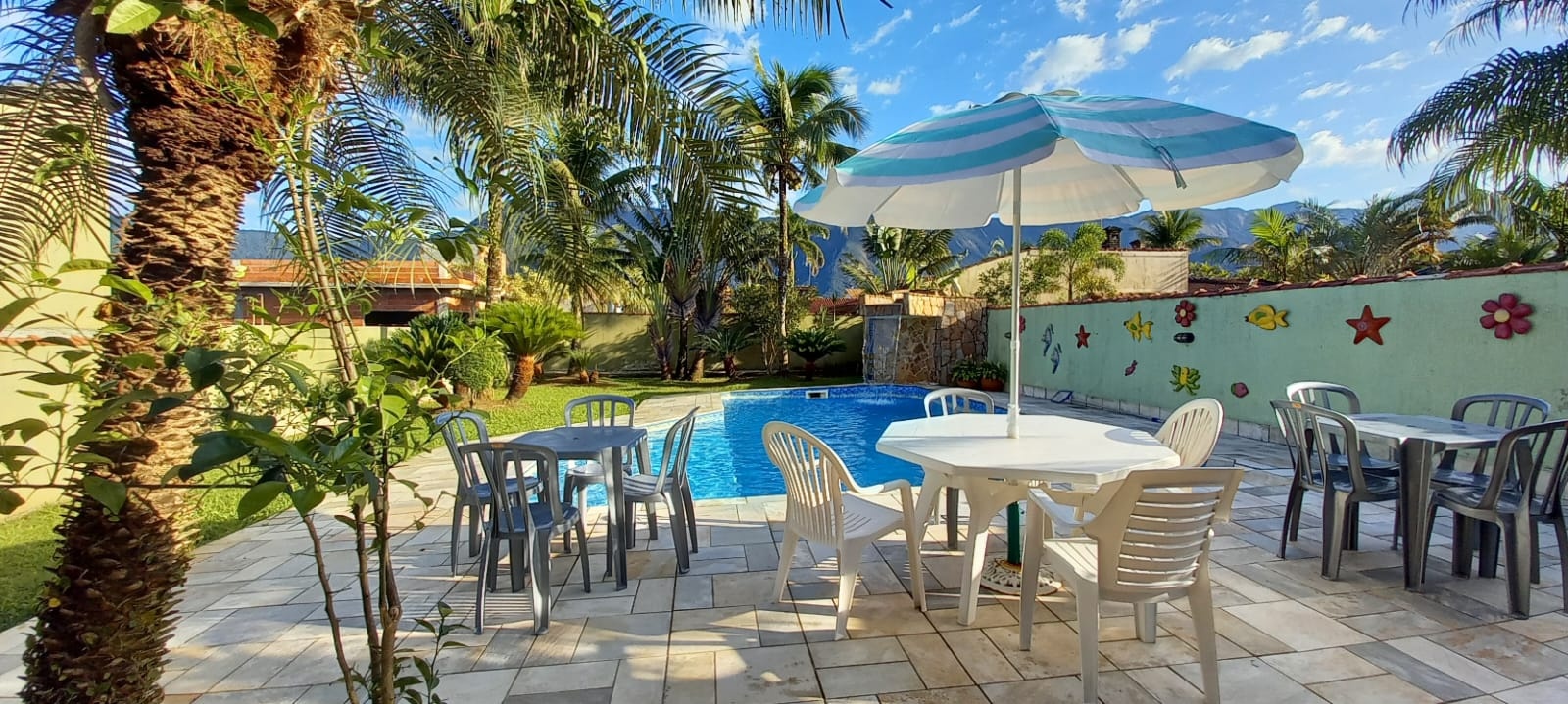 Outside, the property truly shines a large private pool with waterfall, a gourmet kitchen with barbecue and pizza oven, billiard table, and covered dining space create the perfect setting for entertaining family and friends. The lush garden with coconut and ornamental palms enhances the tropical atmosphere and provides privacy and natural shade throughout the day.