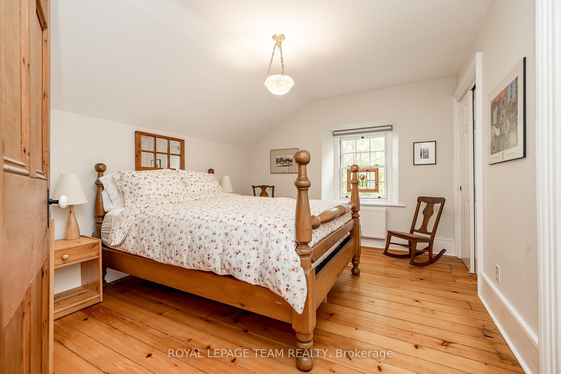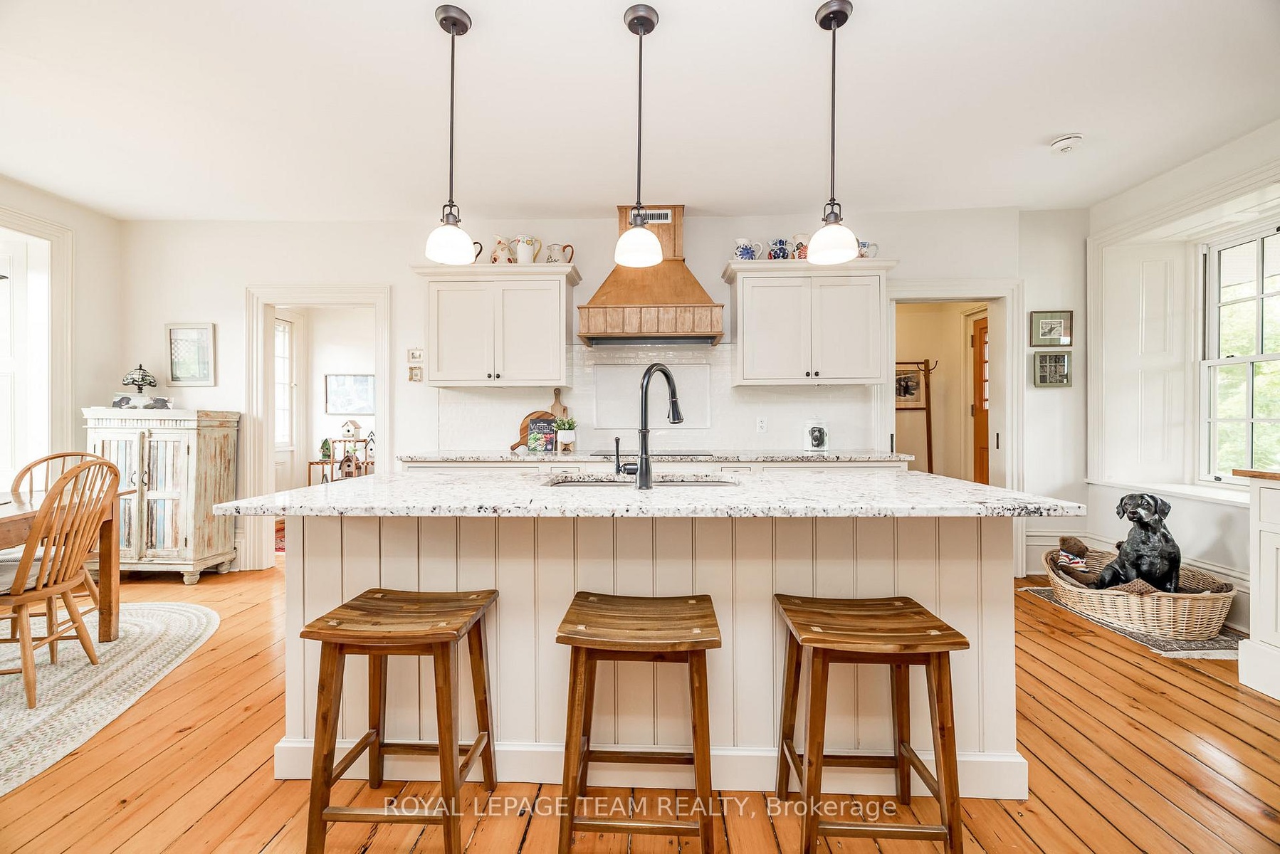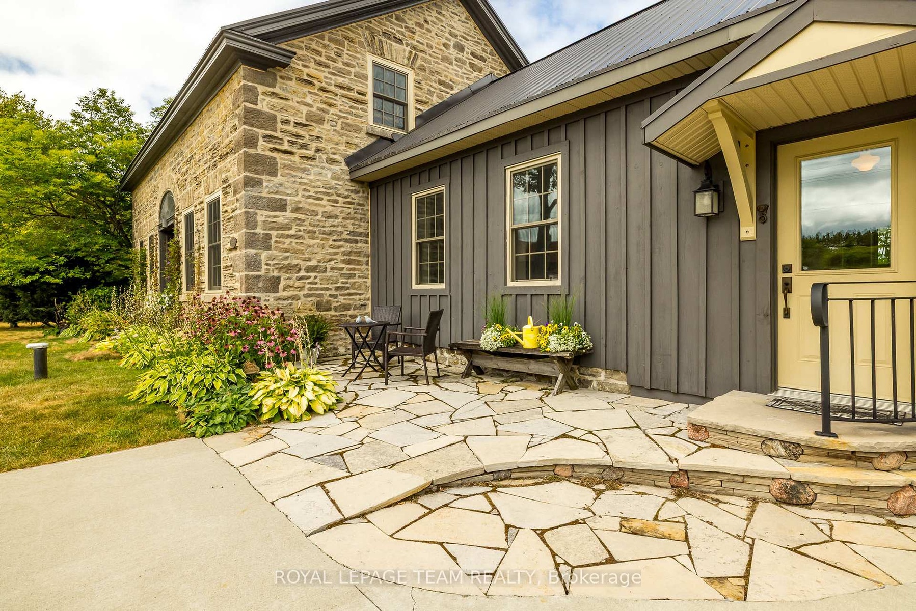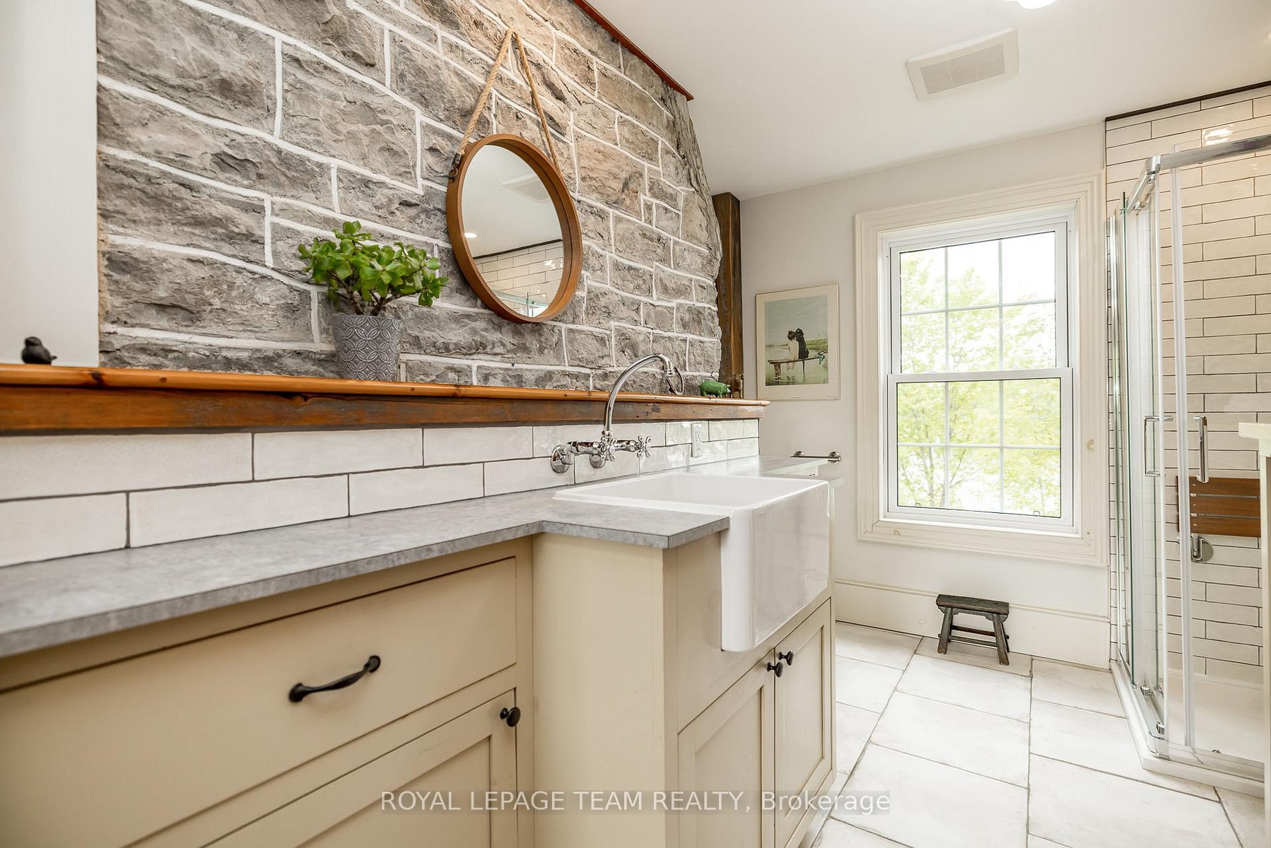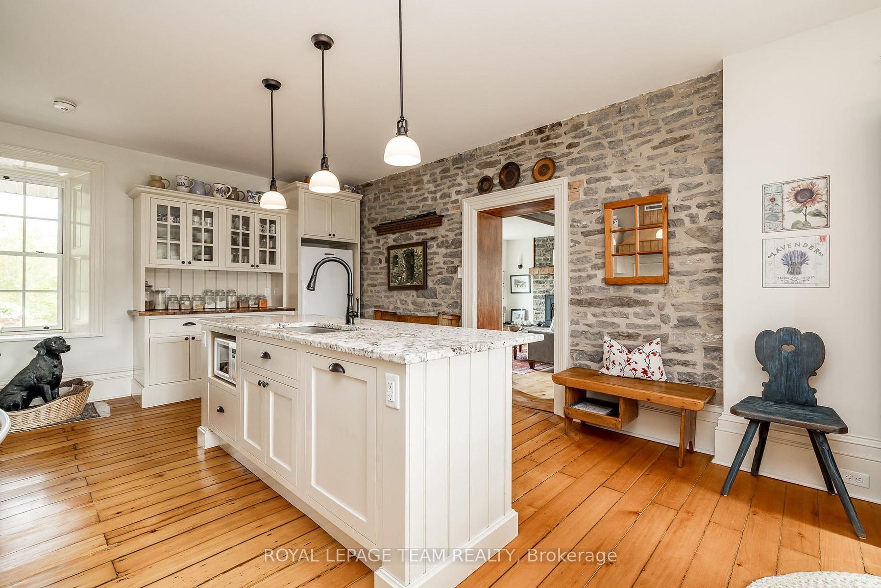 Welcome to Spillway Farm, circa 1835, a stunning waterfront stone home w/ exquisite custom renovations by Hubbard & Co! Located along the Rideau System, UNESCO World Heritage site, this breathtaking waterfront home offers a rare blend of preservation of historic allure w/contemporary convenience & design. Featuring 4 bedrooms + den, 3 full bathrooms & many elegant rooms for entertaining, this home is filled with natural light accentuating its inherent warmth & rich heritage. The custom kitchen w/waterfront view & exposed stone wall showcases luxury cabinetry, granite countertops, an island w/seating, refurbished wood floors & a pantry w/artistic coffee bar! The kitchen leads seamlessly to the elegant dining room w/deep window sills, wide baseboards & refurbished flooring, or to the majestic living room w/stone fireplace, wood hewn mantle & exceptional waterfront views! A side entrance w/inside entry to a garage w/additional loft storage space is conveniently adjacent a full bath/laundry room w/exposed stone wall, farmhouse drop sink & ample cupboard/counter space for laundry area. An office/den off the rear entry deck offers water views, deep window sills & refurbished original floors. The spacious second level showcases 4 bedrooms, one presently utilized as an office, a main bath w/sliding wood door, ample closet & storage space, deep window sills & refurbished floors. The primary bedroom leads to a gorgeous 4-piece ensuite bathroom w/penny round flooring, tiled shower, & a claw tub w/waterfront view! Landscaped w/stunning perennials, rose bushes, numerous tree varieties & a flag stone entry w/full concrete driveway. Rear tiered deck & porch offer many spaces for entertaining; aesthetic stairs lead to expansive dock for unparalleled sunset views! Spillway Farm is a paradise where you can watch loons, osprey, blue herons or traverse the spectacular Rideau waterway via boat from your Fendock; this tranquil waterfront oasis in a historic community awaits!