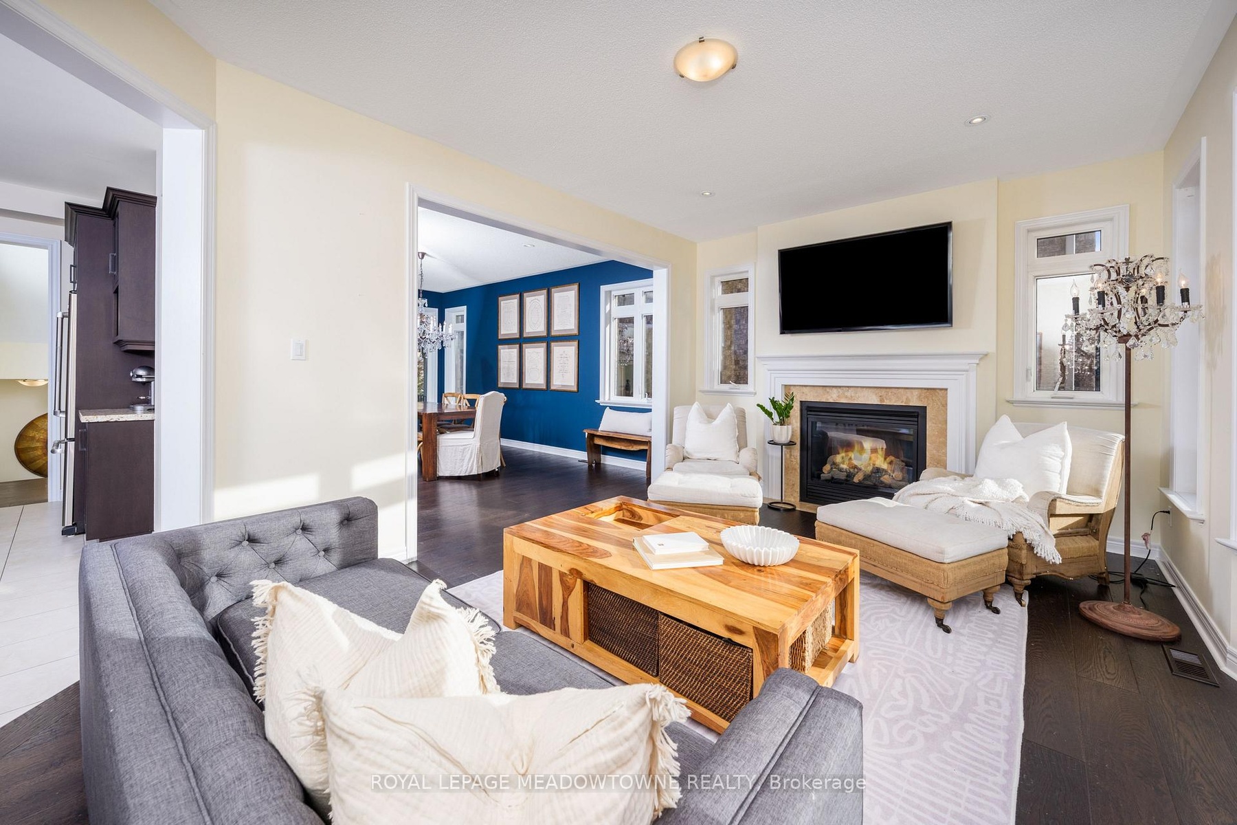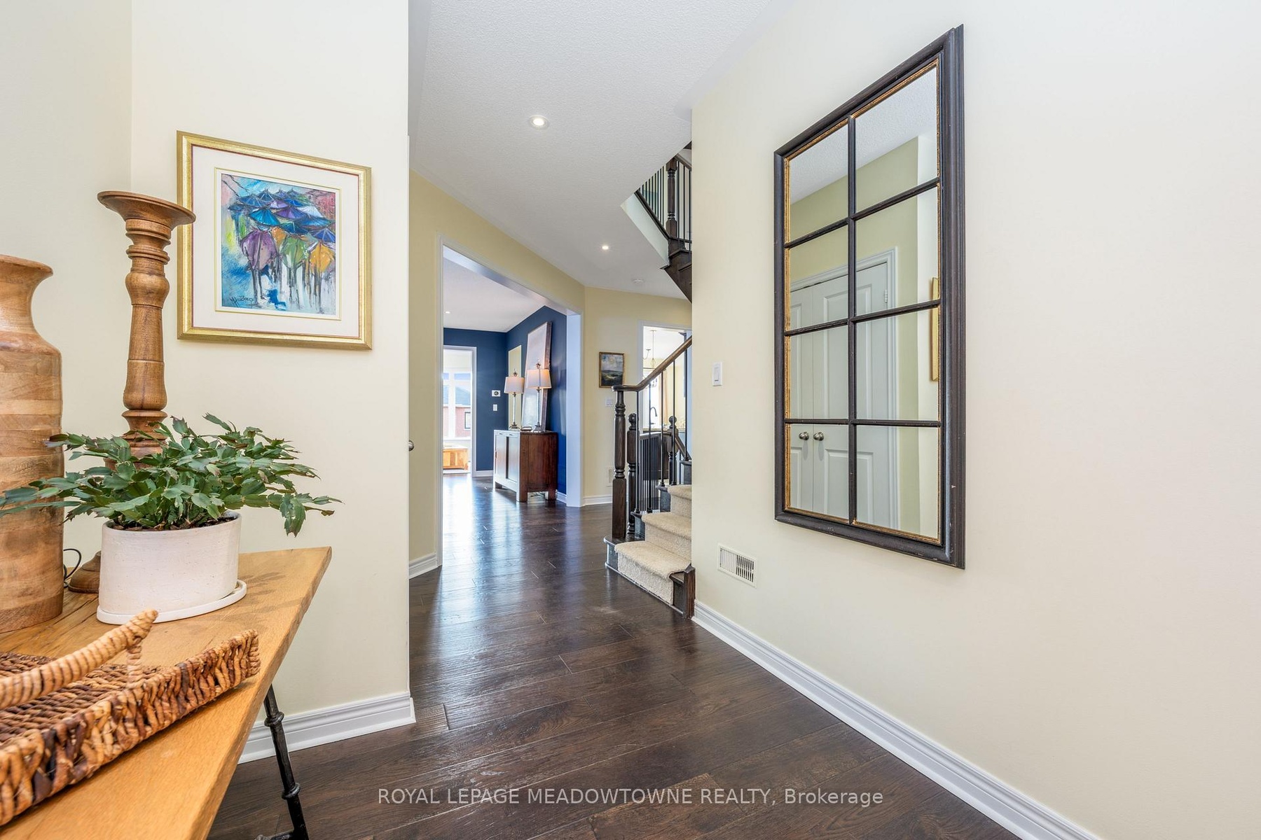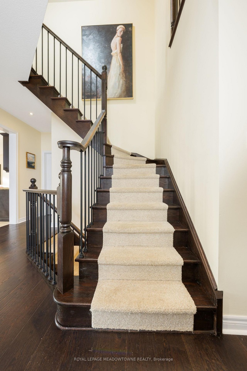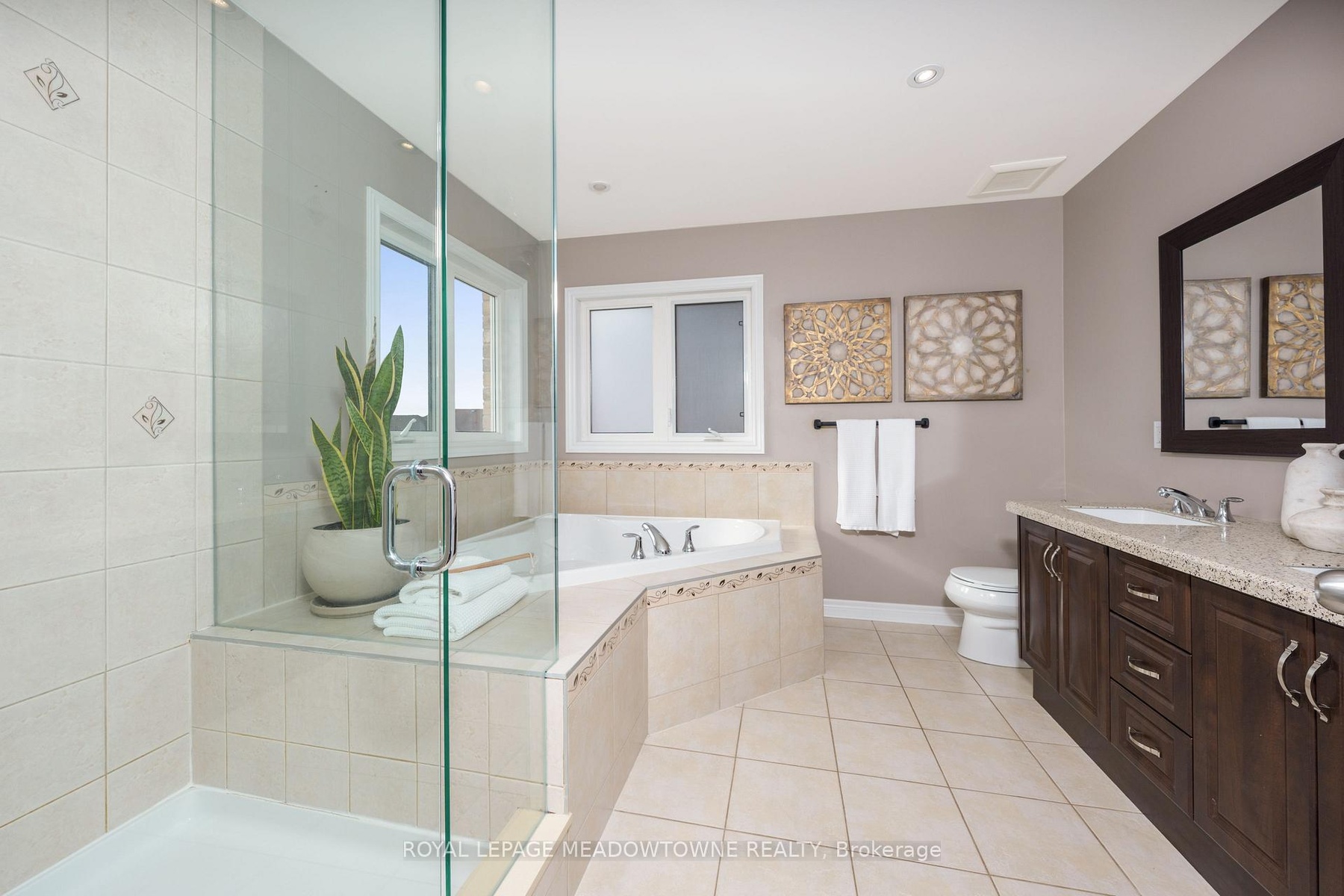 This move-in-ready Executive Double Oak-built 'Hanlon Creek' Model is nestled near the end of a quiet cul-de-sac and is sure to impress! The covered porch and Double Oak's signature solid oak front door welcome you into a spacious entryway, setting the tone for high-end craftsmanship found throughout the home. With over 3,600 square feet of living space, 4+1 beds, 5 baths, and 2 full kitchens, this home offers a practical yet elegant floor plan. The main level features soaring 9-ft ceilings, 7" hand-scraped hardwood floors (main and upper levels), and oak stairs with iron pickets open to above and below. The eat-in kitchen boasts tall upper cabinets, granite countertops, ss appliances, and a stylish backsplash. The bright breakfast area opens to a private deck through patio doors, while the formal dining room and inviting family room with a gas fireplace overlook the beautifully landscaped backyard. A powder room and mudroom with direct access to the double car garage adds everyday convenience. The primary suite is a private retreat with a spa-like 5 pce ensuite and walk-in closet. Three additional bedrooms complete this level - one with its own 3 pce ensuite, and another with a cheater ensuite to a 4 pce bath. The upper-level laundry room adds ease to your daily routine. The walkout lower level offers an ideal setup for multigenerational living or guest accommodations, complete with a second kitchen, stainless steel appliances and a gas cooktop, a comfortable bedroom, a welcoming family room with a gas fireplace, a luxurious 4-piece bath with heated floors, and extra laundry hookups. Oversized above-grade windows fill the lower space with natural light, and the walkout leads to a newly poured concrete patio and landscaping - the perfect spot for morning coffee or evening relaxation. Plus, the extra-long driveway with no sidewalk allows for four-car parking. Located within walking distance to schools, parks and access to the Hungry Hollow Trail across the street.