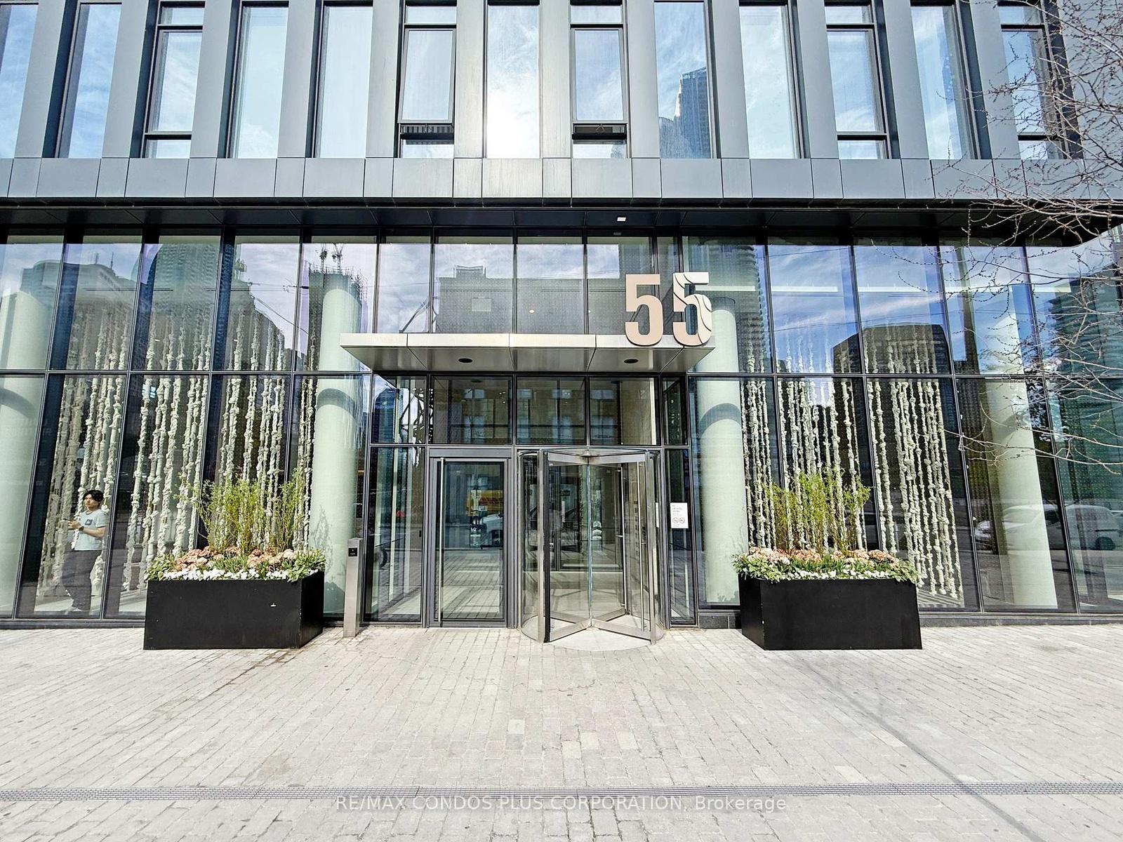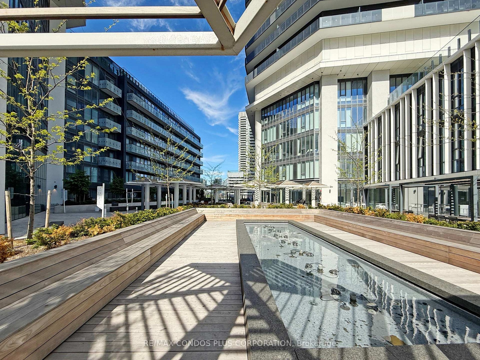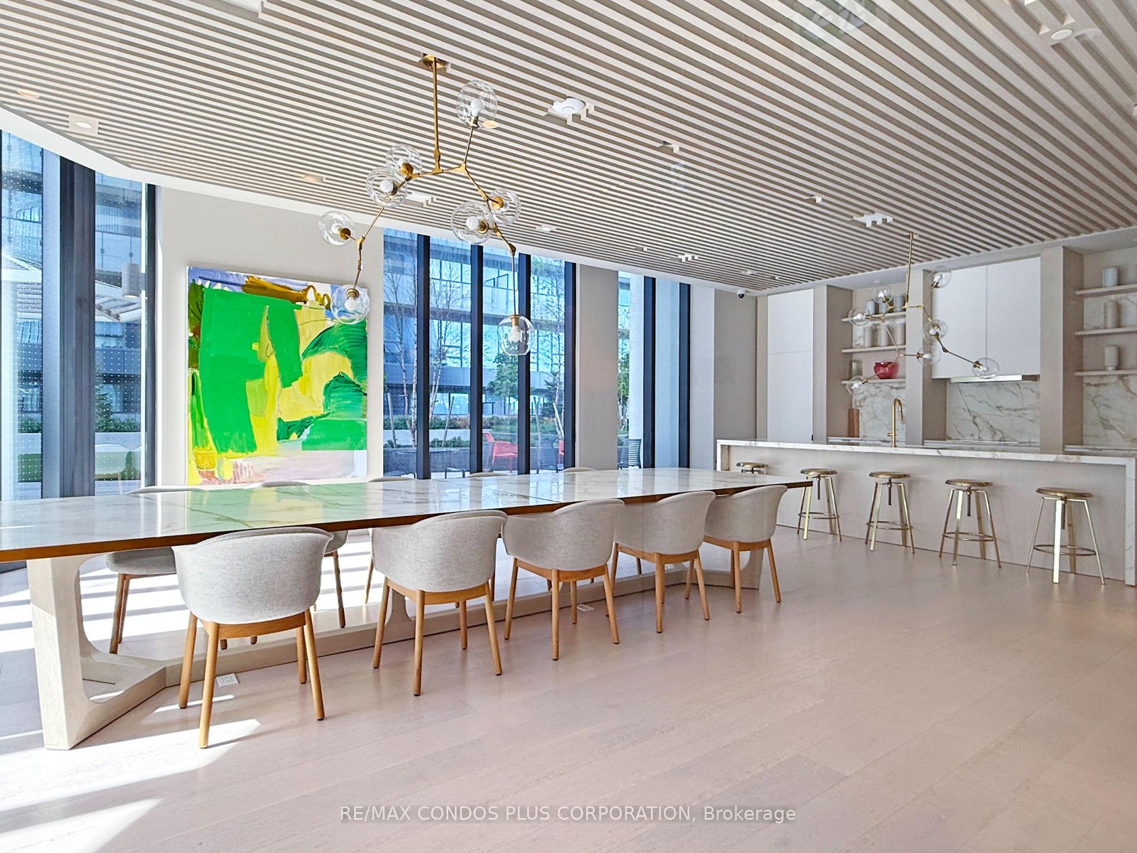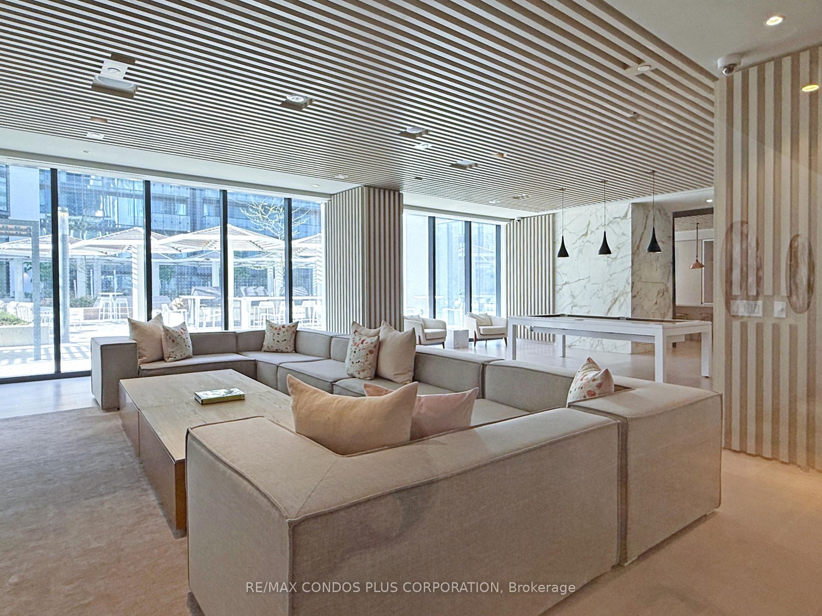 1+Den unit with 1 bath in family-oriented Sugar Wharf condos by Menkes, offering 664 sq. ft. of interior space plus a 157 sq. ft. balcony. This suite features 9' smooth-finish ceilings, laminate flooring throughout, and floor-to-ceiling windows. The open-concept kitchen includes custom-designed cabinetry with a pantry, engineered quartz countertops, a porcelain slab backsplash, integrated appliances, and track lighting. The primary bedroom offers a walk-in closet. The spacious den can function comfortably as a second bedroom. The modern 4-piece bathroom features a shower with a frameless clear glass door and open wall-mounted shelving for extra storage. The angled, architecturally designed balcony offers a partial south-facing view of the lake. Residents enjoy premium amenities including a grand 2-storey lobby with 24-hour concierge, a state-of-the-art fitness centre with aerobics and basketball courts, indoor lap pool, co-working rooms, party room with kitchen, social lounges, theatre rooms, hobby studio, kids play zone, hammock lounge, BBQ terrace, and hotel-style guest suites. Walking distance to the waterfront, Sugar Beach, parks, Union Station, St. Lawrence Market, and the Financial District. Just steps to shops, restaurants, Farm Boy, Loblaws, LCBO, and future direct PATH access with an on-site school planned. Ready to Move in