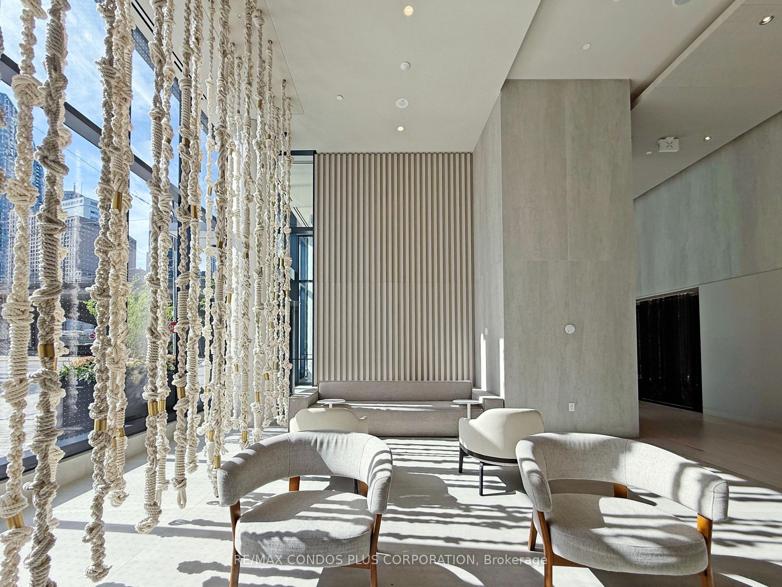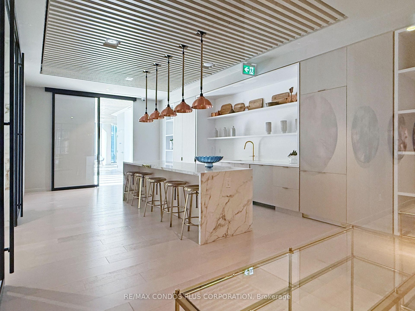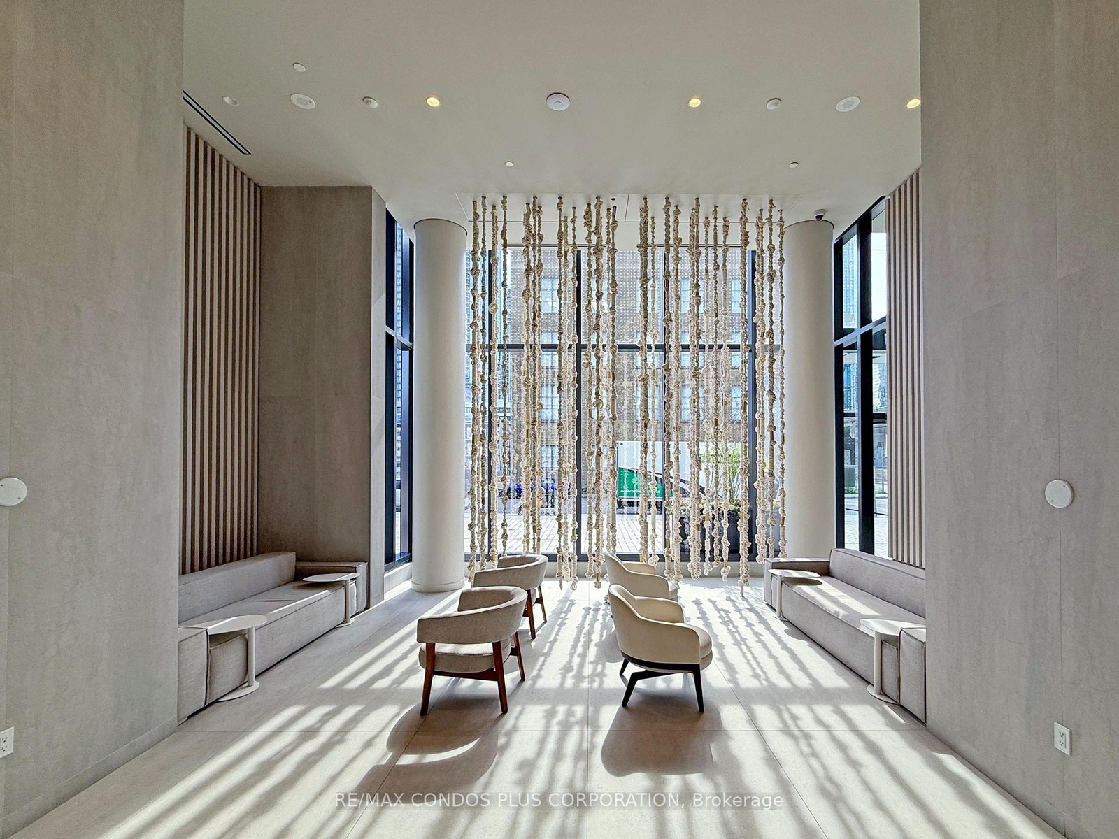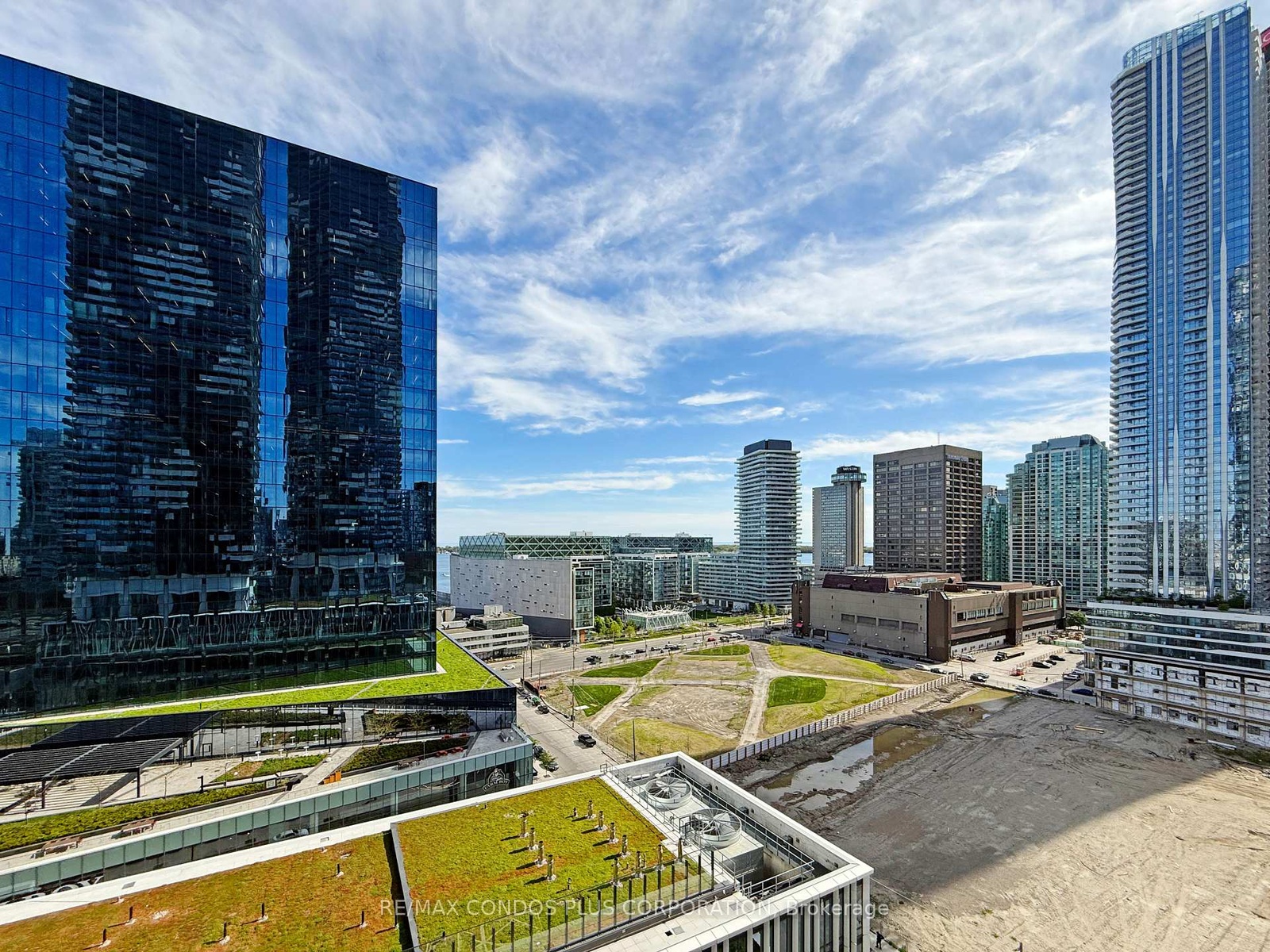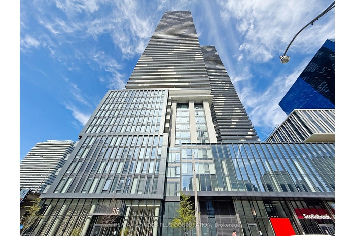 1+Den unit with 1 bath in family-oriented Sugar Wharf condos by Menkes, offering 664 sq. ft. of interior space plus a 157 sq. ft. balcony. This suite features 9' smooth-finish ceilings, laminate flooring throughout, and floor-to-ceiling windows. The open-concept kitchen includes custom-designed cabinetry with a pantry, engineered quartz countertops, a porcelain slab backsplash, integrated appliances, and track lighting. The primary bedroom offers a walk-in closet. The spacious den can function comfortably as a second bedroom. The modern 4-piece bathroom features a shower with a frameless clear glass door and open wall-mounted shelving for extra storage. The angled, architecturally designed balcony offers a partial south-facing view of the lake. Residents enjoy premium amenities including a grand 2-storey lobby with 24-hour concierge, a state-of-the-art fitness centre with aerobics and basketball courts, indoor lap pool, co-working rooms, party room with kitchen, social lounges, theatre rooms, hobby studio, kids play zone, hammock lounge, BBQ terrace, and hotel-style guest suites. Walking distance to the waterfront, Sugar Beach, parks, Union Station, St. Lawrence Market, and the Financial District. Just steps to shops, restaurants, Farm Boy, Loblaws, LCBO, and future direct PATH access with an on-site school planned. Ready to Move in
