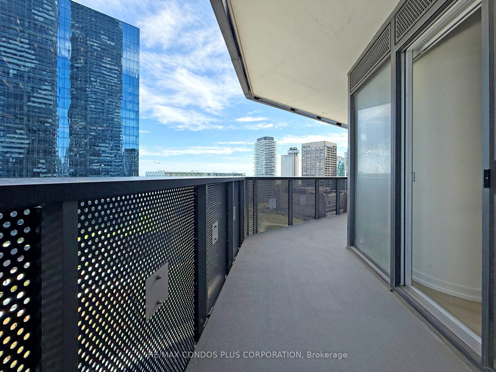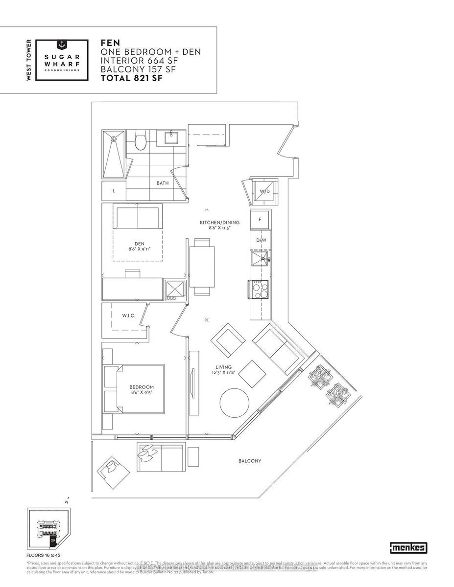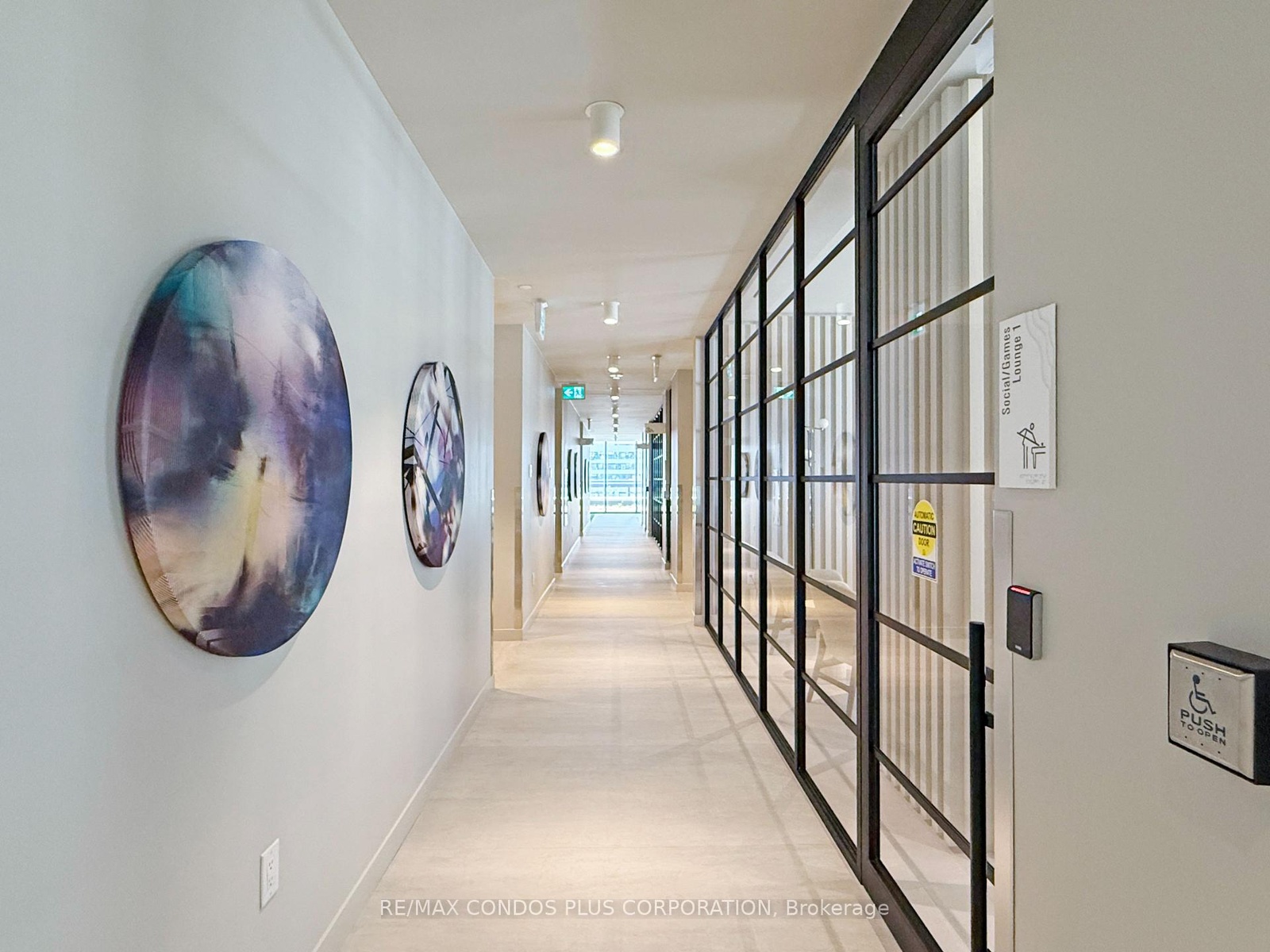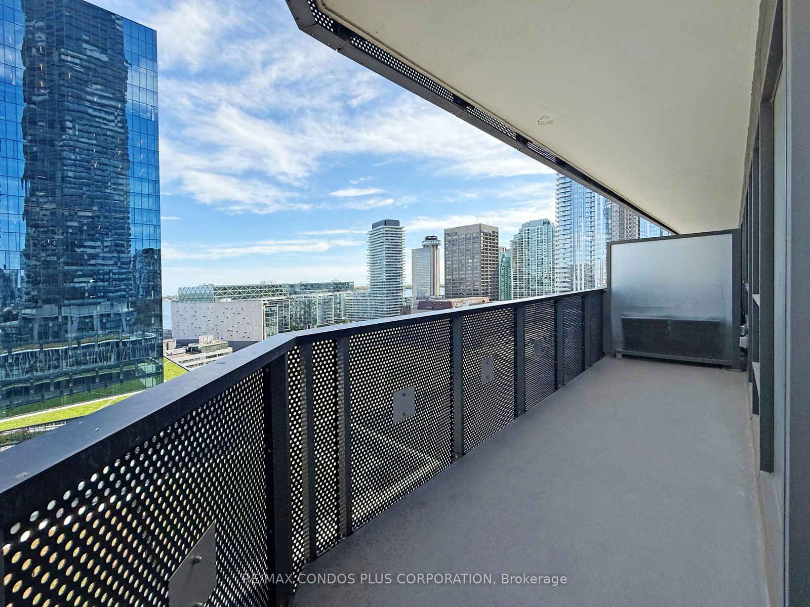 1+Den unit with 1 bath in family-oriented Sugar Wharf condos by Menkes, offering 664 sq. ft. of interior space plus a 157 sq. ft. balcony. This suite features 9' smooth-finish ceilings, laminate flooring throughout, and floor-to-ceiling windows. The open-concept kitchen includes custom-designed cabinetry with a pantry, engineered quartz countertops, a porcelain slab backsplash, integrated appliances, and track lighting. The primary bedroom offers a walk-in closet. The spacious den can function comfortably as a second bedroom. The modern 4-piece bathroom features a shower with a frameless clear glass door and open wall-mounted shelving for extra storage. The angled, architecturally designed balcony offers a partial south-facing view of the lake. Residents enjoy premium amenities including a grand 2-storey lobby with 24-hour concierge, a state-of-the-art fitness centre with aerobics and basketball courts, indoor lap pool, co-working rooms, party room with kitchen, social lounges, theatre rooms, hobby studio, kids play zone, hammock lounge, BBQ terrace, and hotel-style guest suites. Walking distance to the waterfront, Sugar Beach, parks, Union Station, St. Lawrence Market, and the Financial District. Just steps to shops, restaurants, Farm Boy, Loblaws, LCBO, and future direct PATH access with an on-site school planned. Ready to Move in
