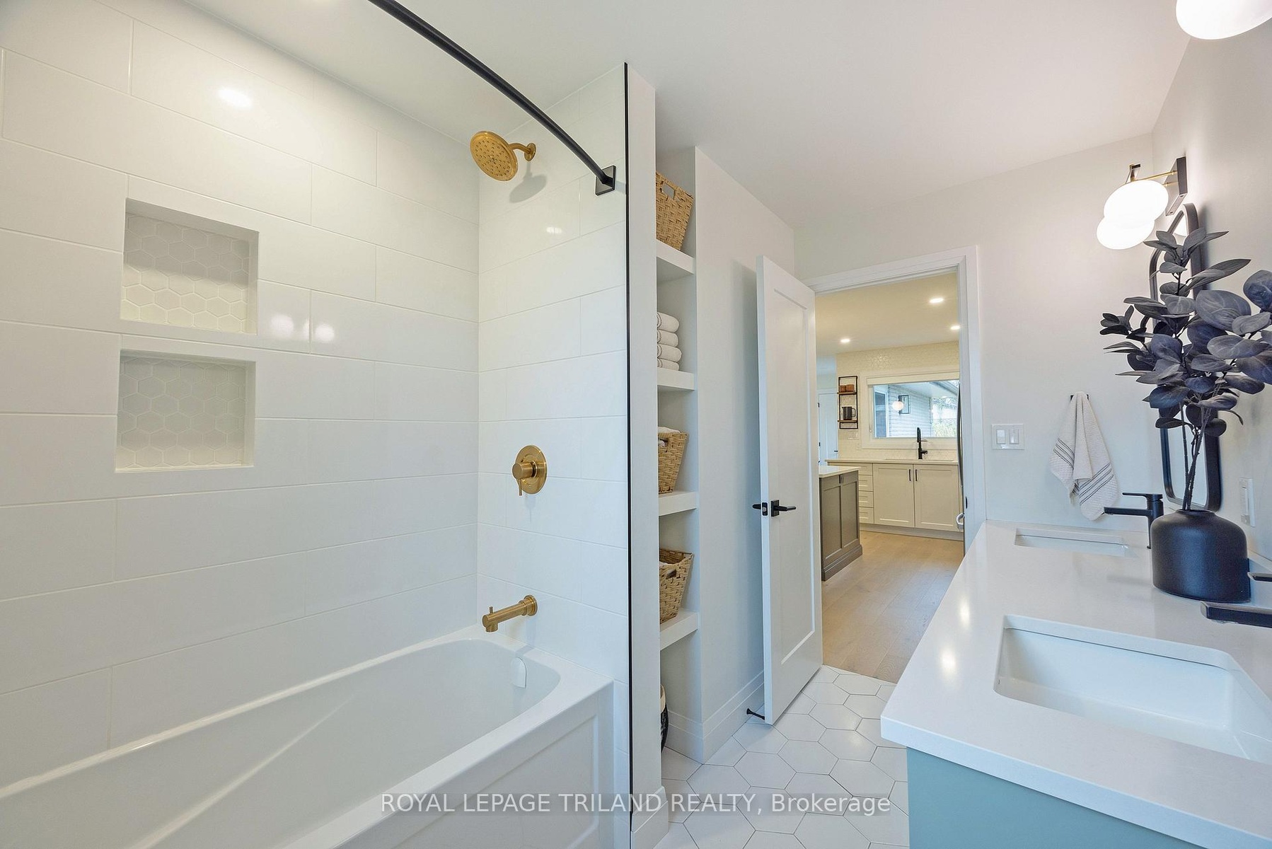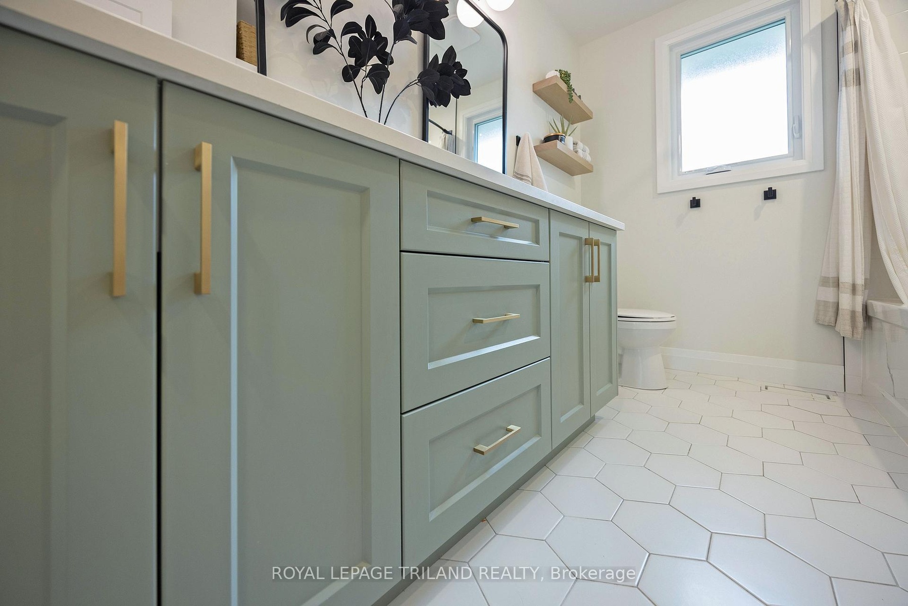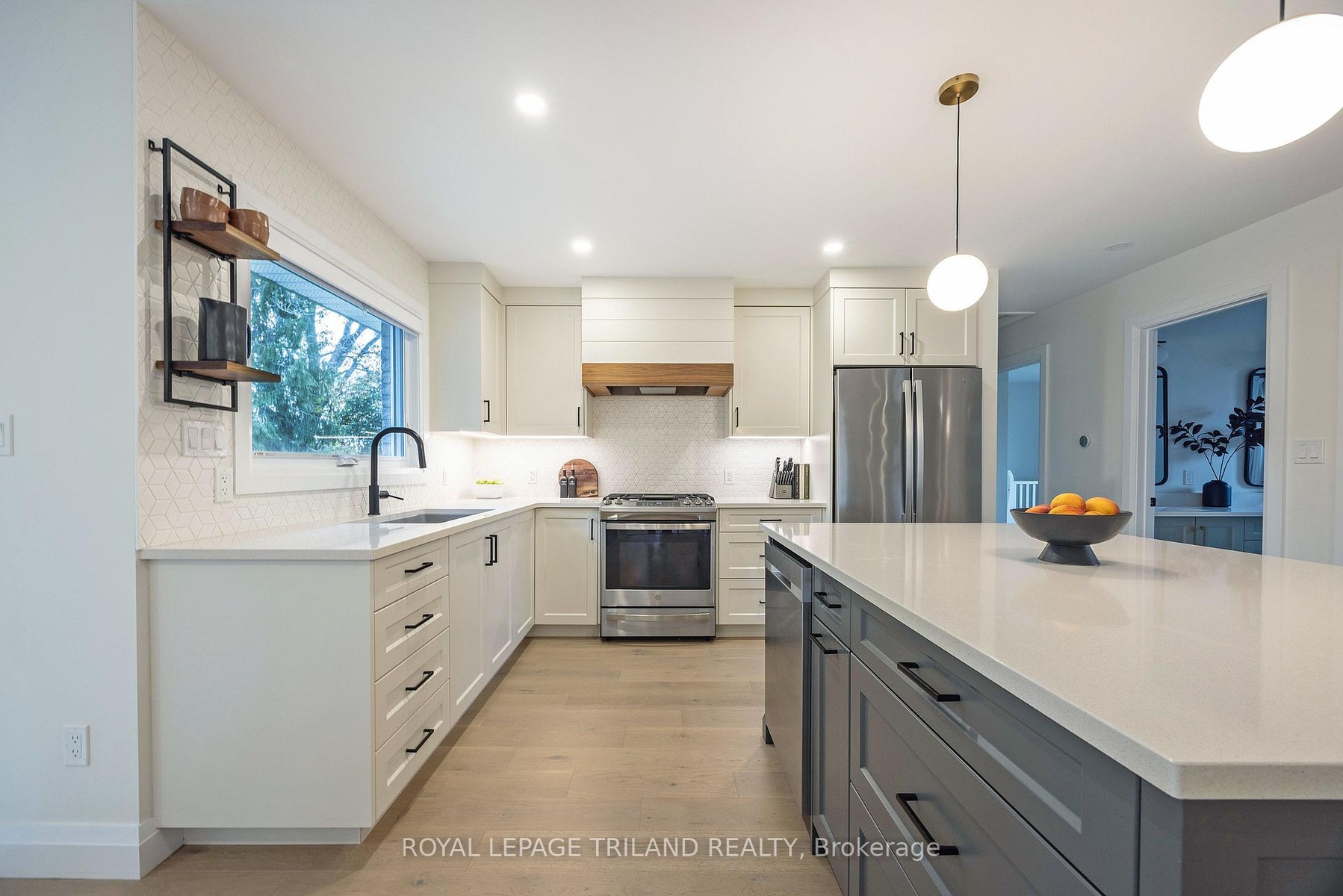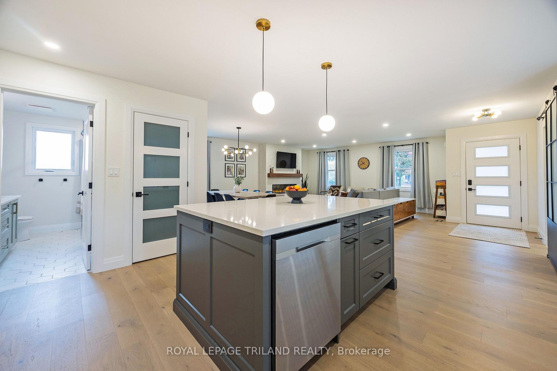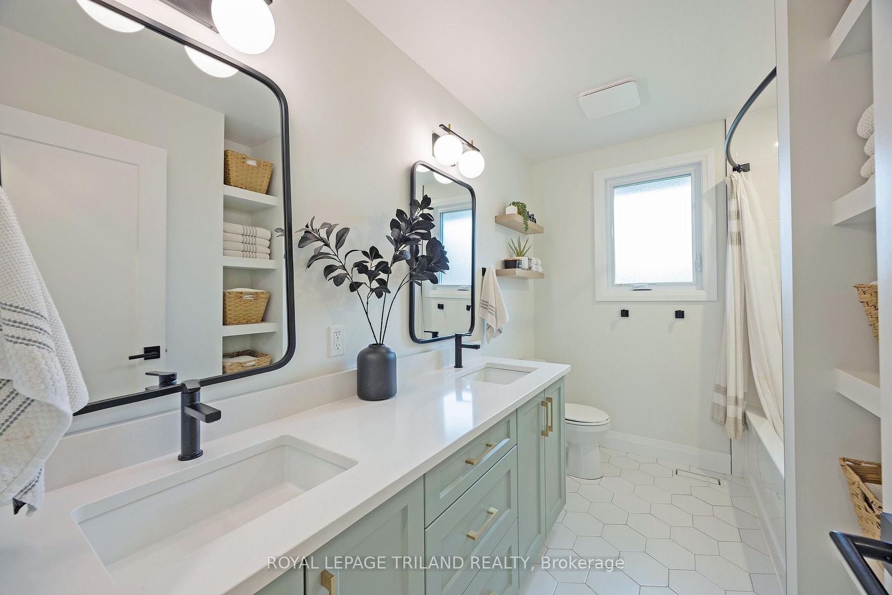Prepare to be impressed by this beautifully renovated 4-bedroom, 3-bathroom bungalow in the sought-after Old Lynhurst Village! Nestled in a quiet, tree-lined neighbourhood in North St. Thomas (Southwold), this home offers a modern feel with convenient access to Wellington Rd. and Hwy 401. The main level showcases a functional open concept design, engineered white oak hardwood and tile flooring, pot lights & quality finishes. The mudroom/laundry area offers custom cabinetry & sink, included washer/dryer, and garage access. The inviting living room features an electric fireplace with a decorative beam, while the stunning GCW kitchen boasts quartz countertops & island, a walk-in pantry, backsplash, included appliances, and an undermount sink overlooking the yard. The open concept dining space is great for entertaining and the layout features sliding door access to a patio and the deep, treed backyard. The spacious primary suite addition offers backyard view, upgraded sound-batting, accent feature wall, tray ceiling with potlights & fan, walk-in closet, and a luxurious 5-pc ensuite with quartz double vanity, soaker tub and tiled shower with rain head. Two additional bedrooms feature closets & solid-core entry doors & there's a stunning bathroom with double quartz top vanity, tub/shower & built-in shelving for storage. The fully finished lower level (2025) includes noise-reducing resilient-channel ceilings, a large rec room, bedroom with closet, walk-in storage closet, and a full bathroom with quartz vanity, shower and tiled floors. Extensive updates include shingles, soffits, fascia, eaves, garage door, electrical wiring, plumbing, hot-water recirculation pump, underground service, and a 100-amp panel with 50 amp garage subpanel. Nothing to do but move in!