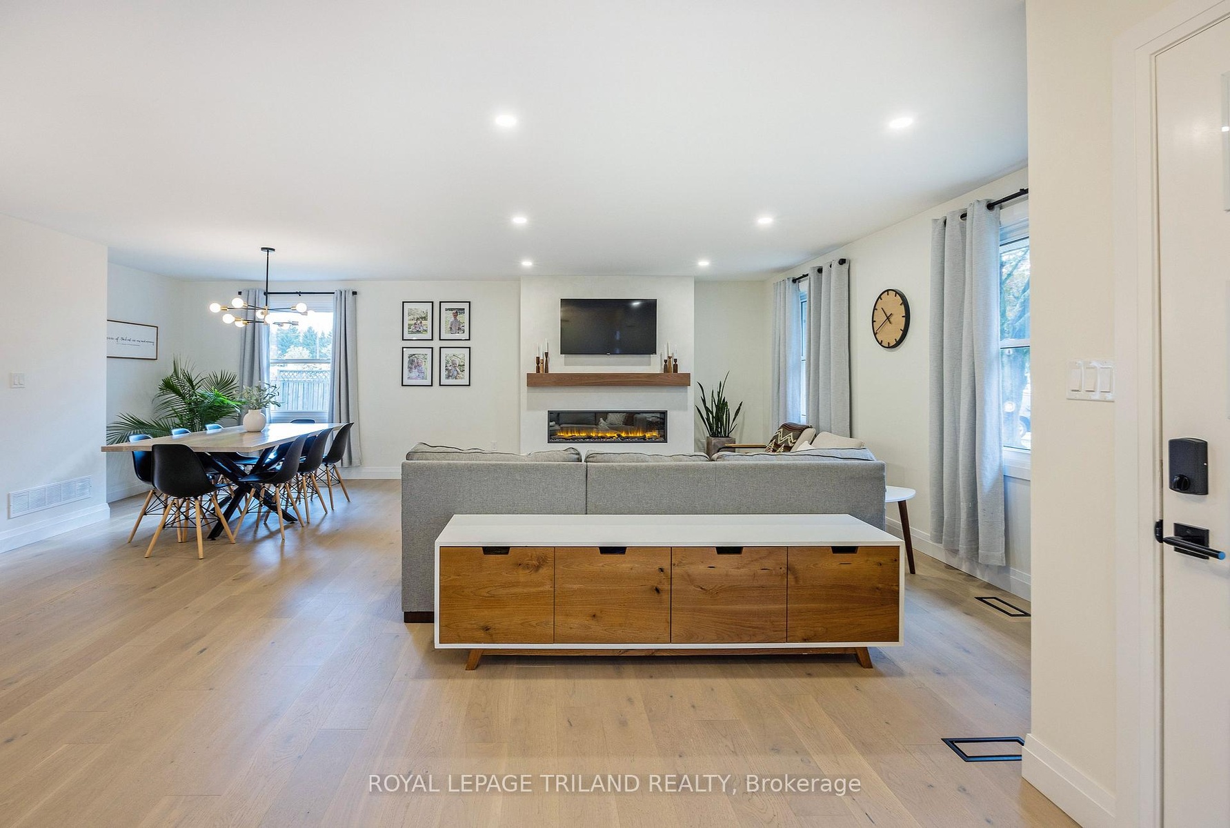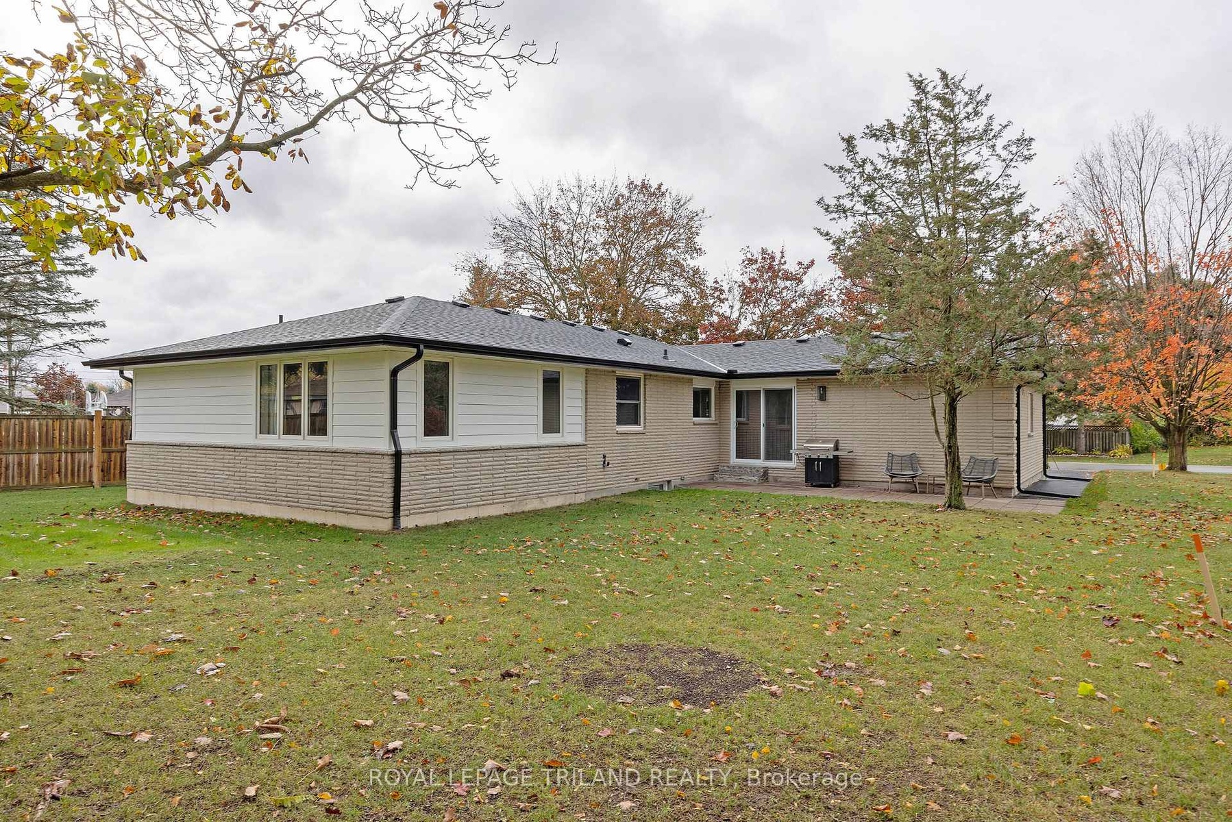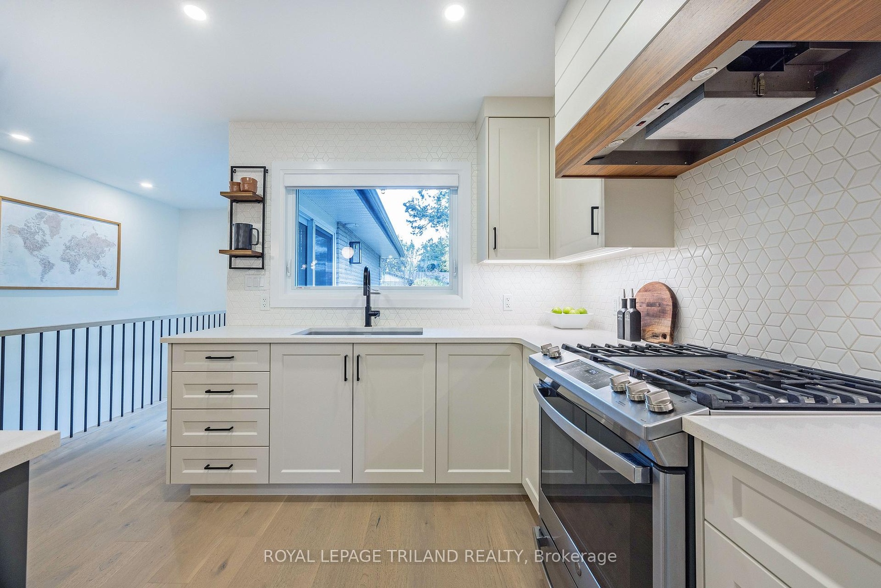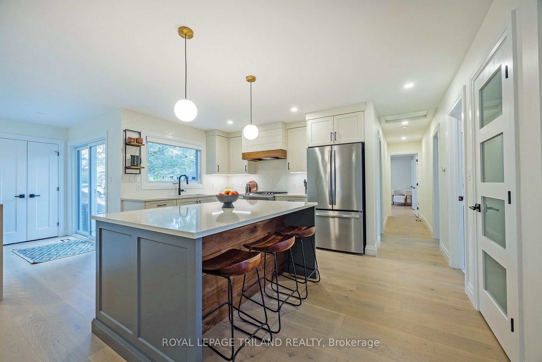 Prepare to be impressed by this beautifully renovated 4-bedroom, 3-bathroom bungalow in the sought-after Old Lynhurst Village! Nestled in a quiet, tree-lined neighbourhood in North St. Thomas (Southwold), this home offers a modern feel with convenient access to Wellington Rd. and Hwy 401. The main level showcases a functional open concept design, engineered white oak hardwood and tile flooring, pot lights & quality finishes. The mudroom/laundry area offers custom cabinetry & sink, included washer/dryer, and garage access. The inviting living room features an electric fireplace with a decorative beam, while the stunning GCW kitchen boasts quartz countertops & island, a walk-in pantry, backsplash, included appliances, and an undermount sink overlooking the yard. The open concept dining space is great for entertaining and the layout features sliding door access to a patio and the deep, treed backyard. The spacious primary suite addition offers backyard view, upgraded sound-batting, accent feature wall, tray ceiling with potlights & fan, walk-in closet, and a luxurious 5-pc ensuite with quartz double vanity, soaker tub and tiled shower with rain head. Two additional bedrooms feature closets & solid-core entry doors & there's a stunning bathroom with double quartz top vanity, tub/shower & built-in shelving for storage. The fully finished lower level (2025) includes noise-reducing resilient-channel ceilings, a large rec room, bedroom with closet, walk-in storage closet, and a full bathroom with quartz vanity, shower and tiled floors. Extensive updates include shingles, soffits, fascia, eaves, garage door, electrical wiring, plumbing, hot-water recirculation pump, underground service, and a 100-amp panel with 50 amp garage subpanel. Nothing to do but move in!