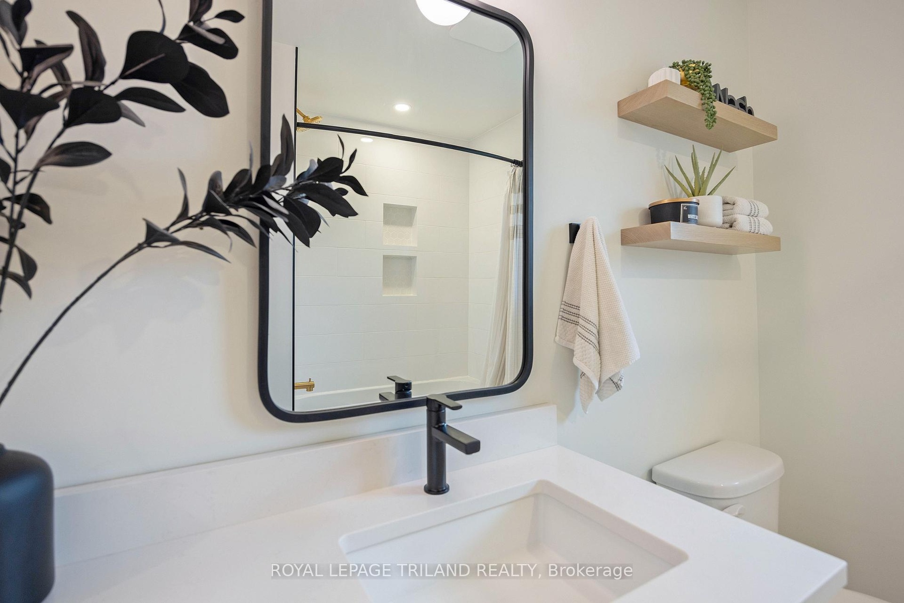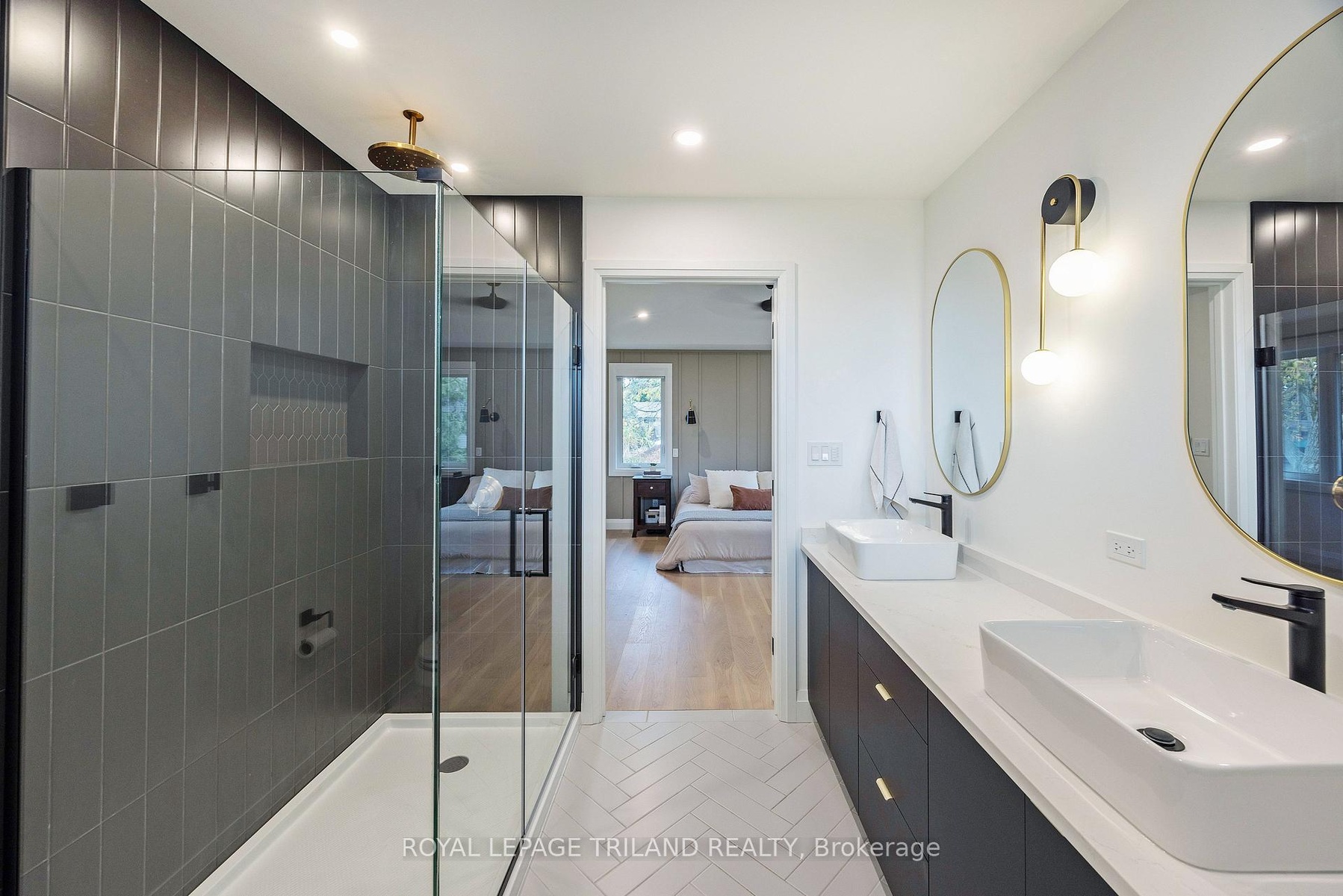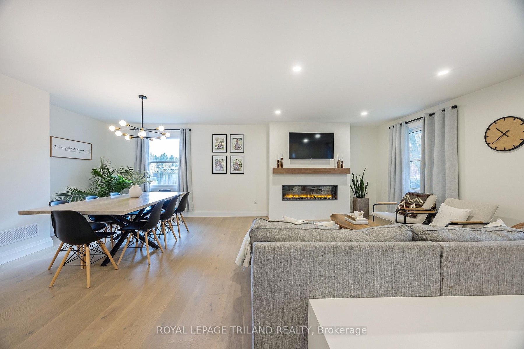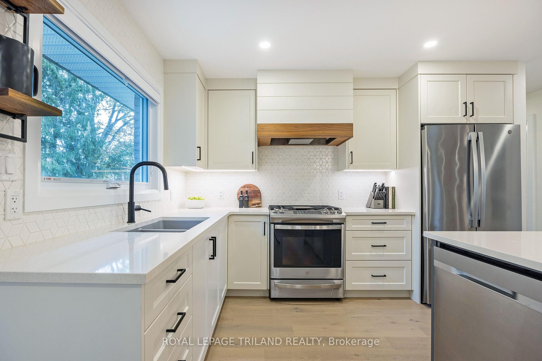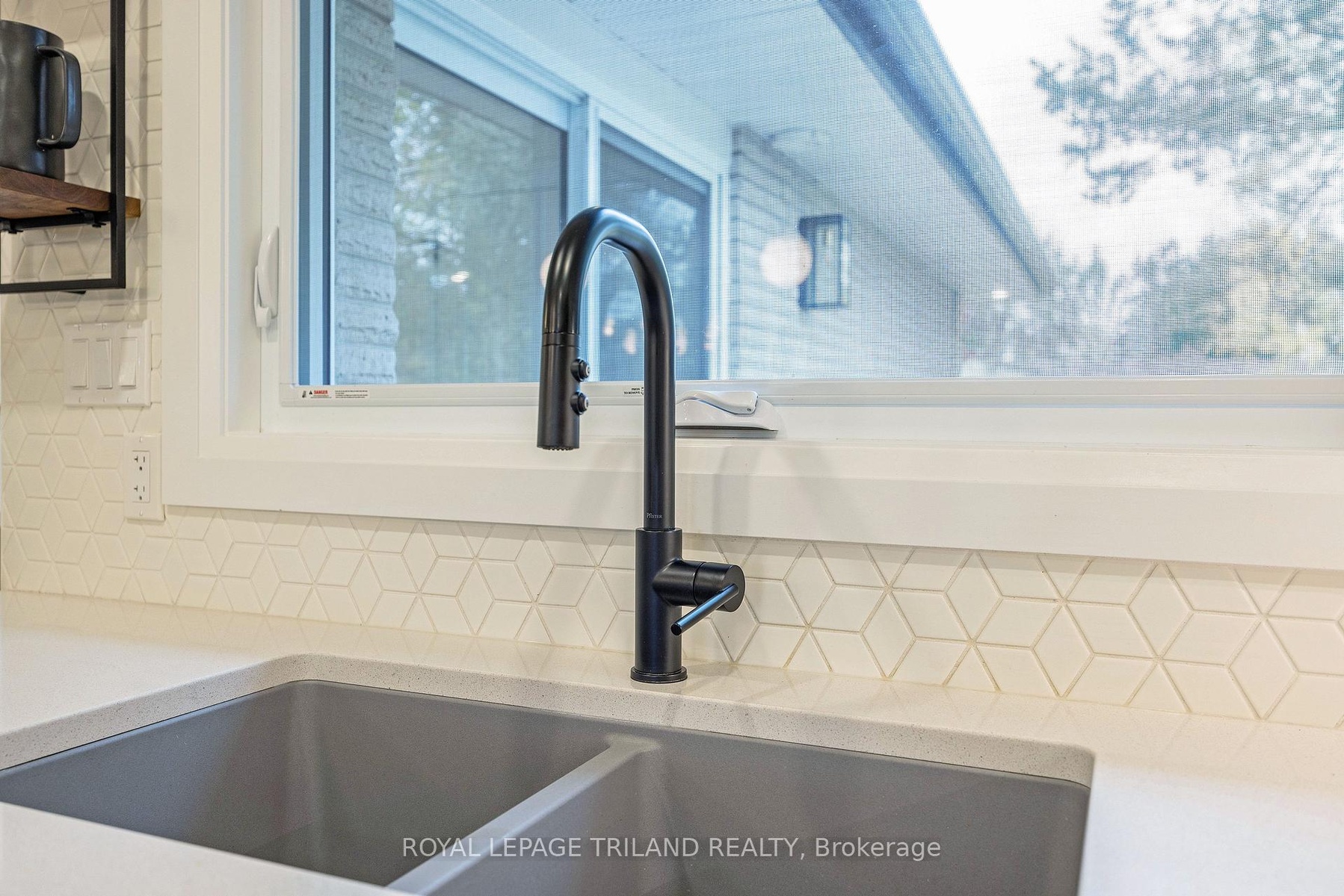 Prepare to be impressed by this beautifully renovated 4-bedroom, 3-bathroom bungalow in the sought-after Old Lynhurst Village! Nestled in a quiet, tree-lined neighbourhood in North St. Thomas (Southwold), this home offers a modern feel with convenient access to Wellington Rd. and Hwy 401. The main level showcases a functional open concept design, engineered white oak hardwood and tile flooring, pot lights & quality finishes. The mudroom/laundry area offers custom cabinetry & sink, included washer/dryer, and garage access. The inviting living room features an electric fireplace with a decorative beam, while the stunning GCW kitchen boasts quartz countertops & island, a walk-in pantry, backsplash, included appliances, and an undermount sink overlooking the yard. The open concept dining space is great for entertaining and the layout features sliding door access to a patio and the deep, treed backyard. The spacious primary suite addition offers backyard view, upgraded sound-batting, accent feature wall, tray ceiling with potlights & fan, walk-in closet, and a luxurious 5-pc ensuite with quartz double vanity, soaker tub and tiled shower with rain head. Two additional bedrooms feature closets & solid-core entry doors & there's a stunning bathroom with double quartz top vanity, tub/shower & built-in shelving for storage. The fully finished lower level (2025) includes noise-reducing resilient-channel ceilings, a large rec room, bedroom with closet, walk-in storage closet, and a full bathroom with quartz vanity, shower and tiled floors. Extensive updates include shingles, soffits, fascia, eaves, garage door, electrical wiring, plumbing, hot-water recirculation pump, underground service, and a 100-amp panel with 50 amp garage subpanel. Nothing to do but move in!