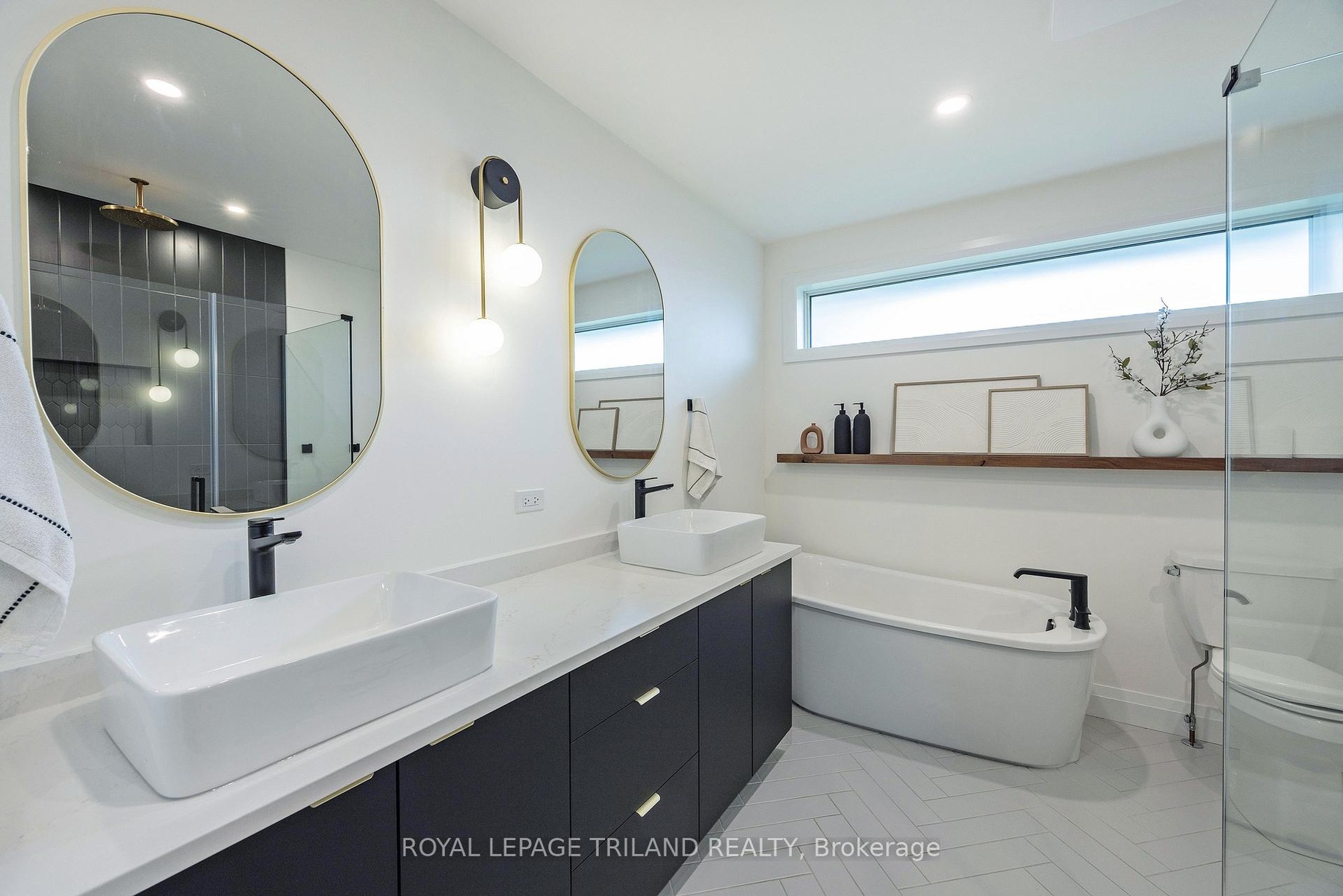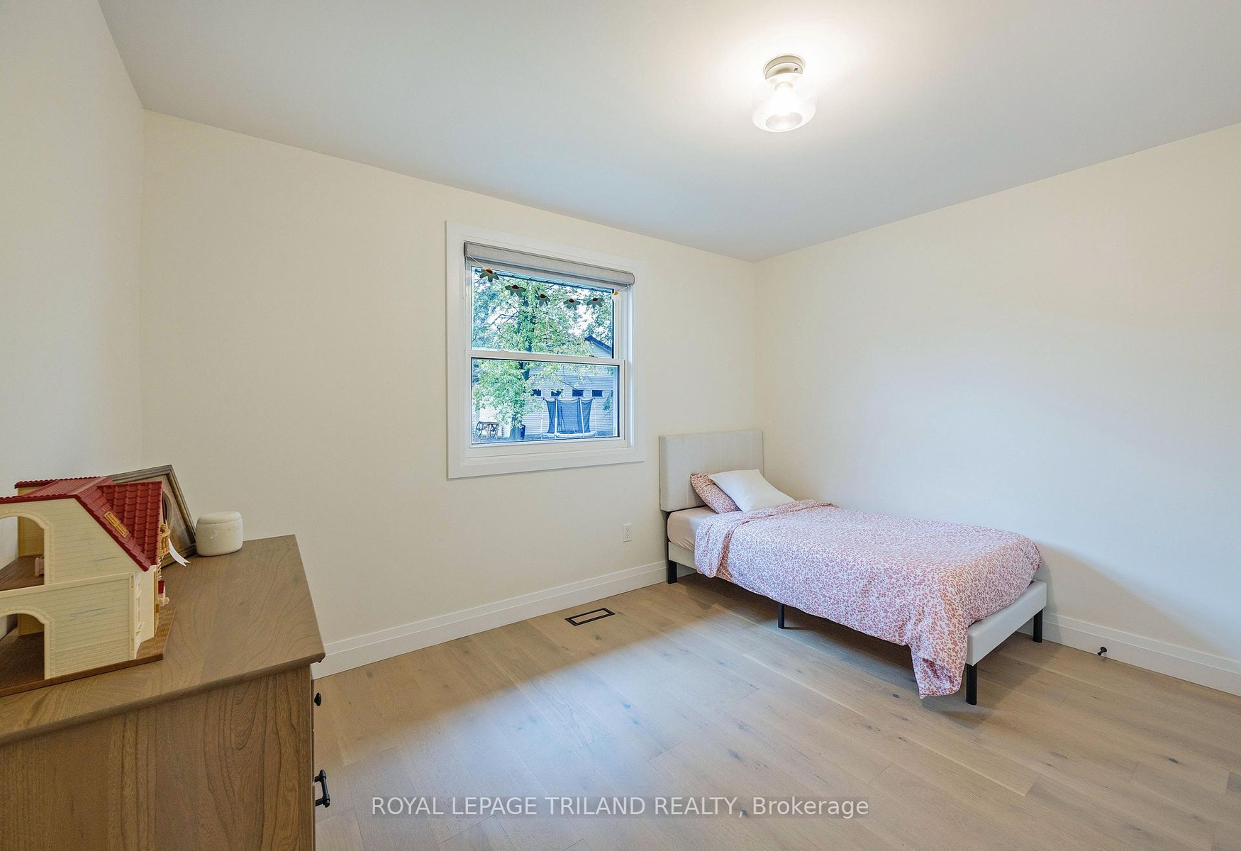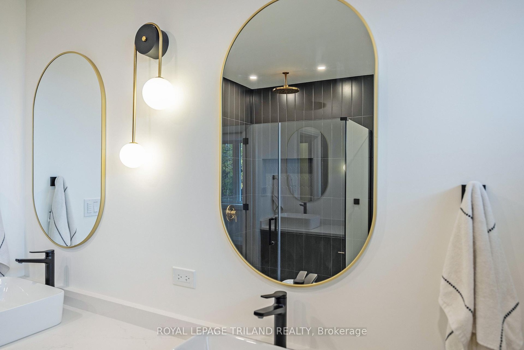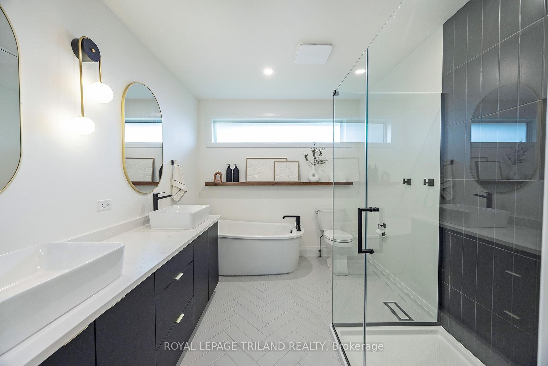 Prepare to be impressed by this beautifully renovated 4-bedroom, 3-bathroom bungalow in the sought-after Old Lynhurst Village! Nestled in a quiet, tree-lined neighbourhood in North St. Thomas (Southwold), this home offers a modern feel with convenient access to Wellington Rd. and Hwy 401. The main level showcases a functional open concept design, engineered white oak hardwood and tile flooring, pot lights & quality finishes. The mudroom/laundry area offers custom cabinetry & sink, included washer/dryer, and garage access. The inviting living room features an electric fireplace with a decorative beam, while the stunning GCW kitchen boasts quartz countertops & island, a walk-in pantry, backsplash, included appliances, and an undermount sink overlooking the yard. The open concept dining space is great for entertaining and the layout features sliding door access to a patio and the deep, treed backyard. The spacious primary suite addition offers backyard view, upgraded sound-batting, accent feature wall, tray ceiling with potlights & fan, walk-in closet, and a luxurious 5-pc ensuite with quartz double vanity, soaker tub and tiled shower with rain head. Two additional bedrooms feature closets & solid-core entry doors & there's a stunning bathroom with double quartz top vanity, tub/shower & built-in shelving for storage. The fully finished lower level (2025) includes noise-reducing resilient-channel ceilings, a large rec room, bedroom with closet, walk-in storage closet, and a full bathroom with quartz vanity, shower and tiled floors. Extensive updates include shingles, soffits, fascia, eaves, garage door, electrical wiring, plumbing, hot-water recirculation pump, underground service, and a 100-amp panel with 50 amp garage subpanel. Nothing to do but move in!