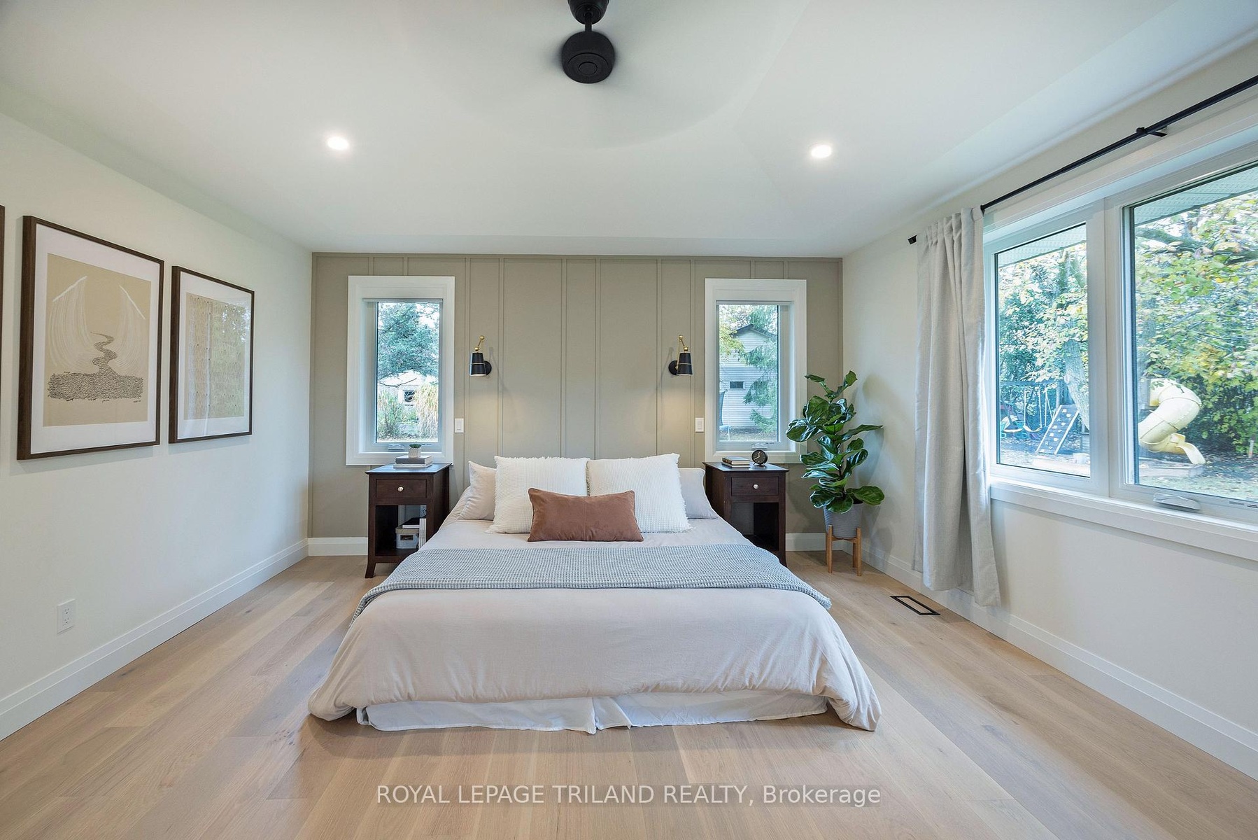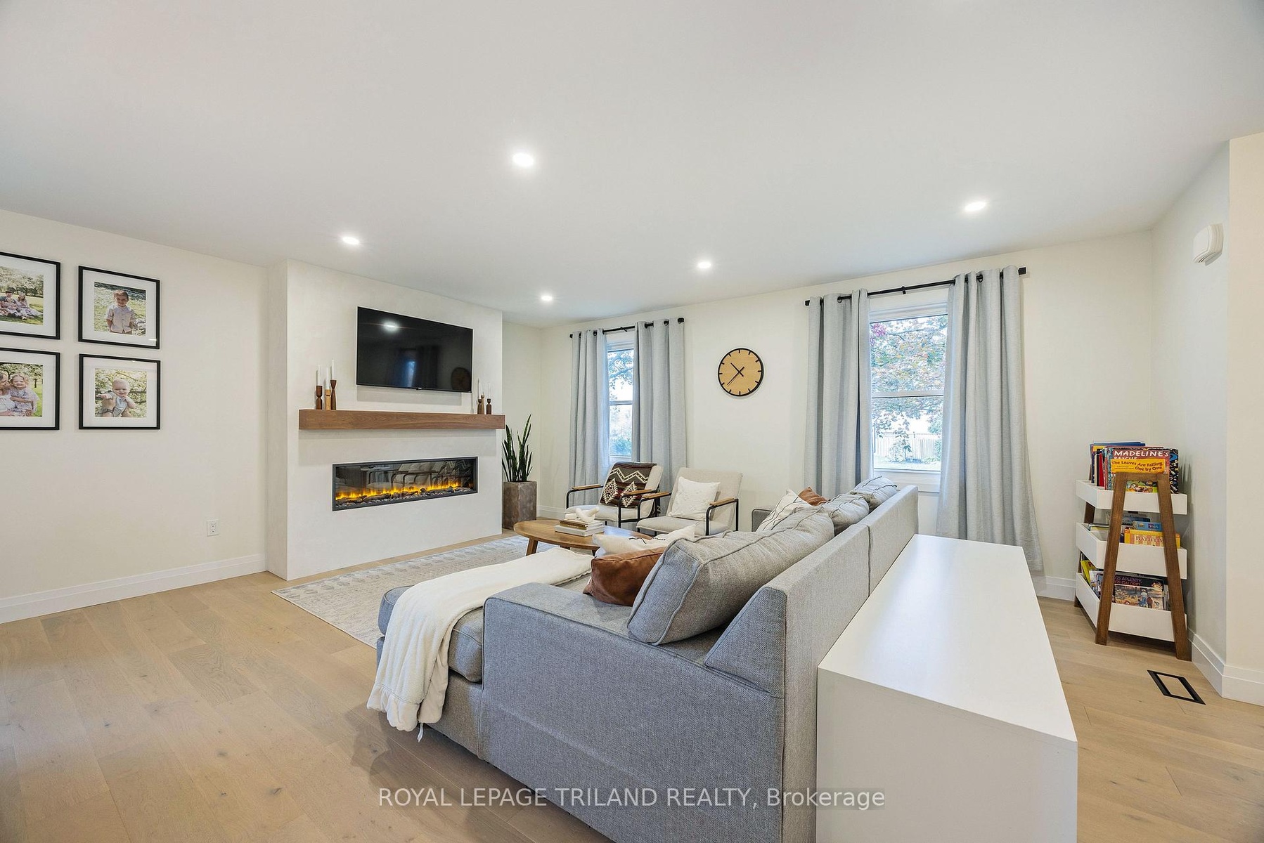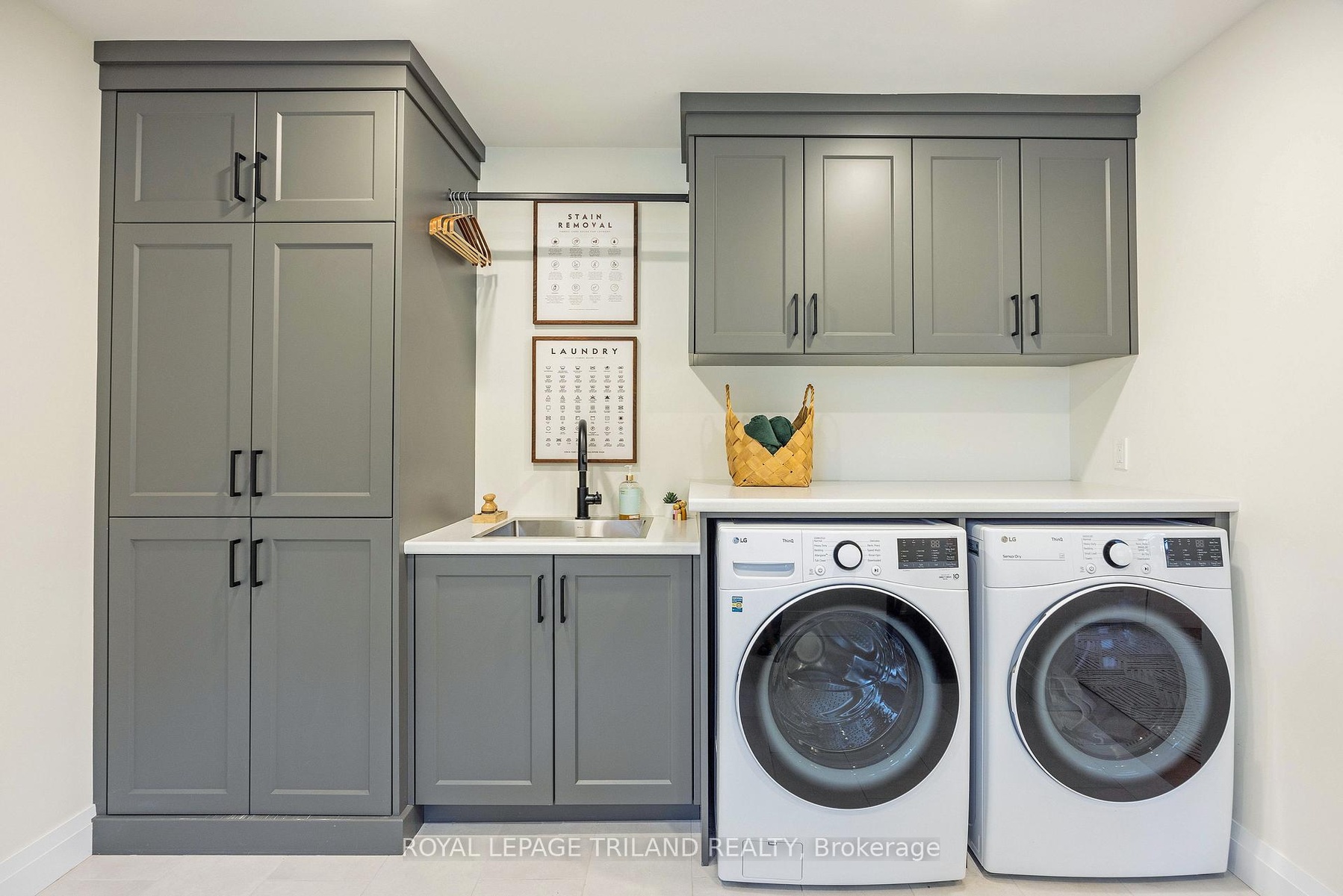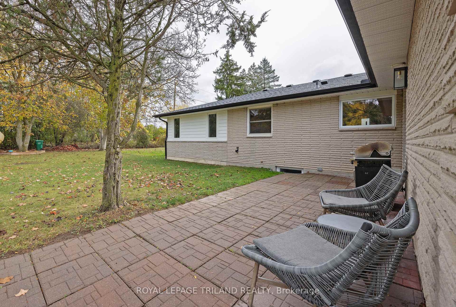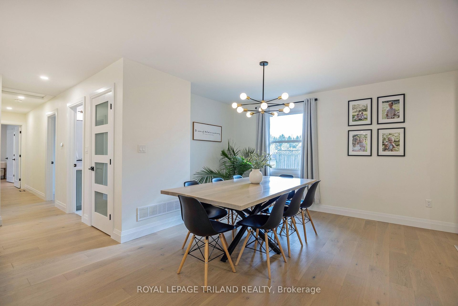 Prepare to be impressed by this beautifully renovated 4-bedroom, 3-bathroom bungalow in the sought-after Old Lynhurst Village! Nestled in a quiet, tree-lined neighbourhood in North St. Thomas (Southwold), this home offers a modern feel with convenient access to Wellington Rd. and Hwy 401. The main level showcases a functional open concept design, engineered white oak hardwood and tile flooring, pot lights & quality finishes. The mudroom/laundry area offers custom cabinetry & sink, included washer/dryer, and garage access. The inviting living room features an electric fireplace with a decorative beam, while the stunning GCW kitchen boasts quartz countertops & island, a walk-in pantry, backsplash, included appliances, and an undermount sink overlooking the yard. The open concept dining space is great for entertaining and the layout features sliding door access to a patio and the deep, treed backyard. The spacious primary suite addition offers backyard view, upgraded sound-batting, accent feature wall, tray ceiling with potlights & fan, walk-in closet, and a luxurious 5-pc ensuite with quartz double vanity, soaker tub and tiled shower with rain head. Two additional bedrooms feature closets & solid-core entry doors & there's a stunning bathroom with double quartz top vanity, tub/shower & built-in shelving for storage. The fully finished lower level (2025) includes noise-reducing resilient-channel ceilings, a large rec room, bedroom with closet, walk-in storage closet, and a full bathroom with quartz vanity, shower and tiled floors. Extensive updates include shingles, soffits, fascia, eaves, garage door, electrical wiring, plumbing, hot-water recirculation pump, underground service, and a 100-amp panel with 50 amp garage subpanel. Nothing to do but move in!