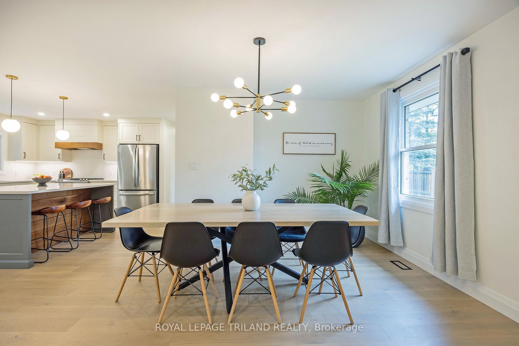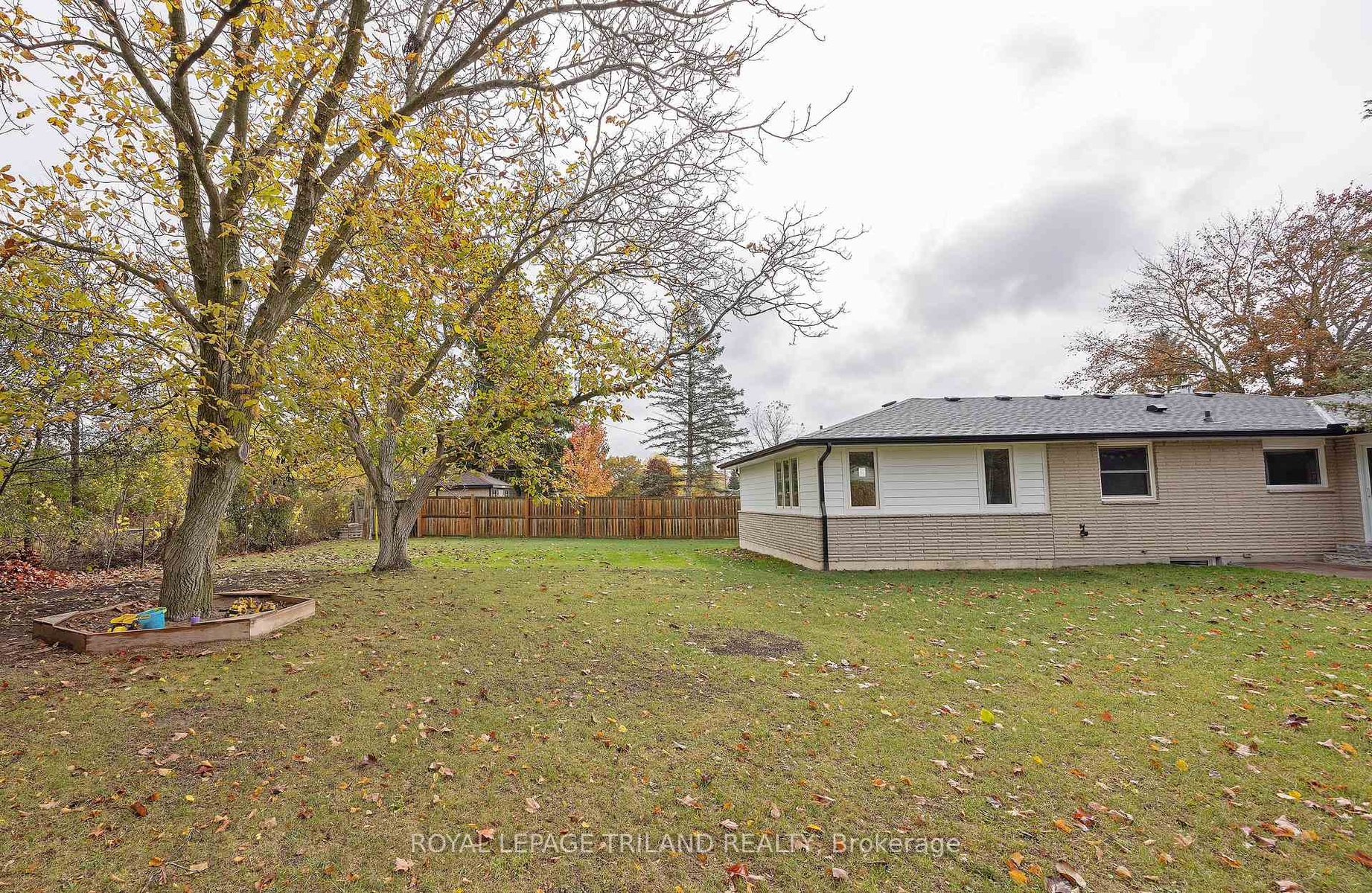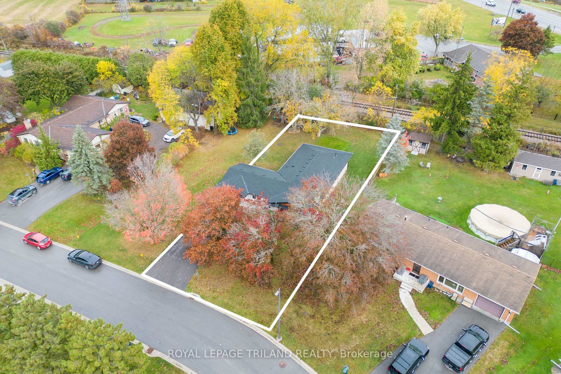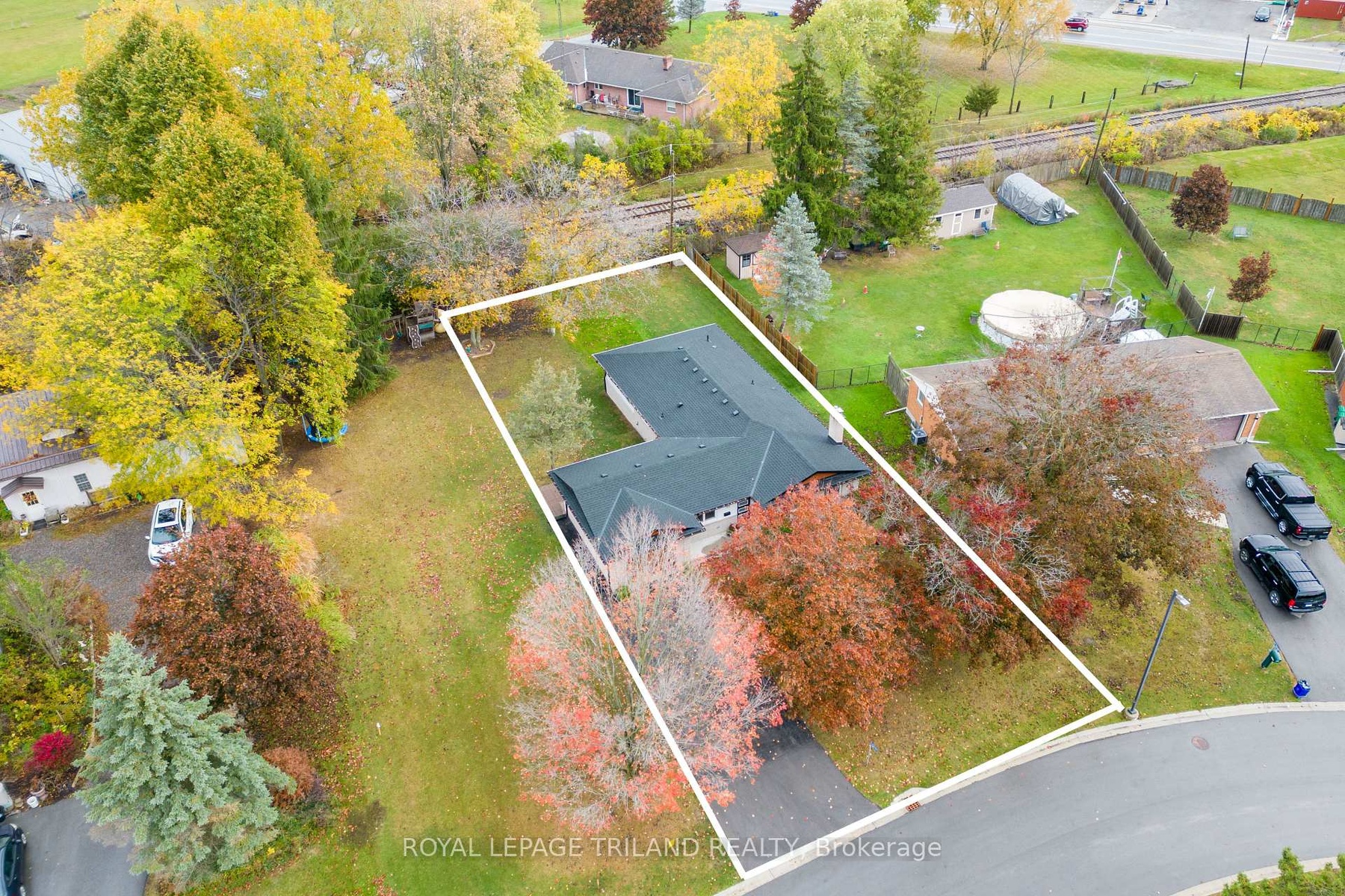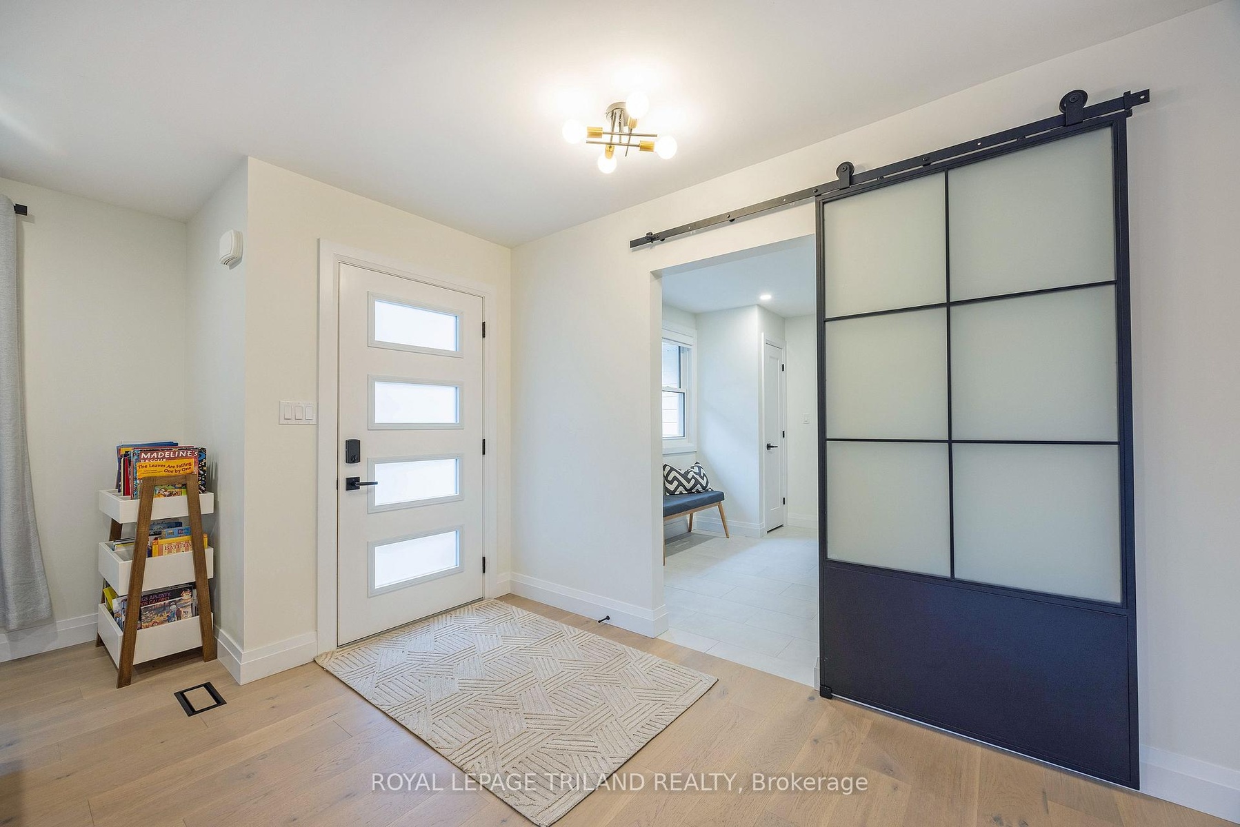Prepare to be impressed by this beautifully renovated 4-bedroom, 3-bathroom bungalow in the sought-after Old Lynhurst Village! Nestled in a quiet, tree-lined neighbourhood in North St. Thomas (Southwold), this home offers a modern feel with convenient access to Wellington Rd. and Hwy 401. The main level showcases a functional open concept design, engineered white oak hardwood and tile flooring, pot lights & quality finishes. The mudroom/laundry area offers custom cabinetry & sink, included washer/dryer, and garage access. The inviting living room features an electric fireplace with a decorative beam, while the stunning GCW kitchen boasts quartz countertops & island, a walk-in pantry, backsplash, included appliances, and an undermount sink overlooking the yard. The open concept dining space is great for entertaining and the layout features sliding door access to a patio and the deep, treed backyard. The spacious primary suite addition offers backyard view, upgraded sound-batting, accent feature wall, tray ceiling with potlights & fan, walk-in closet, and a luxurious 5-pc ensuite with quartz double vanity, soaker tub and tiled shower with rain head. Two additional bedrooms feature closets & solid-core entry doors & there's a stunning bathroom with double quartz top vanity, tub/shower & built-in shelving for storage. The fully finished lower level (2025) includes noise-reducing resilient-channel ceilings, a large rec room, bedroom with closet, walk-in storage closet, and a full bathroom with quartz vanity, shower and tiled floors. Extensive updates include shingles, soffits, fascia, eaves, garage door, electrical wiring, plumbing, hot-water recirculation pump, underground service, and a 100-amp panel with 50 amp garage subpanel. Nothing to do but move in!