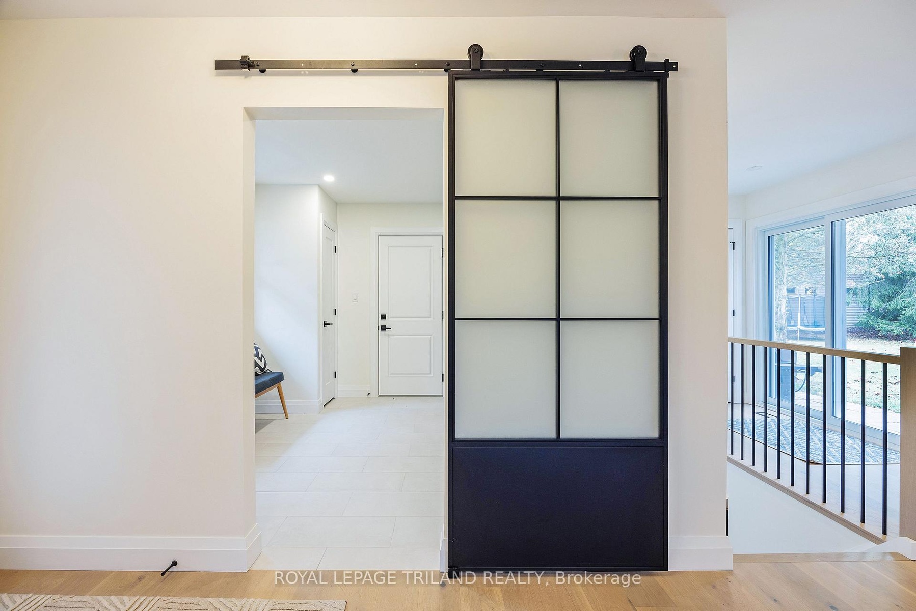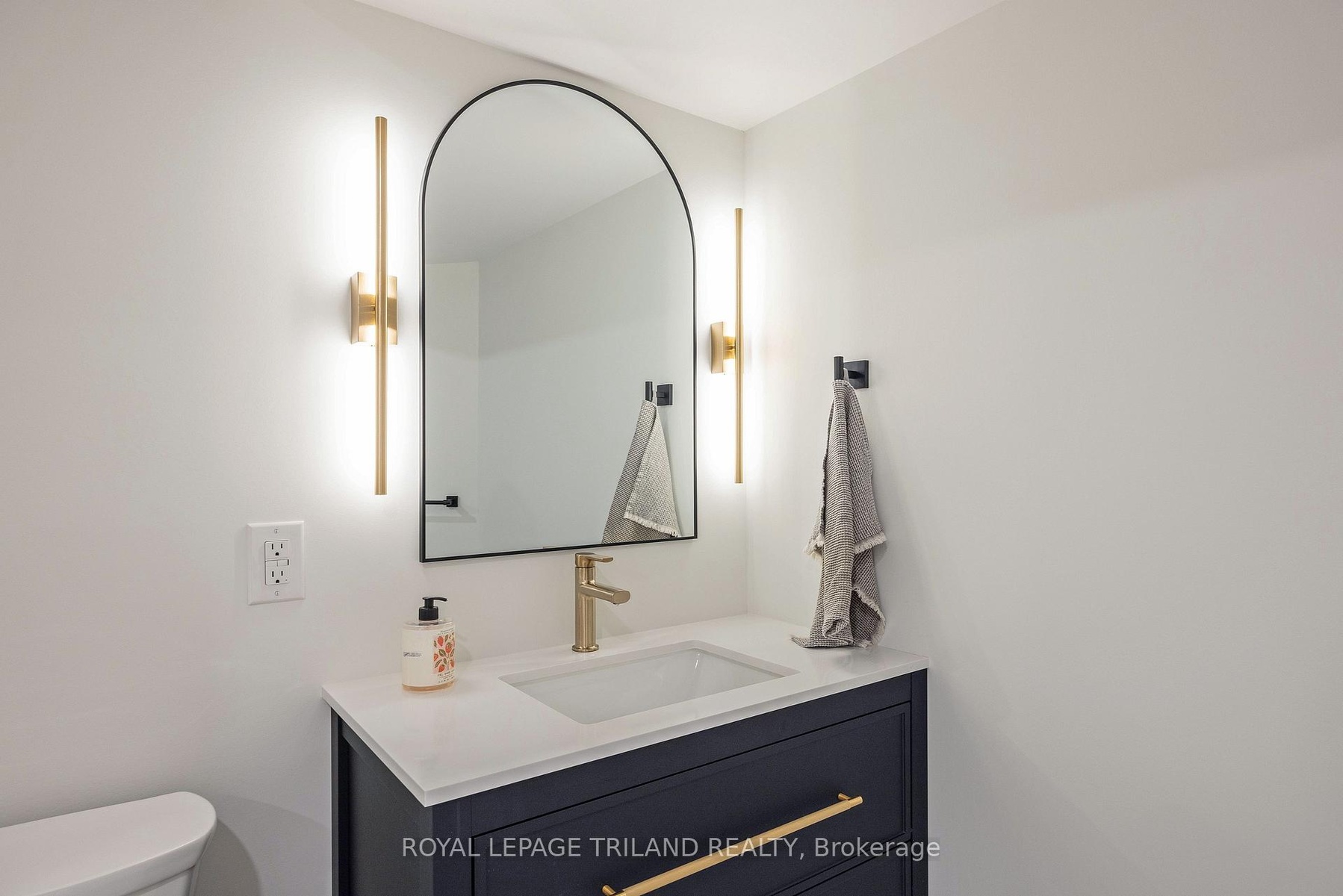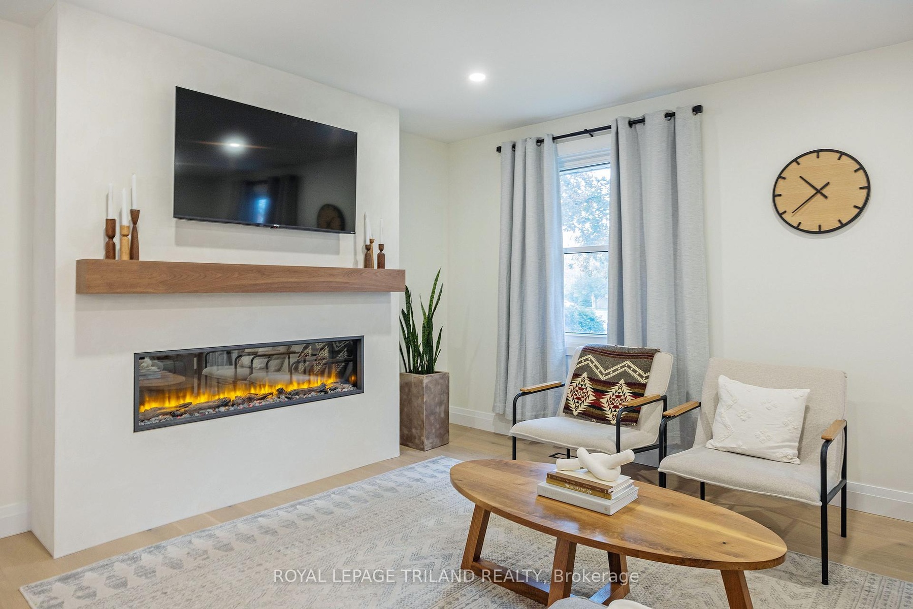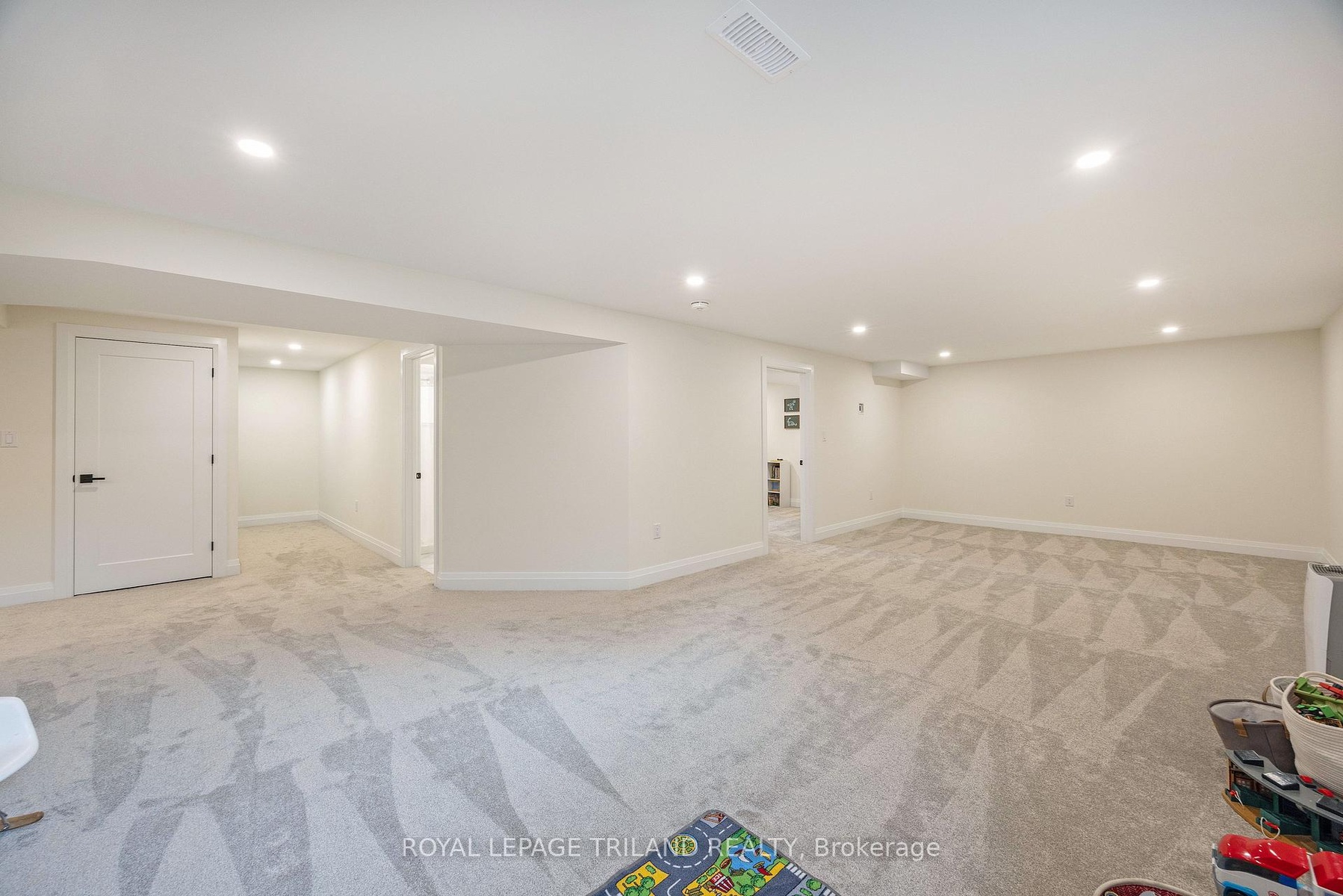 Prepare to be impressed by this beautifully renovated 4-bedroom, 3-bathroom bungalow in the sought-after Old Lynhurst Village! Nestled in a quiet, tree-lined neighbourhood in North St. Thomas (Southwold), this home offers a modern feel with convenient access to Wellington Rd. and Hwy 401. The main level showcases a functional open concept design, engineered white oak hardwood and tile flooring, pot lights & quality finishes. The mudroom/laundry area offers custom cabinetry & sink, included washer/dryer, and garage access. The inviting living room features an electric fireplace with a decorative beam, while the stunning GCW kitchen boasts quartz countertops & island, a walk-in pantry, backsplash, included appliances, and an undermount sink overlooking the yard. The open concept dining space is great for entertaining and the layout features sliding door access to a patio and the deep, treed backyard. The spacious primary suite addition offers backyard view, upgraded sound-batting, accent feature wall, tray ceiling with potlights & fan, walk-in closet, and a luxurious 5-pc ensuite with quartz double vanity, soaker tub and tiled shower with rain head. Two additional bedrooms feature closets & solid-core entry doors & there's a stunning bathroom with double quartz top vanity, tub/shower & built-in shelving for storage. The fully finished lower level (2025) includes noise-reducing resilient-channel ceilings, a large rec room, bedroom with closet, walk-in storage closet, and a full bathroom with quartz vanity, shower and tiled floors. Extensive updates include shingles, soffits, fascia, eaves, garage door, electrical wiring, plumbing, hot-water recirculation pump, underground service, and a 100-amp panel with 50 amp garage subpanel. Nothing to do but move in!