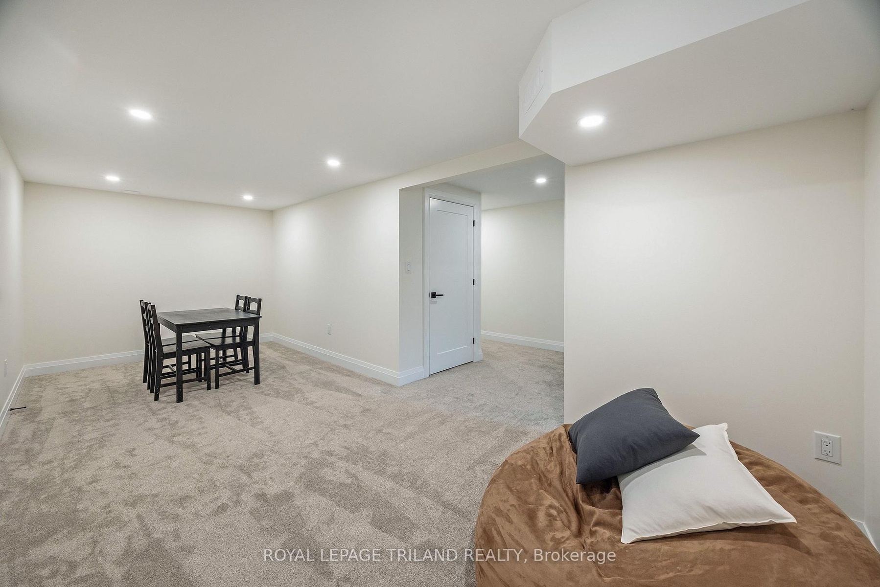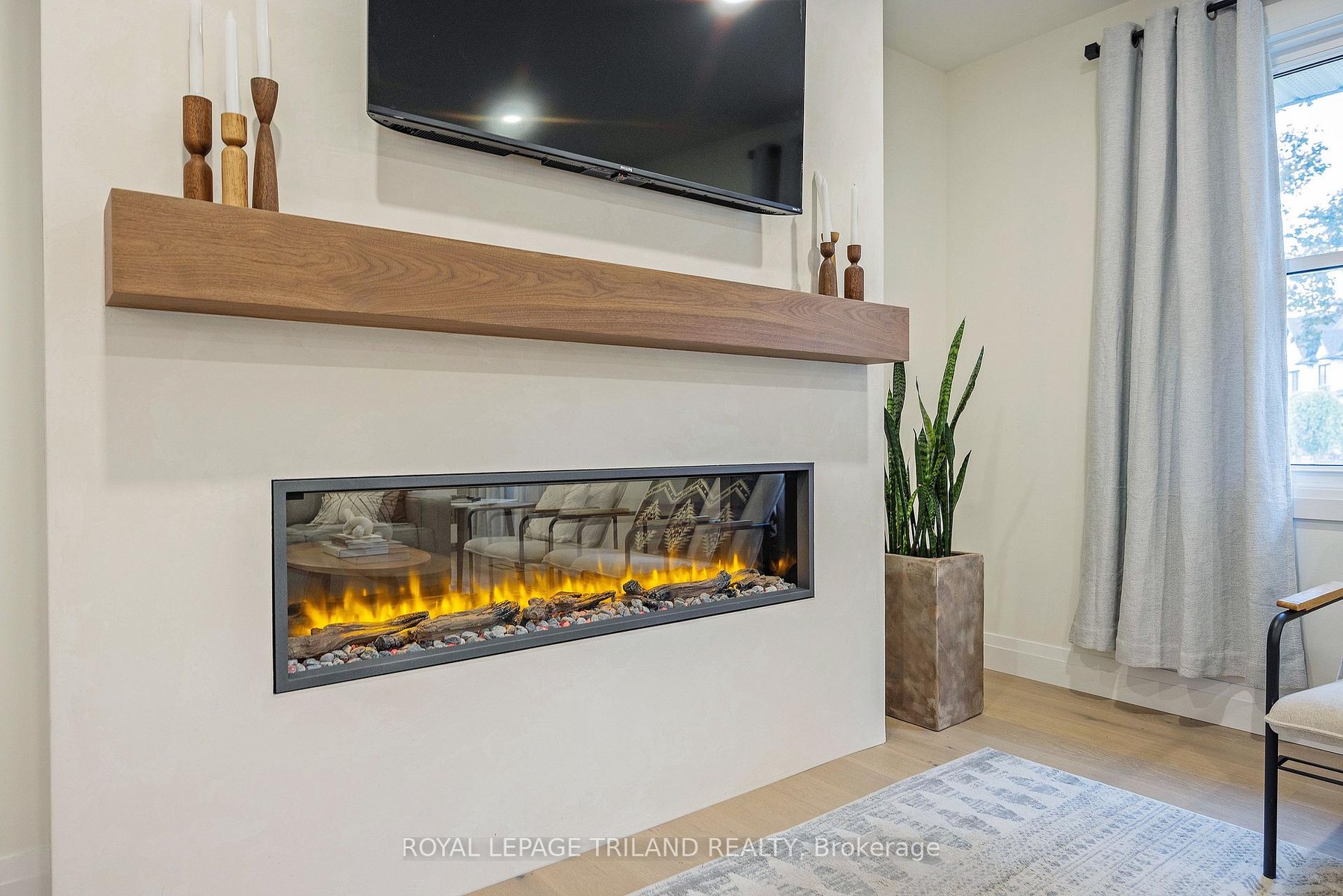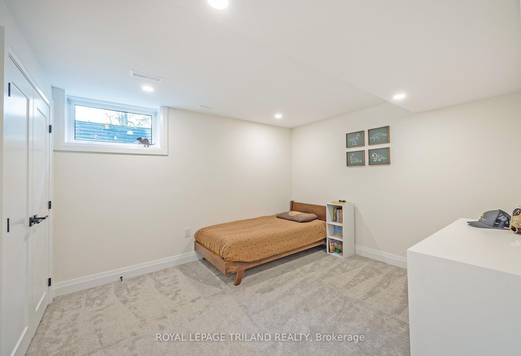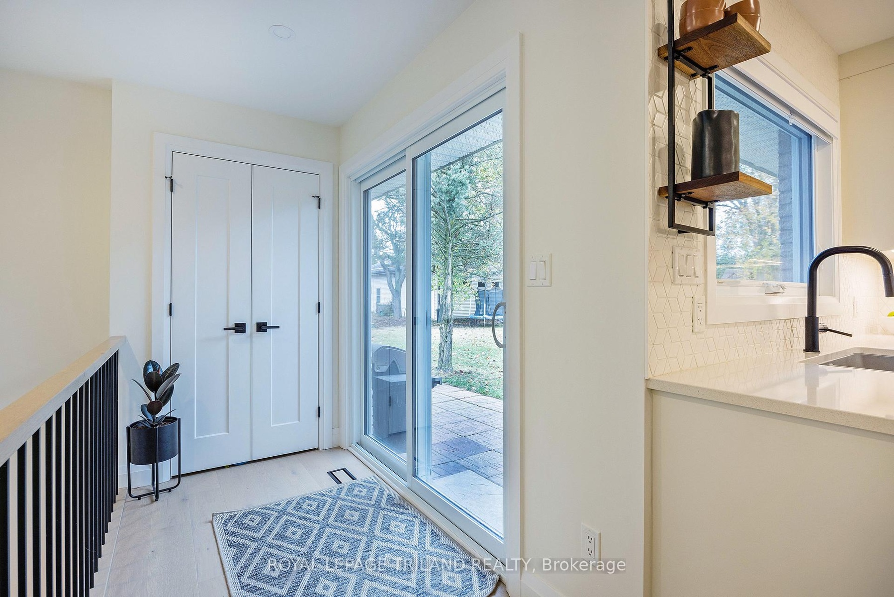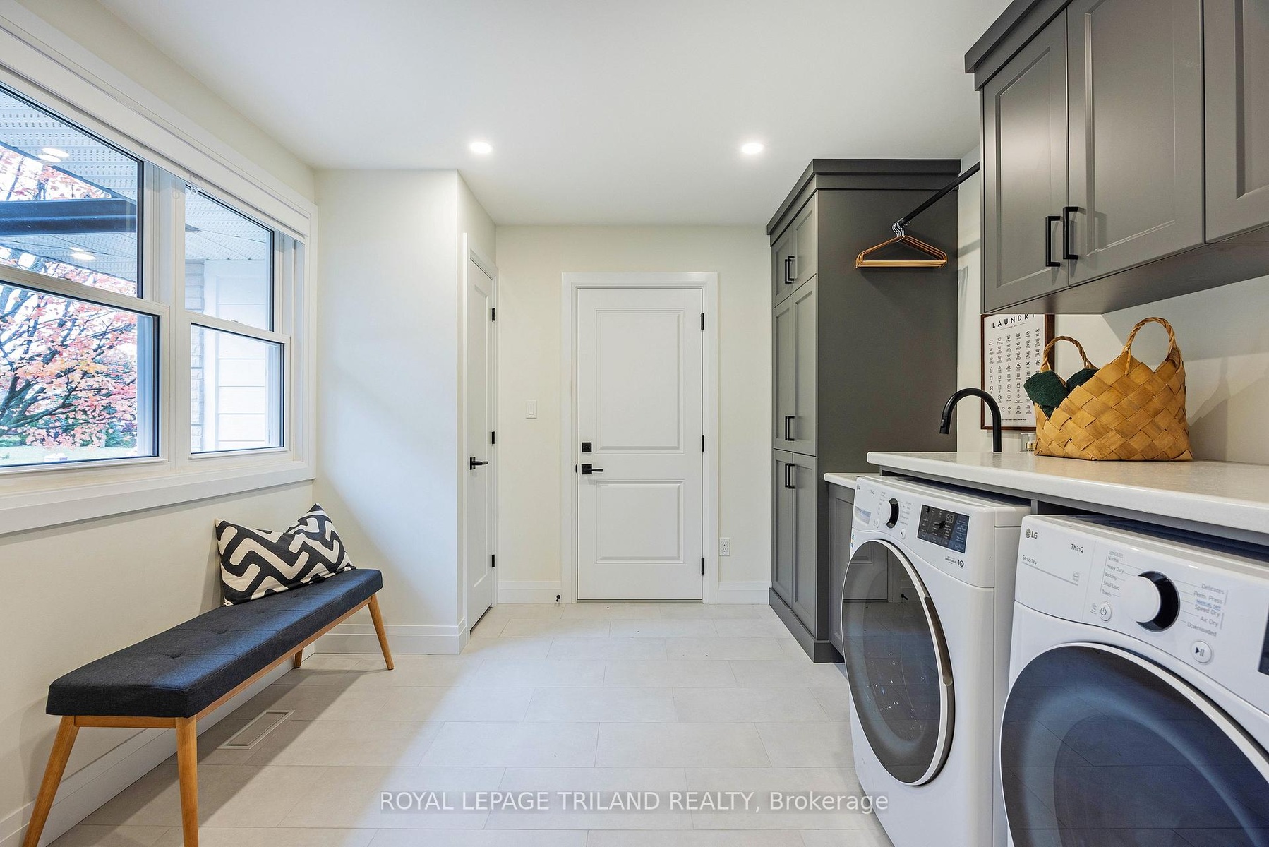 Prepare to be impressed by this beautifully renovated 4-bedroom, 3-bathroom bungalow in the sought-after Old Lynhurst Village! Nestled in a quiet, tree-lined neighbourhood in North St. Thomas (Southwold), this home offers a modern feel with convenient access to Wellington Rd. and Hwy 401. The main level showcases a functional open concept design, engineered white oak hardwood and tile flooring, pot lights & quality finishes. The mudroom/laundry area offers custom cabinetry & sink, included washer/dryer, and garage access. The inviting living room features an electric fireplace with a decorative beam, while the stunning GCW kitchen boasts quartz countertops & island, a walk-in pantry, backsplash, included appliances, and an undermount sink overlooking the yard. The open concept dining space is great for entertaining and the layout features sliding door access to a patio and the deep, treed backyard. The spacious primary suite addition offers backyard view, upgraded sound-batting, accent feature wall, tray ceiling with potlights & fan, walk-in closet, and a luxurious 5-pc ensuite with quartz double vanity, soaker tub and tiled shower with rain head. Two additional bedrooms feature closets & solid-core entry doors & there's a stunning bathroom with double quartz top vanity, tub/shower & built-in shelving for storage. The fully finished lower level (2025) includes noise-reducing resilient-channel ceilings, a large rec room, bedroom with closet, walk-in storage closet, and a full bathroom with quartz vanity, shower and tiled floors. Extensive updates include shingles, soffits, fascia, eaves, garage door, electrical wiring, plumbing, hot-water recirculation pump, underground service, and a 100-amp panel with 50 amp garage subpanel. Nothing to do but move in!