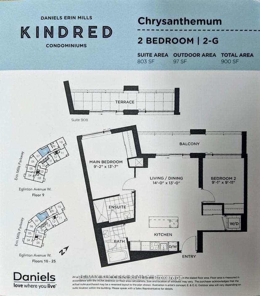 Welcome to Daniels Kindred Condos, where luxury, comfort, and convenience meet in the heart of Central Erin Mills. This spacious 900 SqFt, 2 Bedroom, 2 Full Bathroom suite offers an open-concept layout with 9' ceilings, expansive windows, and premium finishes that fill the home with natural light. The modern kitchen is equipped with stainless steel appliances, quartz countertops, backsplash, and a breakfast bar, seamlessly blending style and functionality.Enjoy the perfect balance of indoor and outdoor living with a private balcony, ideal for morning coffee or evening relaxation while taking in serene views. Both bedrooms are generously sized with large closets, while the bathrooms feature upgraded fixtures and finishes. Additional conveniences include in-suite laundry, digital thermostat control for heating and cooling, and a dedicated storage locker.Residents enjoy world-class building amenities, including a 24-hour concierge, fitness centre, yoga studio, co-working space, games room, party room, outdoor terrace with BBQs, childrens playground, and pet spa.Live steps away from Erin Mills Town Centre, Credit Valley Hospital, top-rated schools, parks, UTM, and Sheridan College, with easy access to Highways 403, 407, QEW, and Streetsville GO Station for seamless commuting.This is your opportunity to lease a premium residence in one of Mississaugas most desirable and family-friendly communitieswhere vibrant city living meets peaceful retreat.
