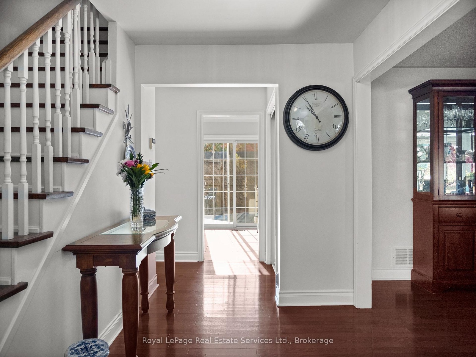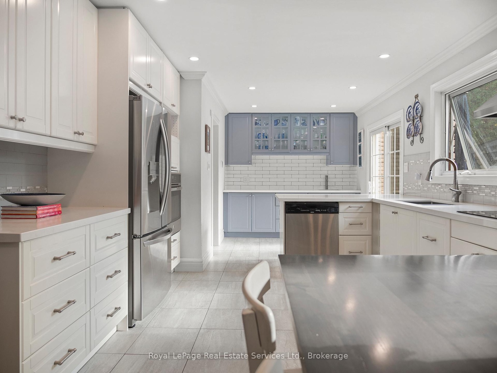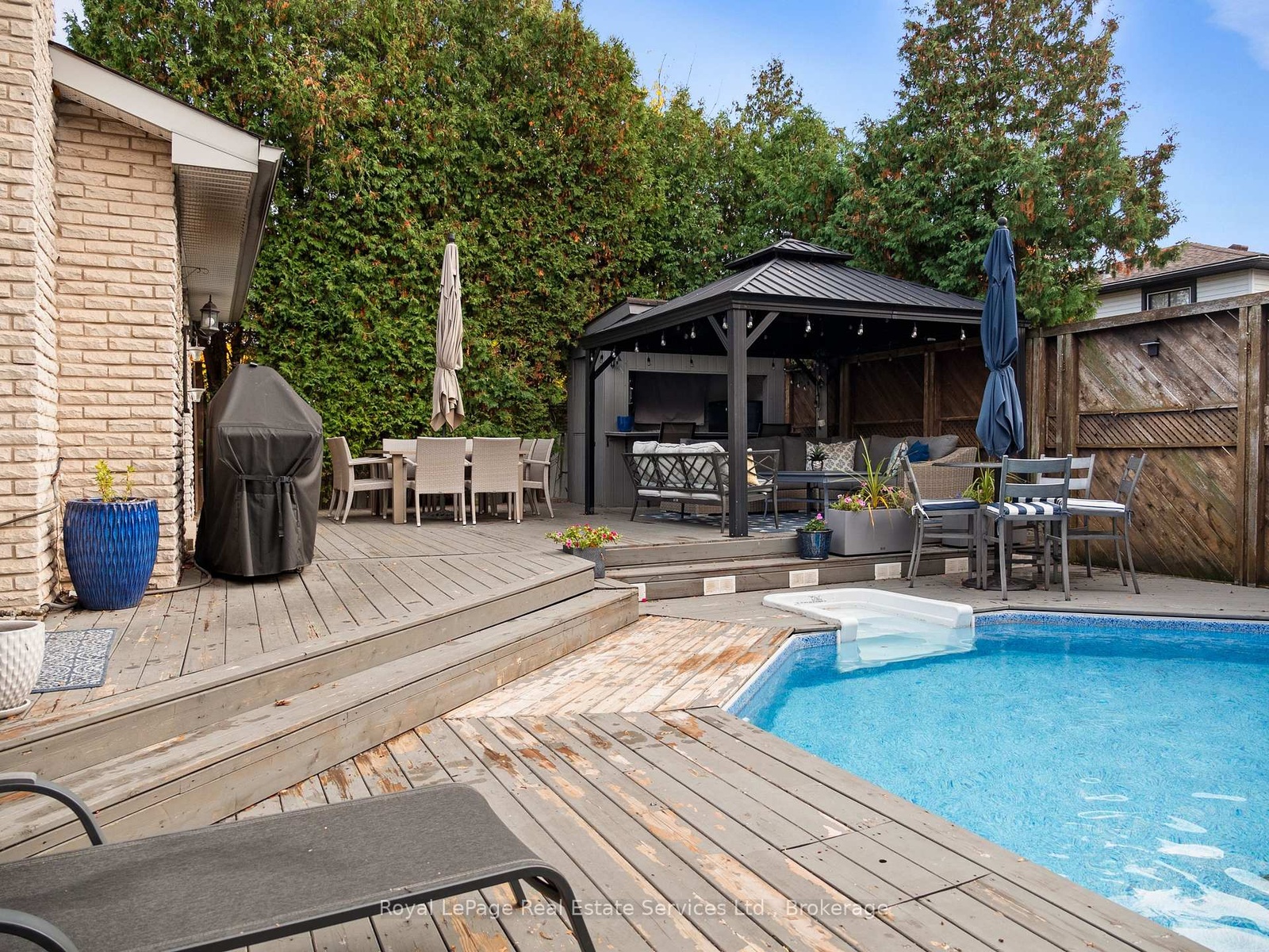 Welcome to 2480 Waterford Street in West Oakville. An updated 2 Storey Family home situated in an alcove on a quiet street. A covered porch leads to the custom front door entry and the spacious foyer. To the right is the Living/Dining Room and straight ahead the completely renovated Kitchen with many built ins, double sink and an additional single sink, bright windows and large eating area. The main floor Family Room features a gas fireplace and a walkout to the aboveground pool (half buried). The pool is surrounded by a two tiered deck and has a built in bar for entertaining. The Primary Bedroom is on the second floor with hardwood flooring and a 2 piece ensuite. There are two more bedrooms on the second floor and a renovated 4 piece Bathroom. Down to the basement where you will find a spacious Recreation Room and two additional Bedrooms (one could easily be used as a games room) as well as a 3 piece bathroom and wet/dry Sauna (as is) with cedar walls.