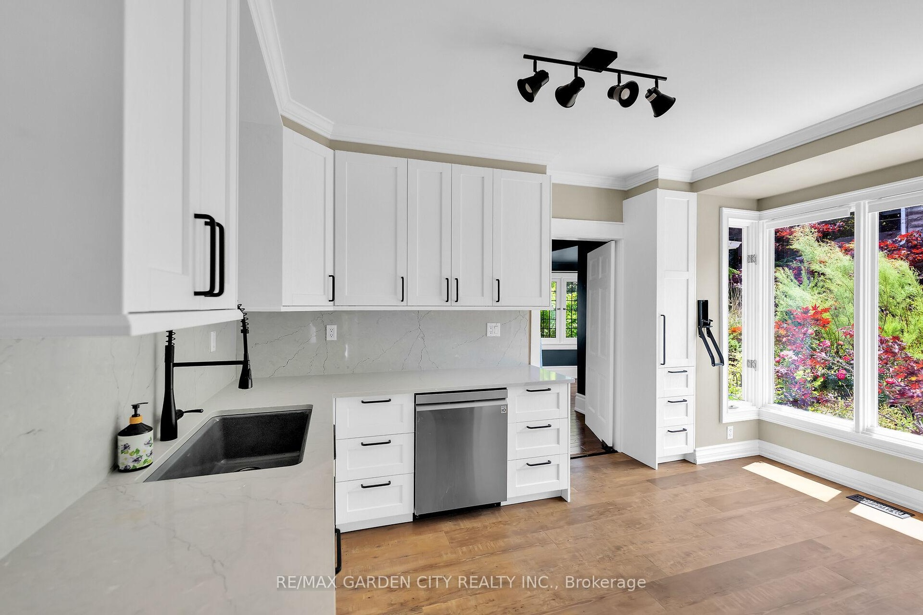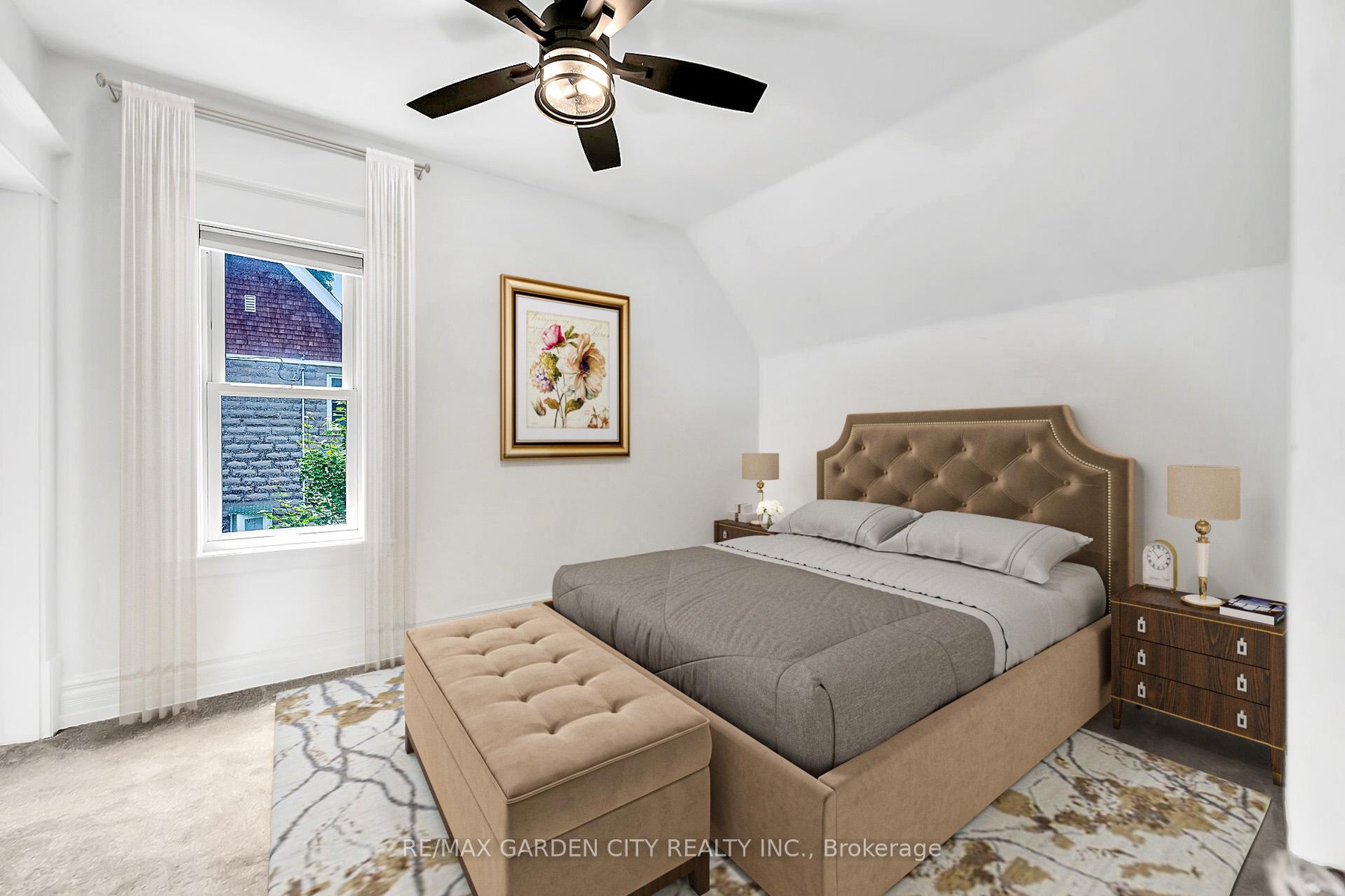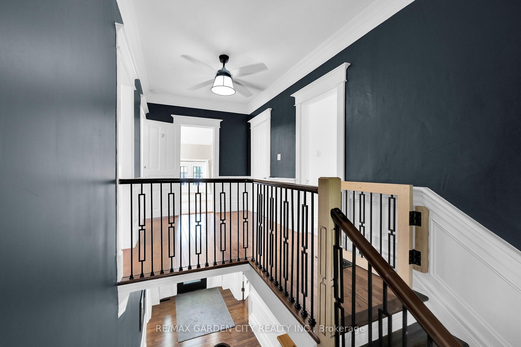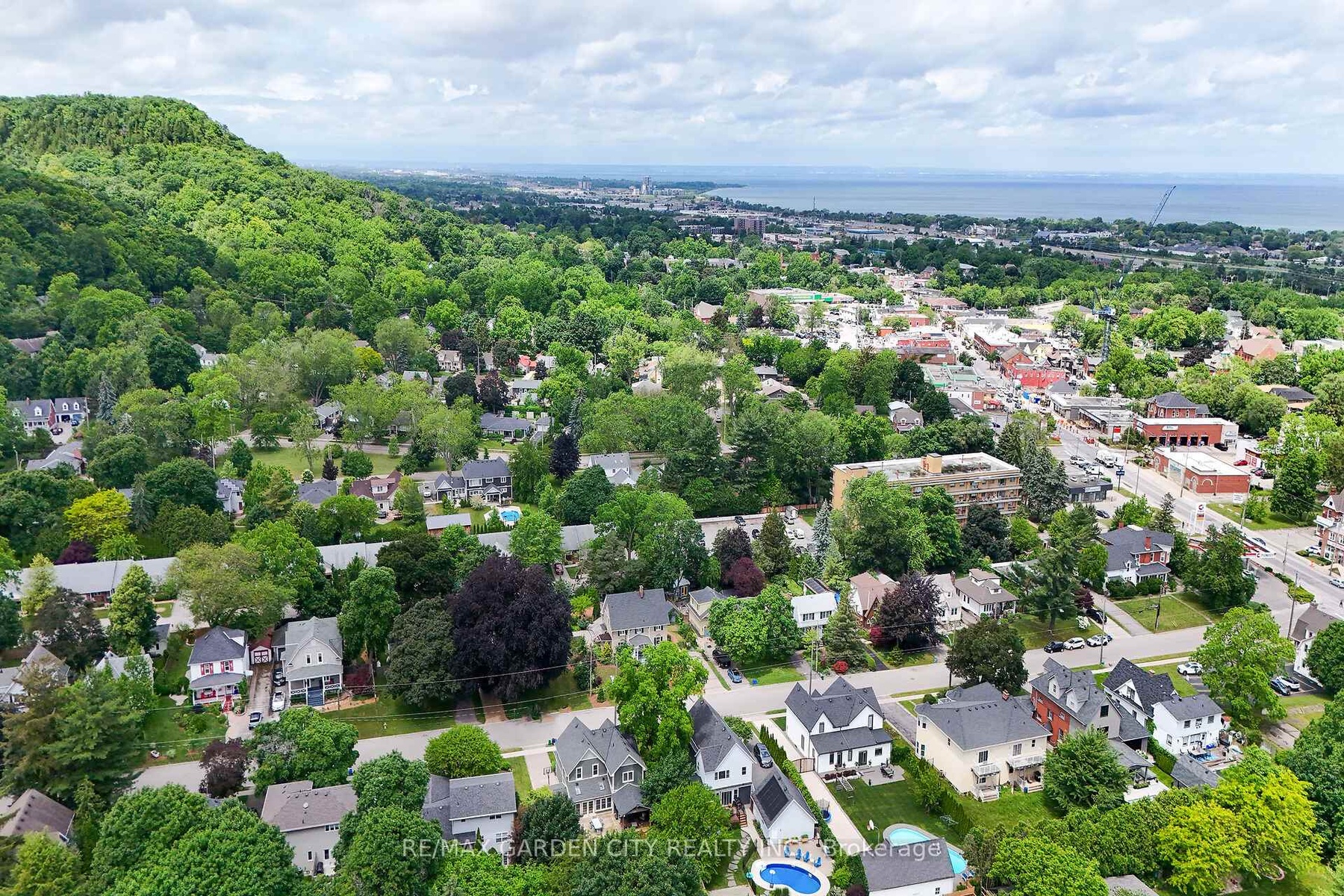 STATELY 2 1/2 STORY GEORGIAN STYLE DESIGNATED HISTORICAL HOME. Built in 1905, known as the Helen Gibson House. Located on large property in the heart of the downtown core on quiet tree-lined street below the escarpment among other character homes. Beautifully updated throughout! The front of this home is graced by the impressive neo-classical vaulted portico with pillars. Spacious foyer opens to large family room with newly installed wood burning fireplace insert in 2023 and oversized leaded glass bay window to bring in the light. Formal dining room with leaded glass windows overlooking the gardens. New kitchen installed in 2023. Main floor laundry, 2PC bath, main floor den/office with wall-to-wall bookcases. Double sliding doors lead to deck, patios & backyard oasis complete with pool & gazebo. Open staircase to upper-level leads to primary bedroom with walk-in closet & ensuite bath. Two additional bedrooms & bath. Second staircase leads to attic (764 square foot space) great potential to create extra living space. OTHER FEATURES INCLUDE: hardwood floors, new roof shingles 2018, new above ground pool 2024, new hot tub 2024, stainless steel appliances in kitchen, washer/dryer, 2 1/2 baths, 200 amp service. Heat pump, A/C & new on-demand water heater (owned) 2023. Long interlock double driveway (fits 4 cars), EV charger, walkway & patios. Two garden sheds. Perfectly situated a block from the downtown core and a short stroll to the Bruce trail & park. This heritage home is surrounded by its award-winning gardens. Calling all historians: It will take only one visit for you to fall in love with this rare offering!