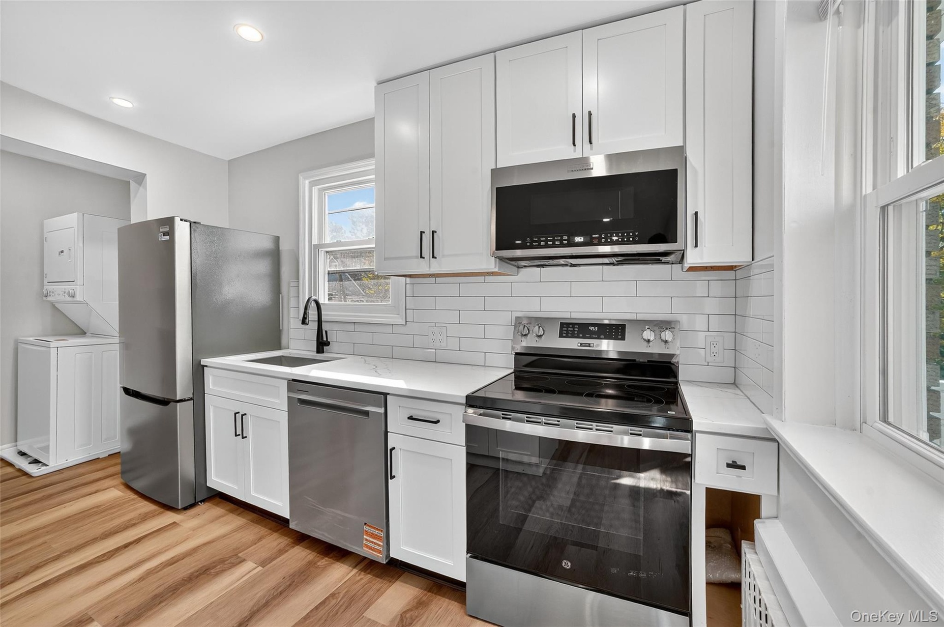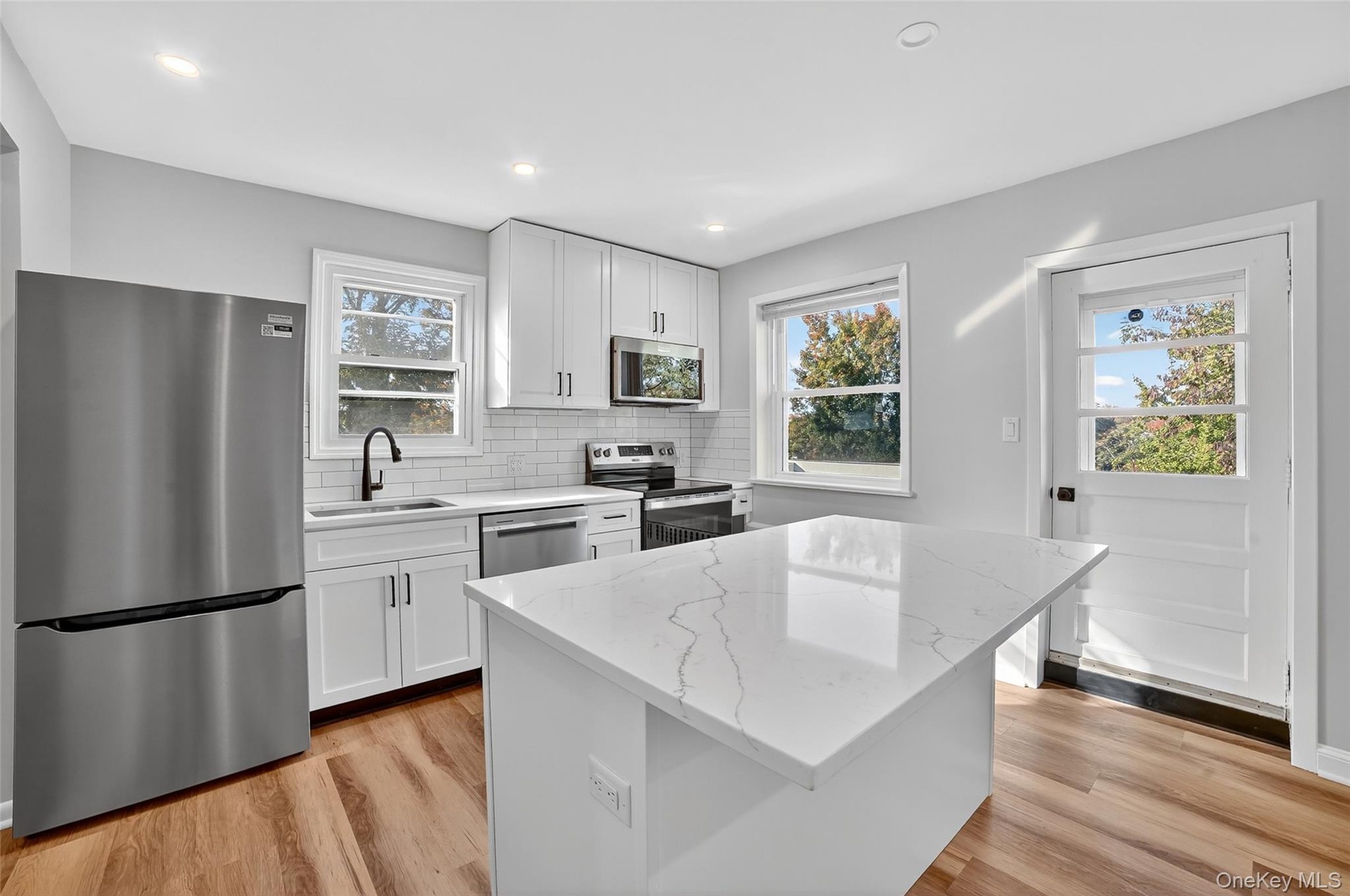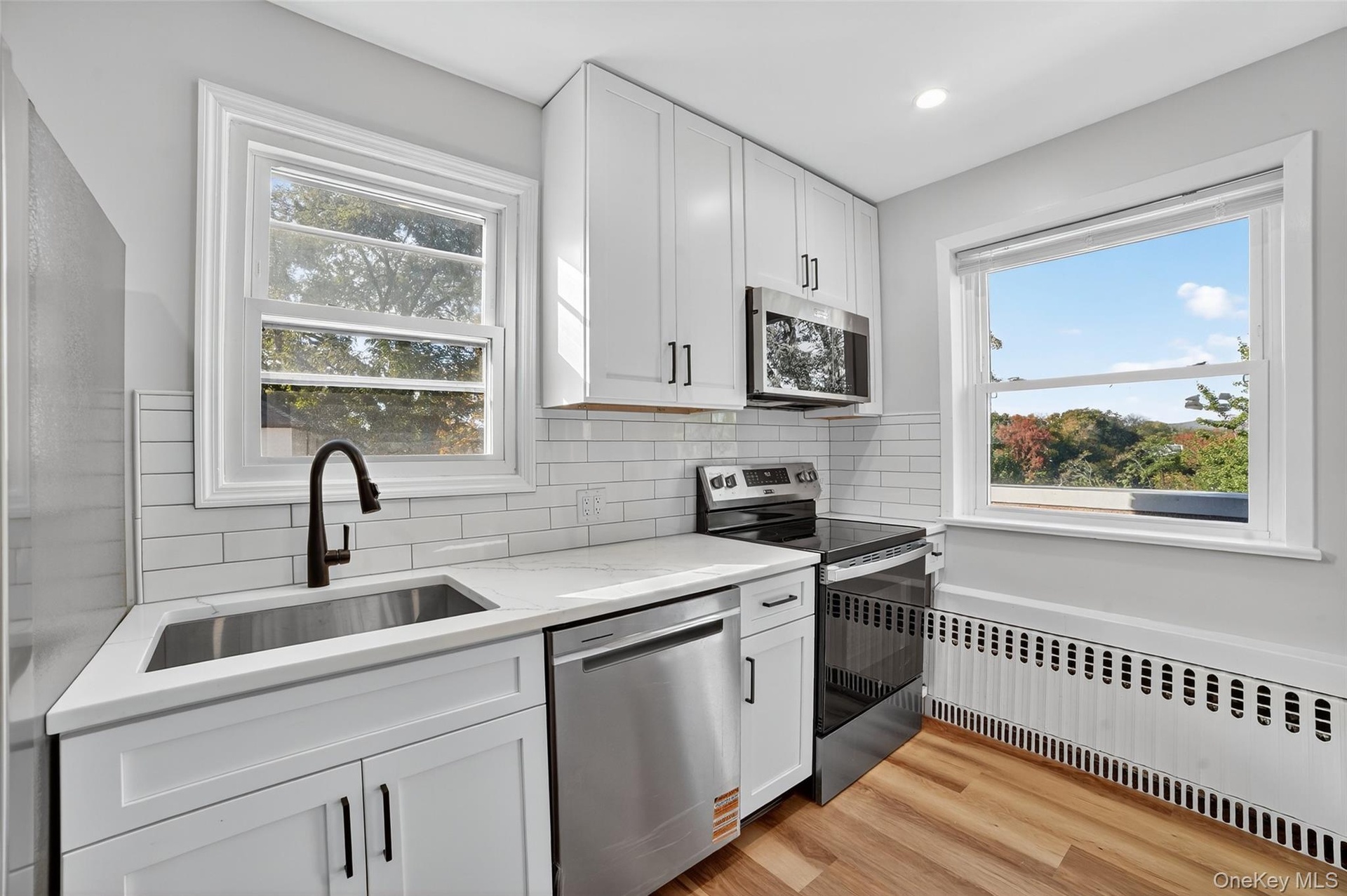 Sunny 3 bedroom, 2 full bath rental in prime location in Webber Park/Sleepy Hollow, on second floor of a multifamily, with desirable renovations and excellent floor plan. All rooms are on one level, accessed through your private entrance up a set of exterior stairs. This lovely unit features a newly updated, attractive open kitchen with new stainless steel appliances, cabinets, countertops, fixtures -- all brand new! Note the large center island, an adjacent pantry and in-unit washer and dryer, and a spacious, bright dining area that makes meal prep easy and mealtimes enjoyable! There's a full length terrace off the kitchen, with west-facing views and delightful vistas of rooftops and trees. The living room and primary bedroom are large and sunlit, and are located on one end of the unit. The other two bedrooms are off the center hallway. New windows for breezy afternoons and good winter insulation. New flooring including hard wood in the living room and main bedroom, new carpet in the hallways and other bedrooms, luxury vinyl tile in the kitchen, and tiles on the terrace. Updated bath fixtures and sinks, as well as new lighting, dimmer switches, water heater and furnace. Lots of closets to help keep things organized. Rental comes with parking for one car in a common parking area, adjacent to the driveway. Live the quintessential Rivertowns lifestyle, enjoying the opportunity to walk to the Croton Aqueduct Path, or to Beekman Avenue and its many stores and restaurants, or simply stroll the waterfront. Just minutes from DeCicco's, the Tarrytown Music Hall, schools and parks. Hurry, this one won't last.