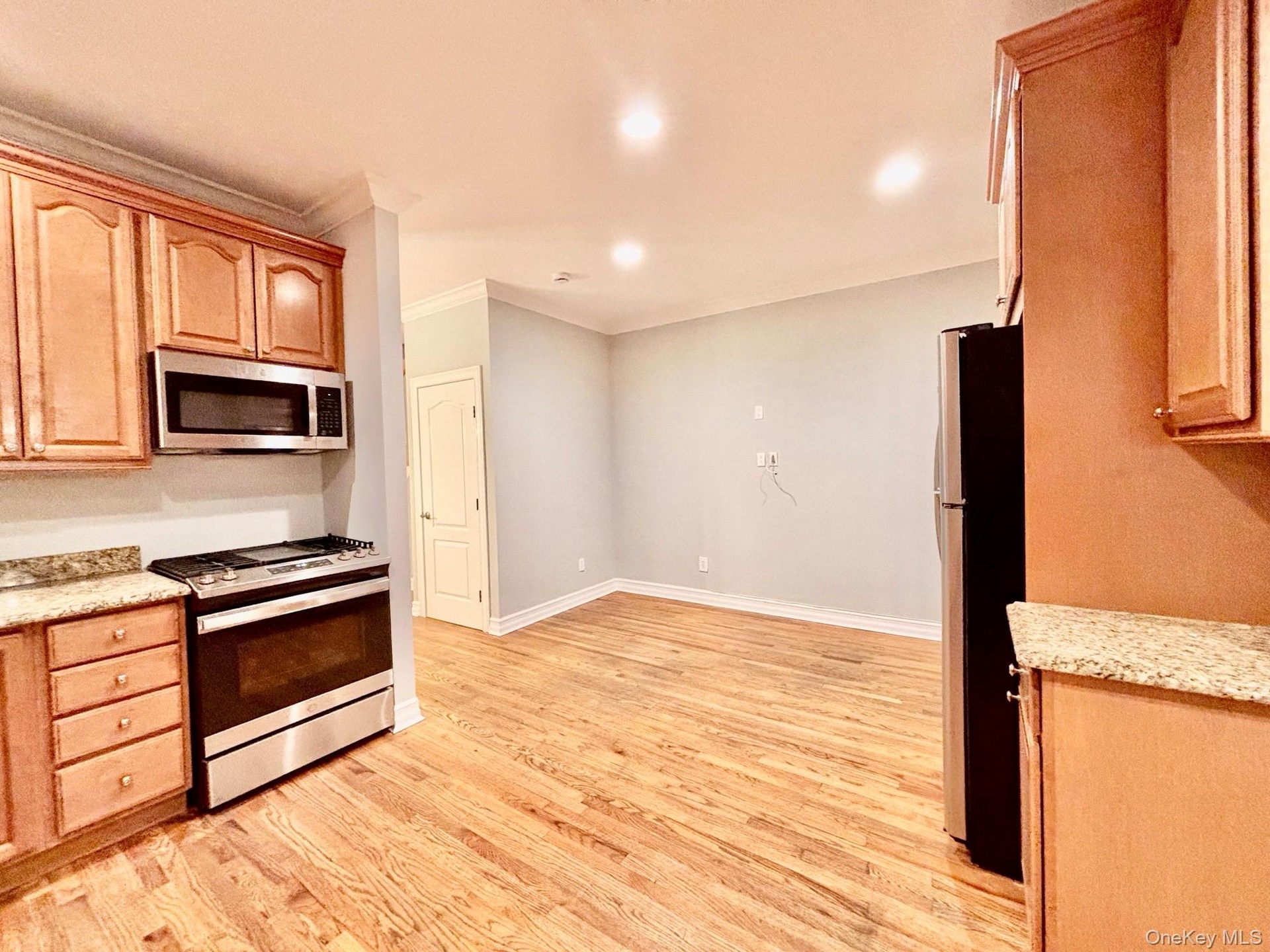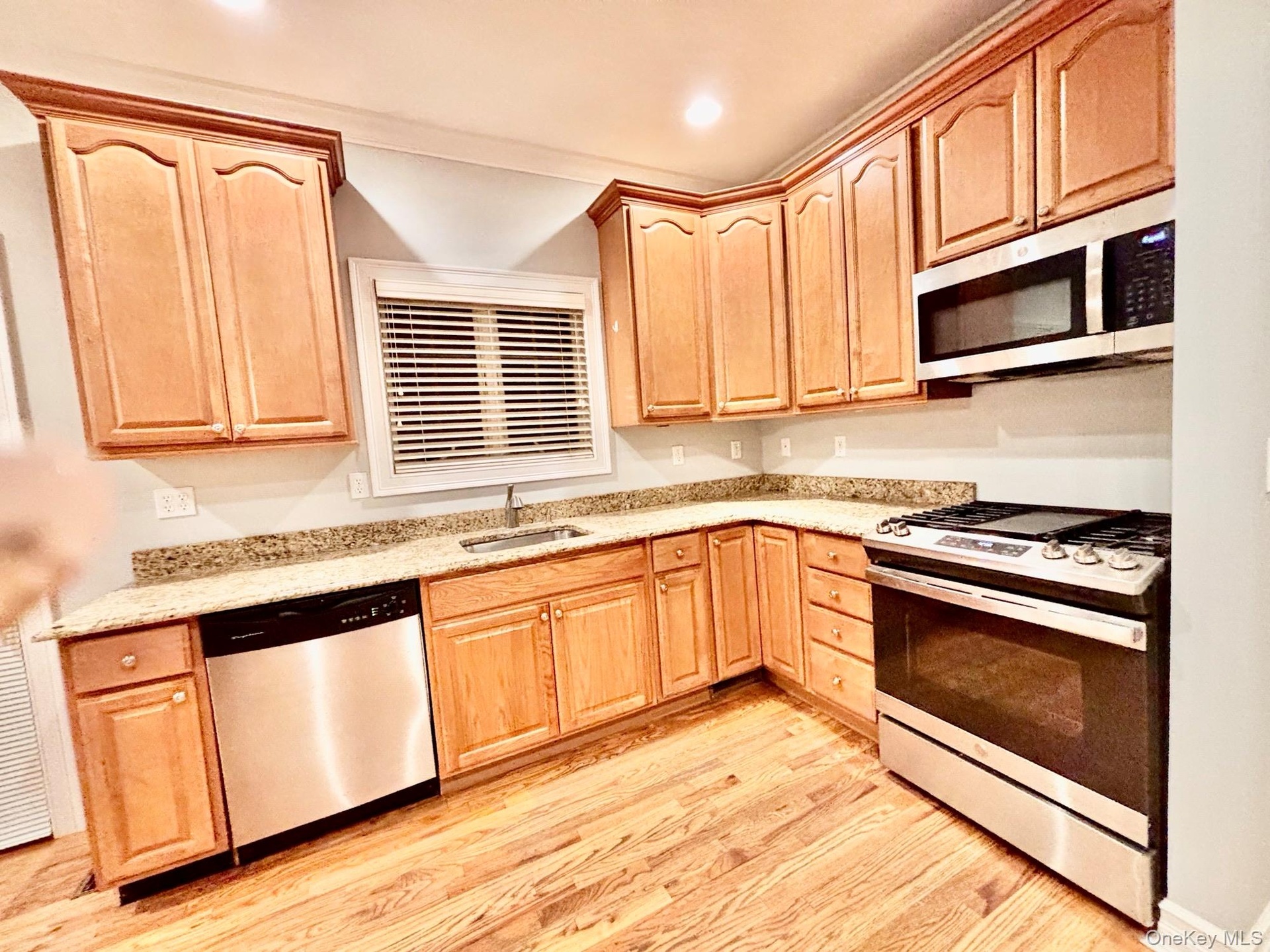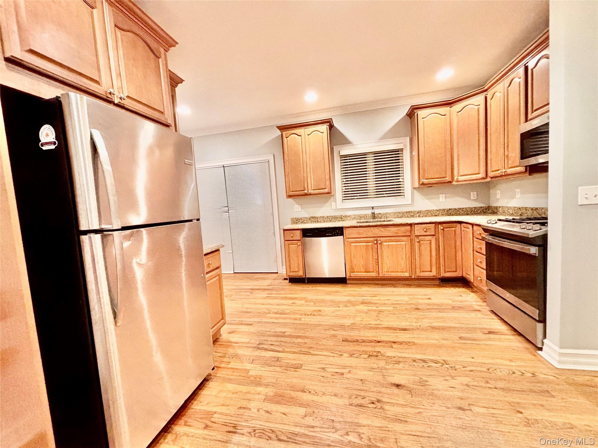 - Kitchen with stainless steel appliances, light wood-style flooring, and recessed lighting
