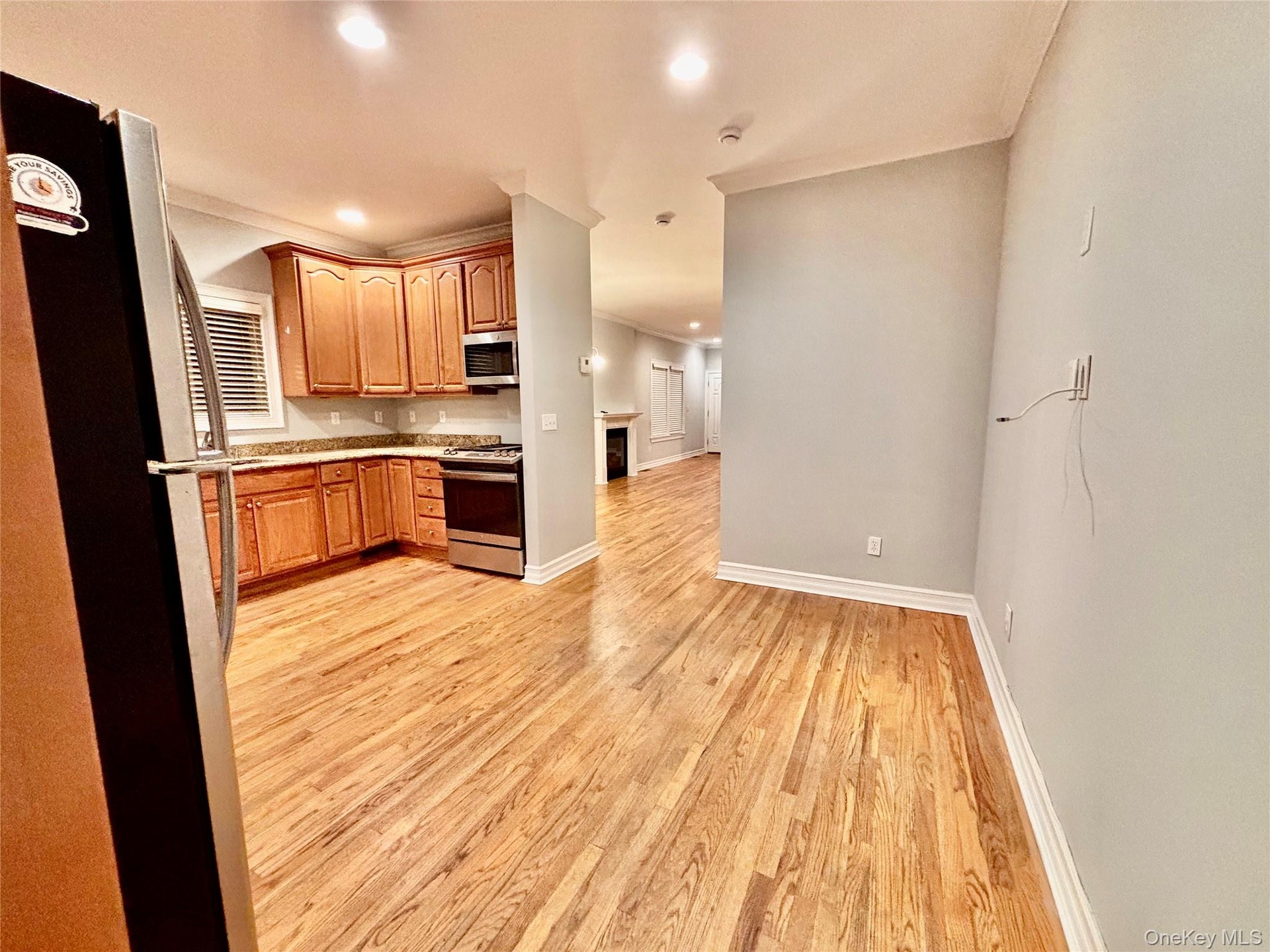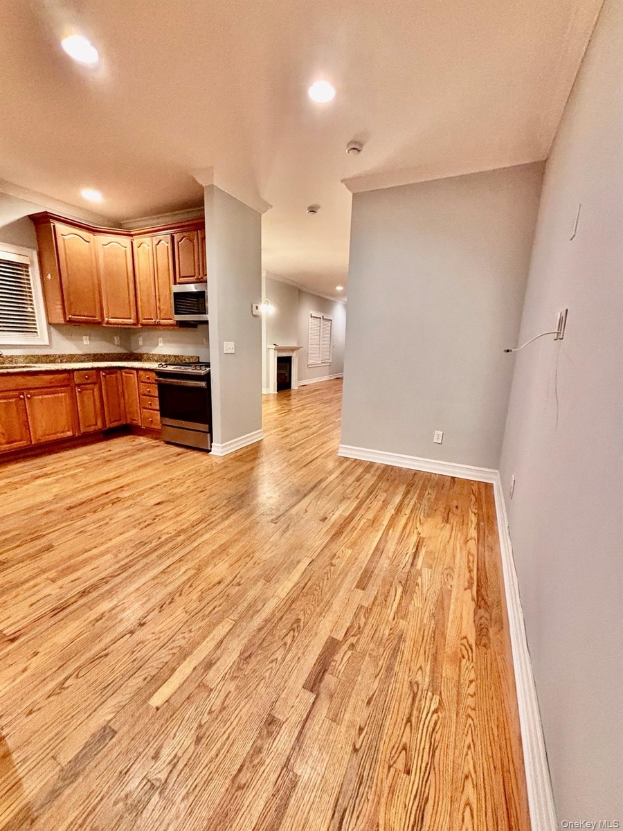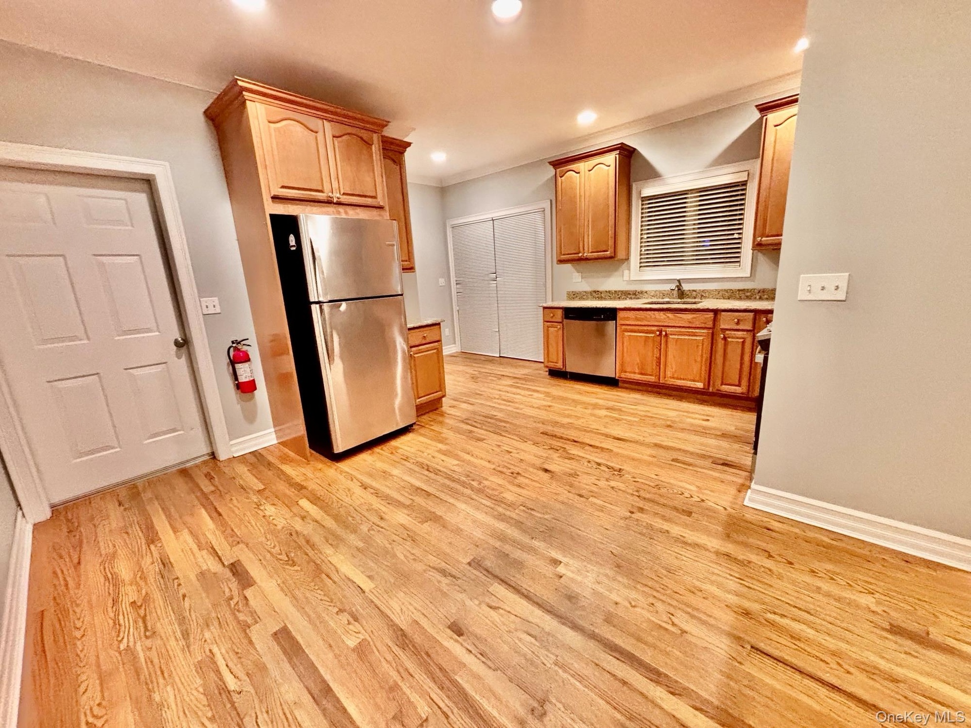 - Kitchen with stainless steel appliances, light wood-style flooring, and recessed lighting