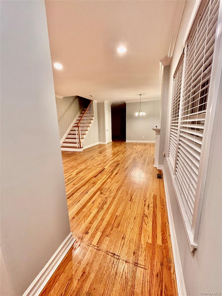 - Hallway with light wood-style flooring, stairs, a chandelier, and recessed lighting