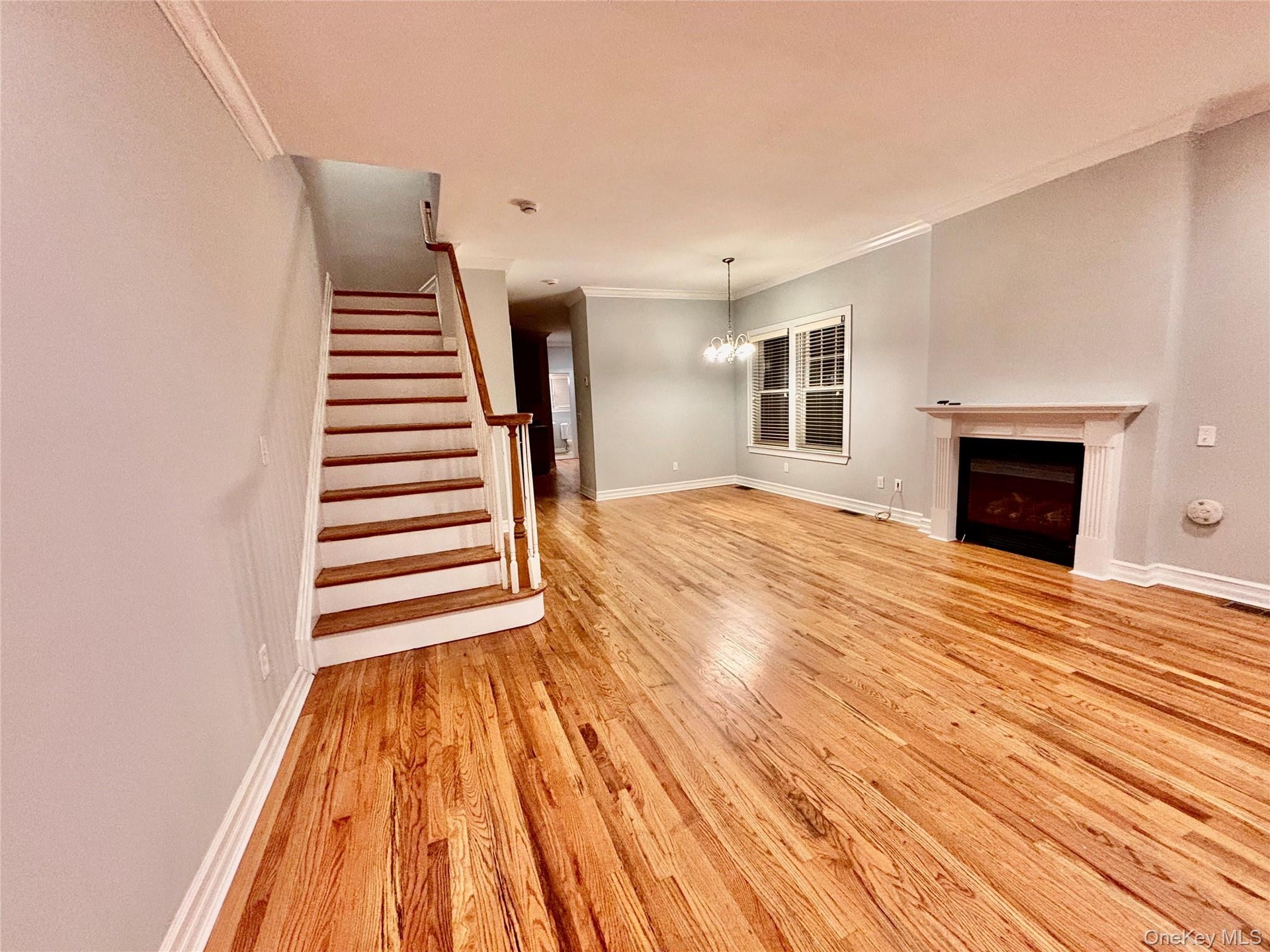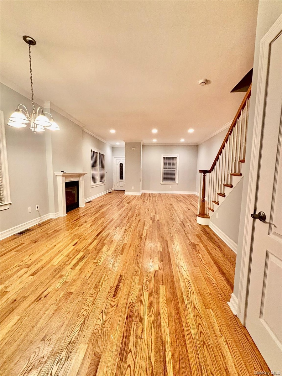 - Unfurnished living room with a fireplace, a chandelier, stairs, light wood-type flooring, and crown molding