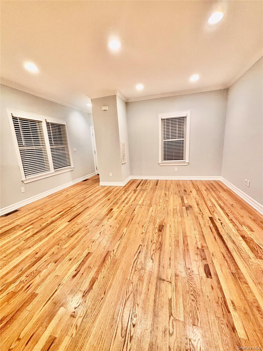 - Empty room featuring light wood-style flooring, recessed lighting, and crown molding